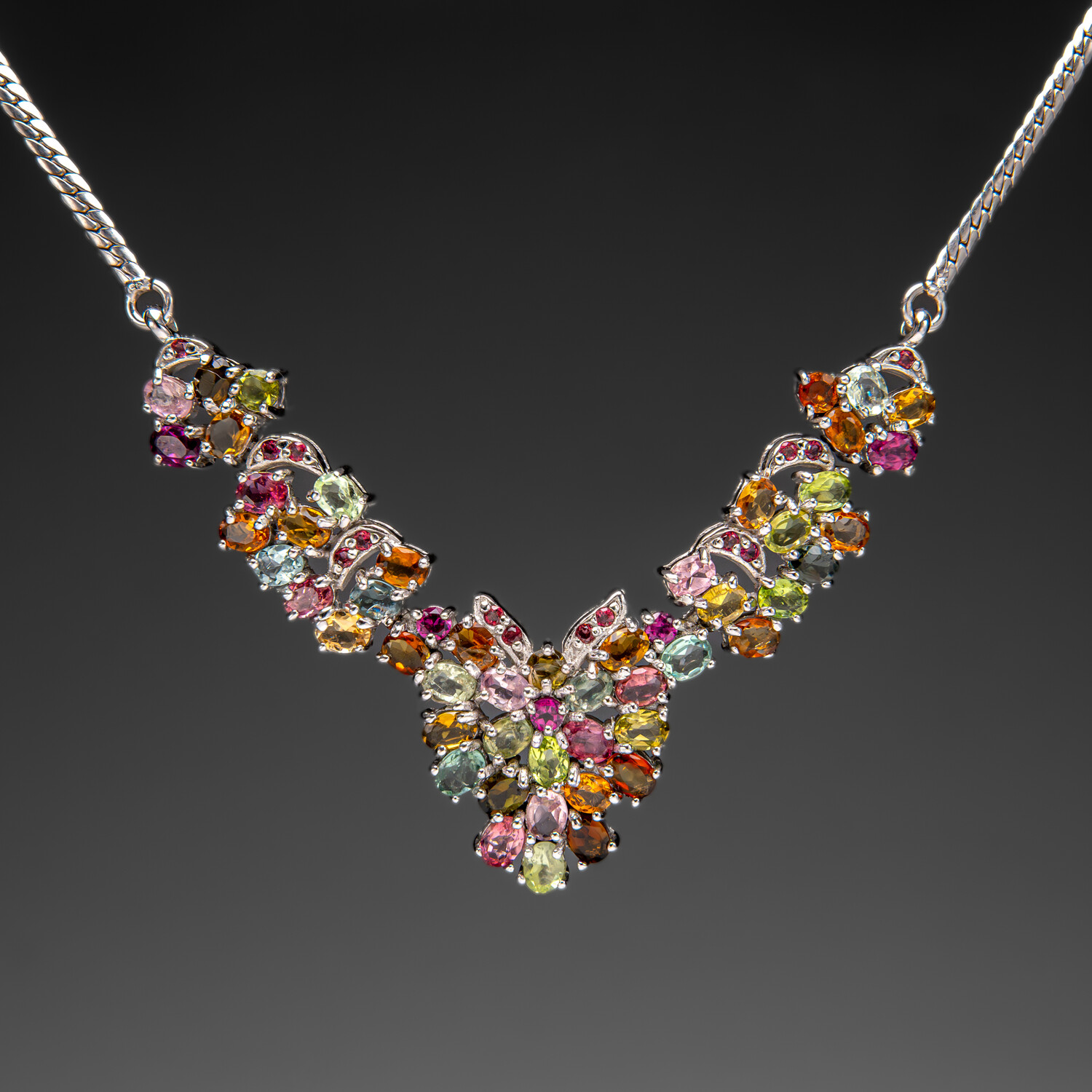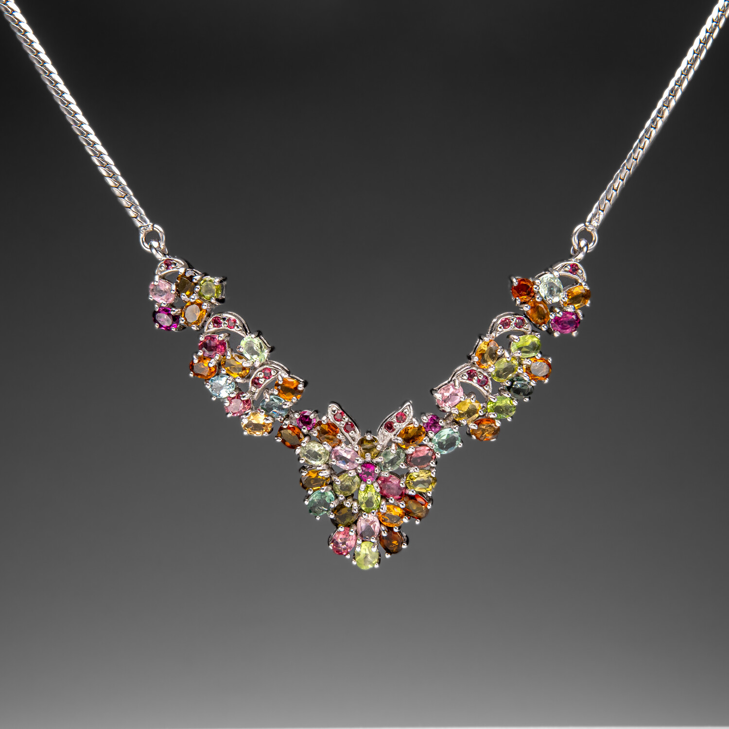 A stunning multicolored gemstone necklace featuring a radiant V-shaped design on a delicate silver chain. The vibrant stones create a dazzling display of color and sparkle, making this piece perfect for special occasions or elevating everyday style.