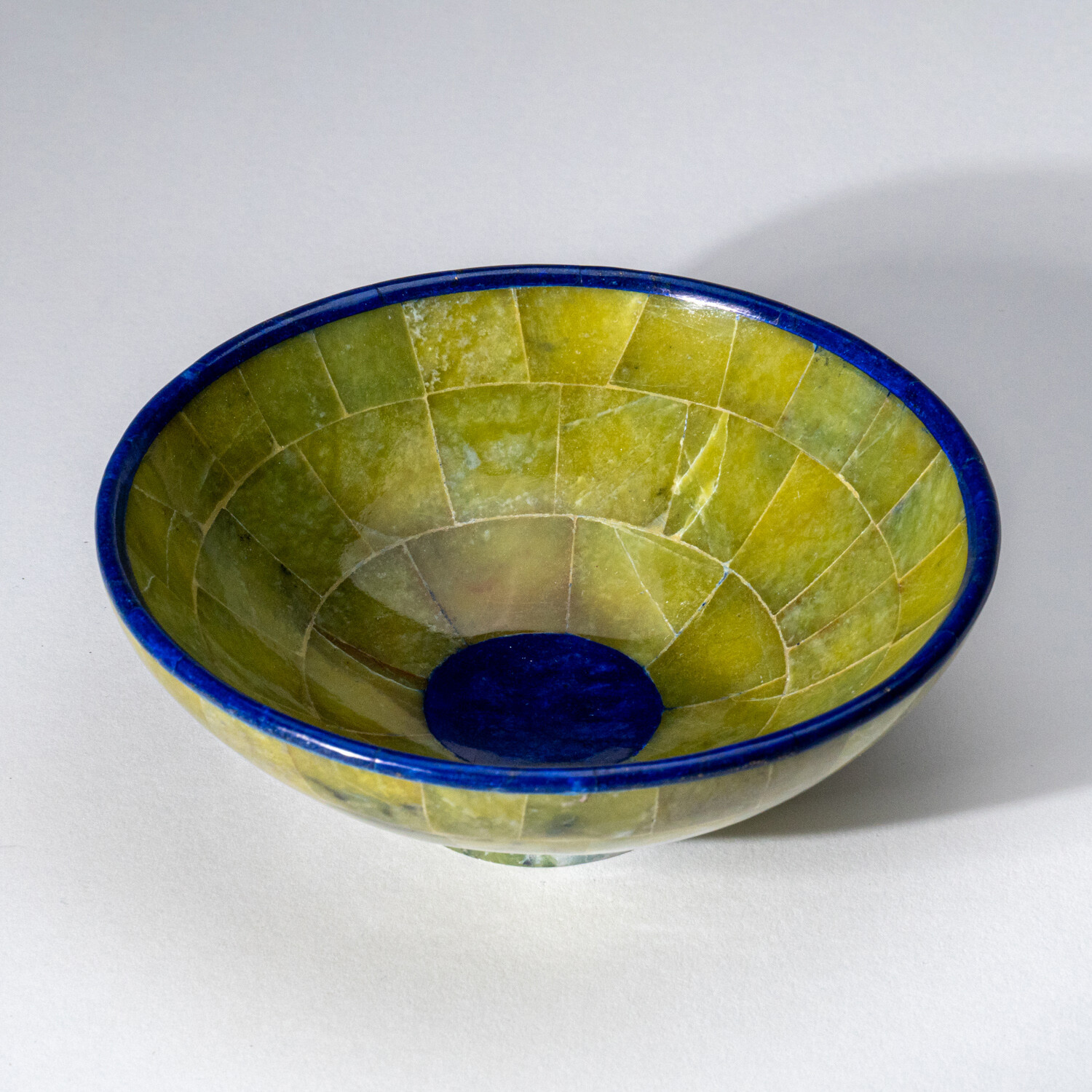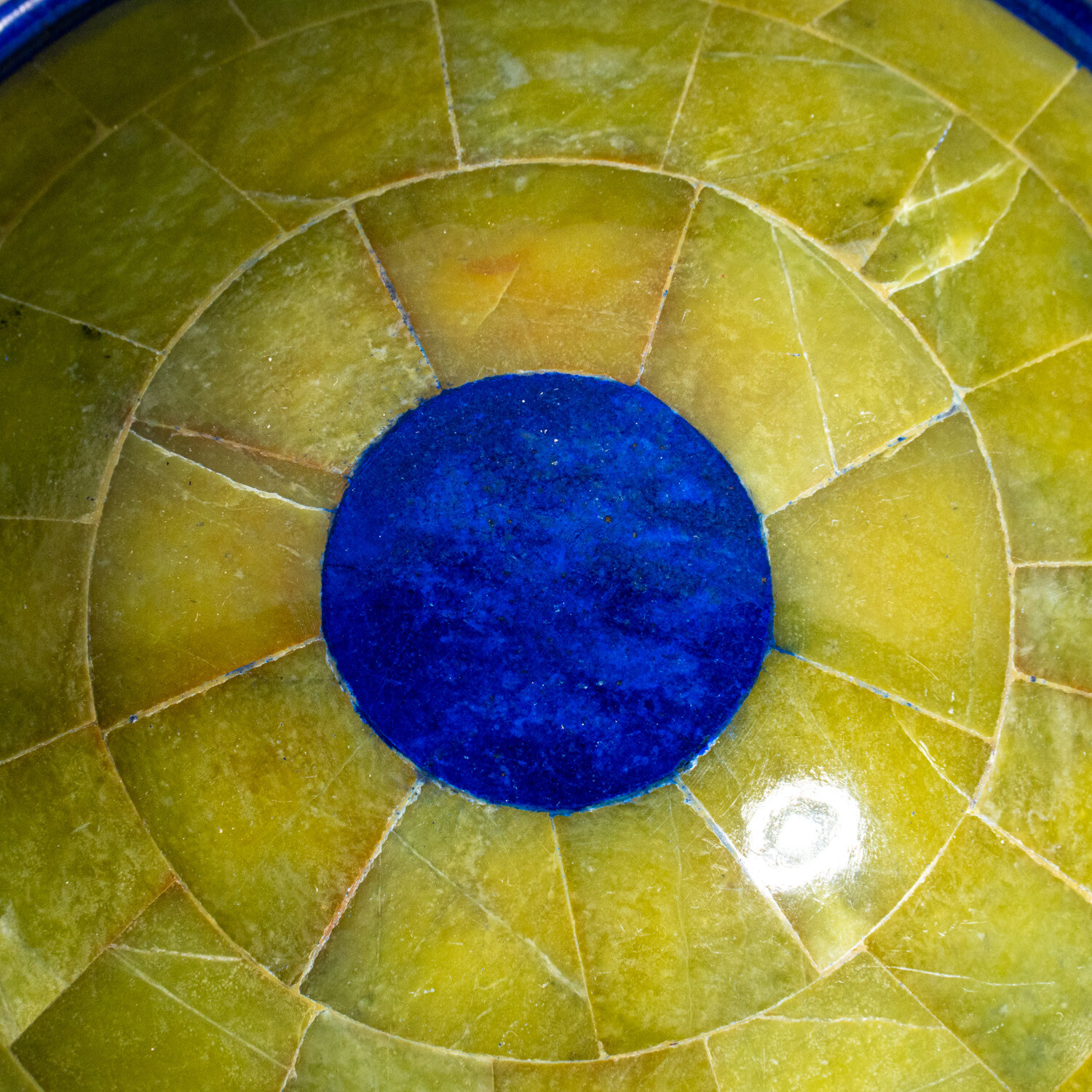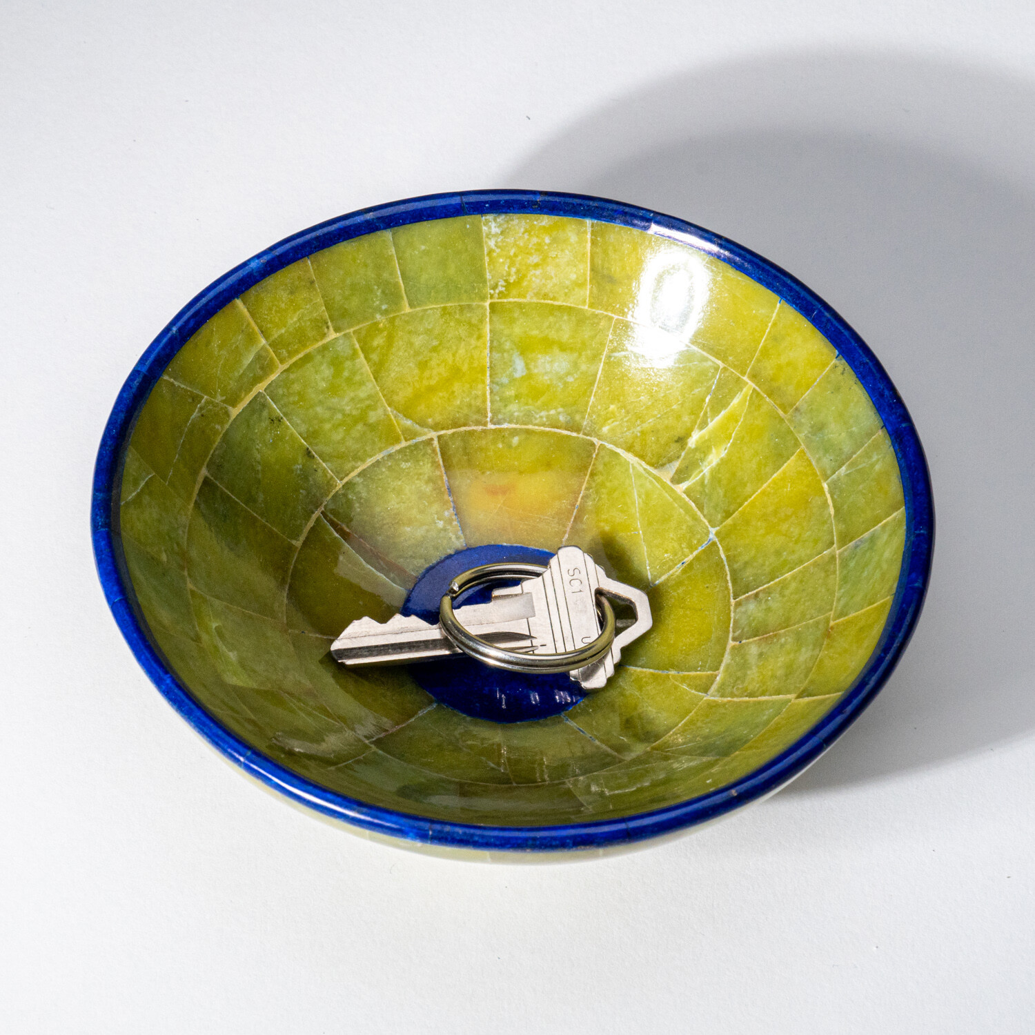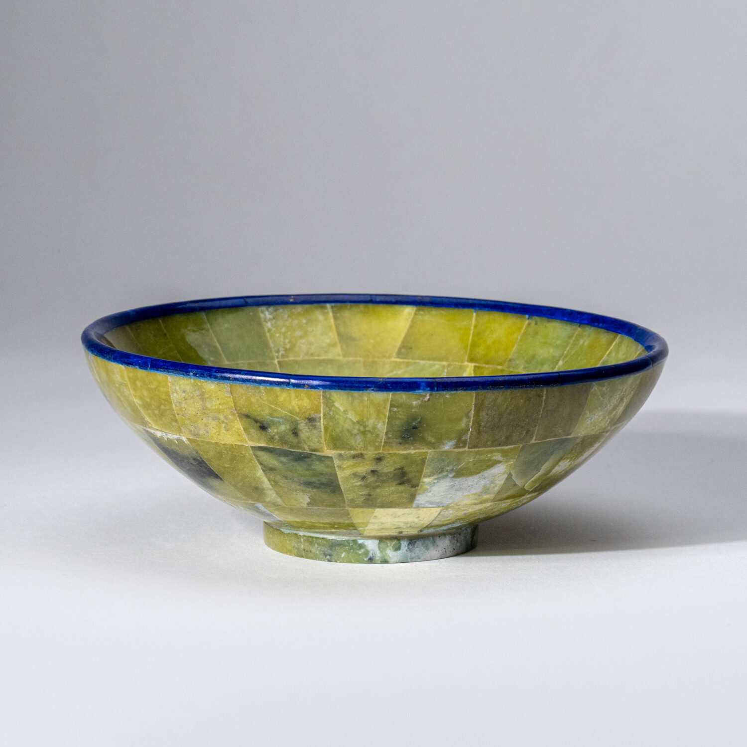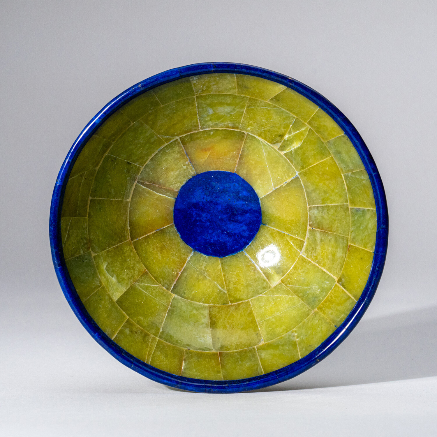 A mosaic style, solid and decorative round green Jade bowl showcases various green and yellow tones with a blue lapis lazuli trim and center. This display piece has a rich saturated color, with clean craftsmanship throughout. The entire trim, as well as the center, display electric blue lapis lazuli, enriched with scintillating pyrite microcrystals.
