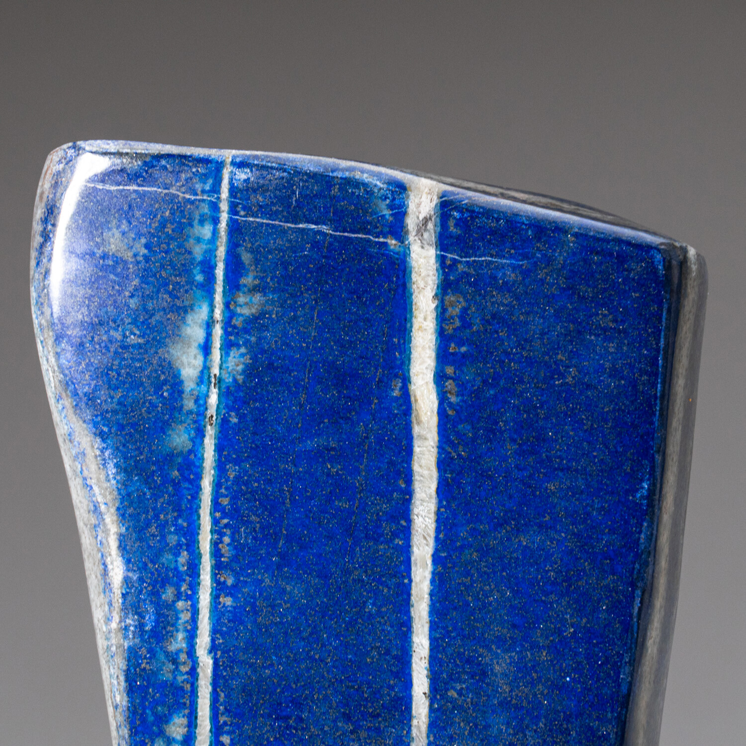 This gem-quality freeform is carved from natural, solid, Lapis Lazuli. This piece is highly saturated with royal blue coloring and attractive pyrite microcrystals. Lapis lazuli is an aggregate of several minerals. Lazurite grains provide its characteristic color. The higher the percentage of lazurite grains in the aggregate, the darker the blue color. This freeform is an exceptional example of this, as it has a smoothly uniform body color.