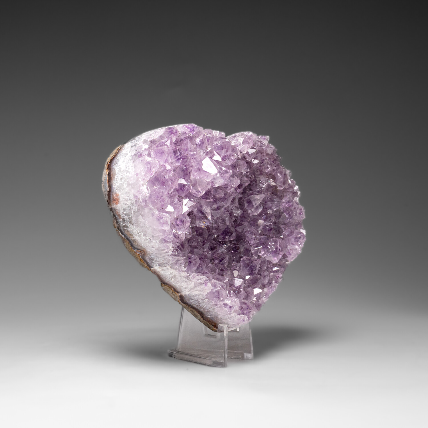Beuatiful quality lustrous cluster of deep-grape Uruguayan Amethyst, handmade and formed into a heart shape with a beautiful polished agate rim. Amethyst is a very powerful and protective crystal, and is a first choice of many metaphysicians. Amethyst was used in ancient times to recover from both physical addictions as well as addictive relationships, and became known as the “Stone of Sobriety”. A natural stress reliever, Amethyst can encourage inner strength.