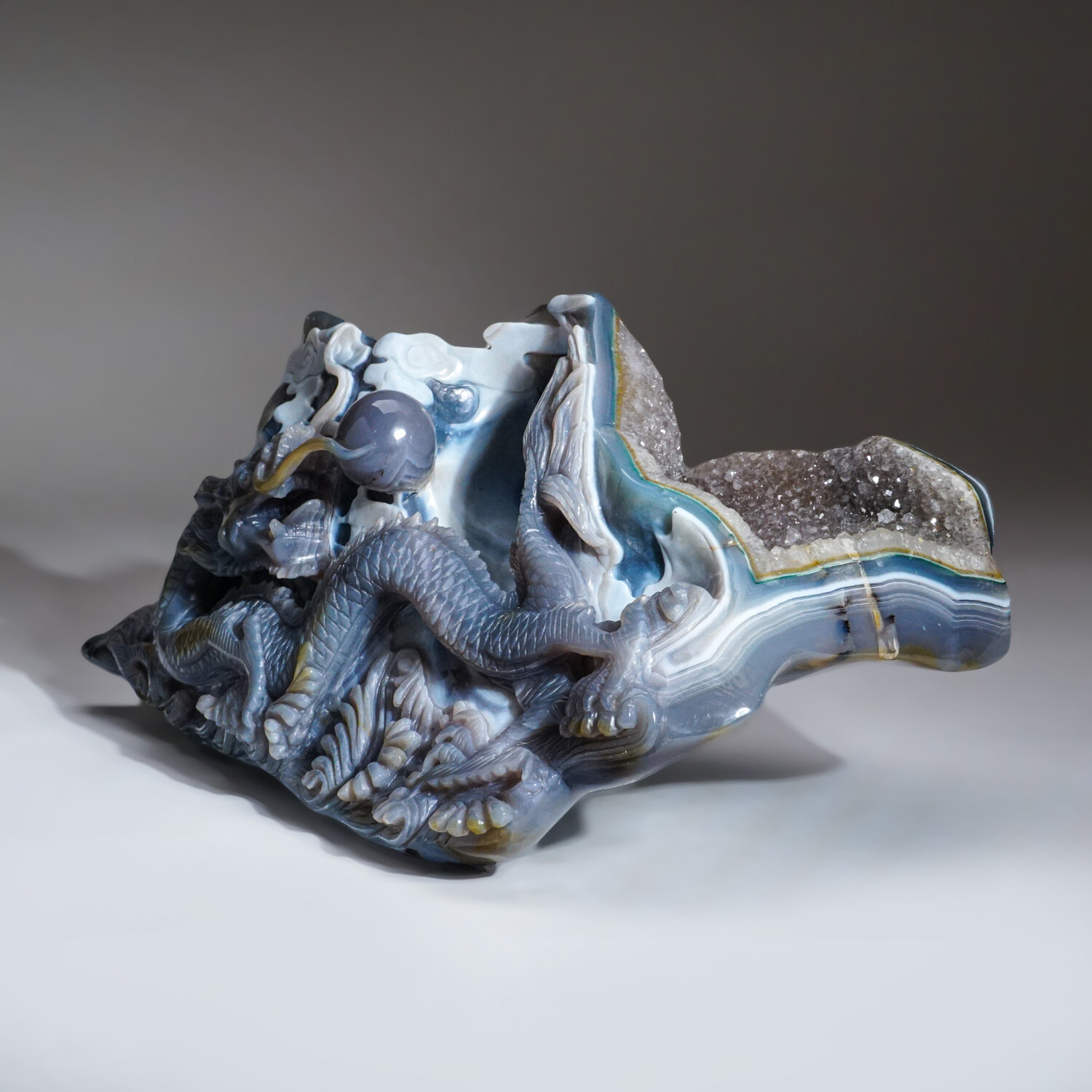 The German artisan of this piece used this gem quality, banded agate to truly highlight the quality of the stone. Carved from a single piece of incredibly transparent banded agate (sourced in Uruguay), the variation in color creates spectacular dimension. The landscape of this piece is a bright white color, with a grey/purple gradient dragon sitting atop in the foreground. On the opposite side of the carving, there is a large, natural cavity of soft colored, transparent quartz crystals with beautiful luster.