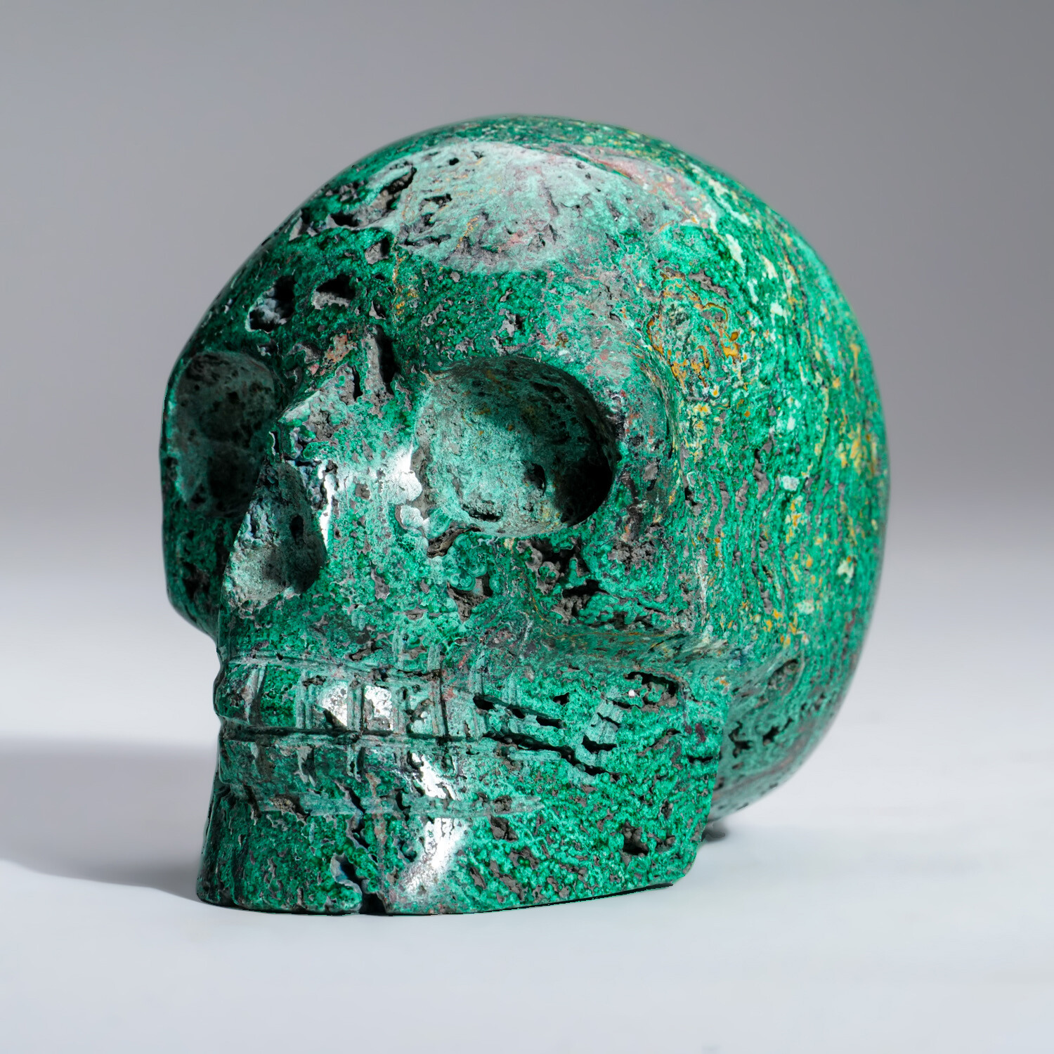 Top-quality, hand-polished Chrysocolla skull from Peru. This beautiful piece has rich green and blue color. A great specimen for a mineral collection and a wonderful home decoration.