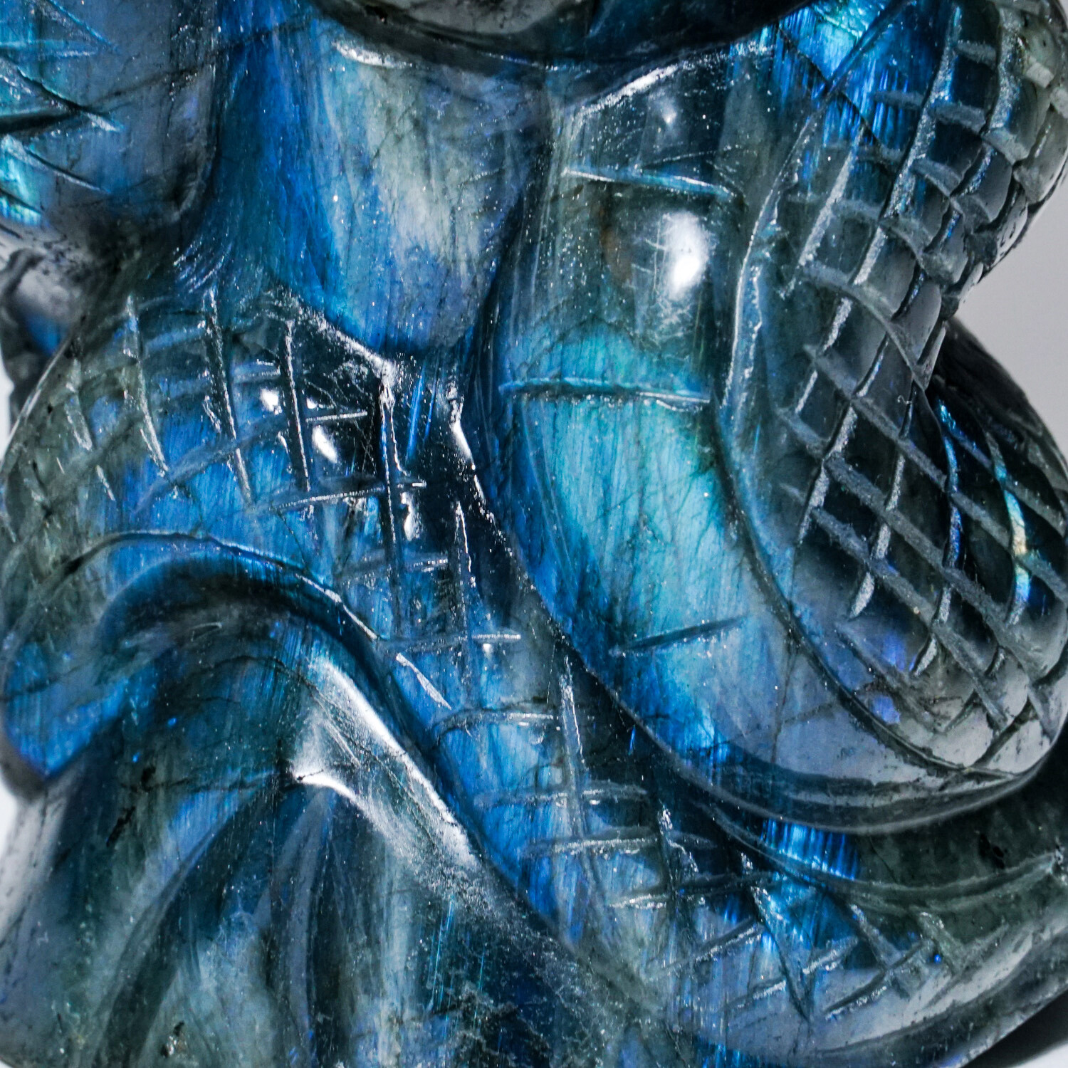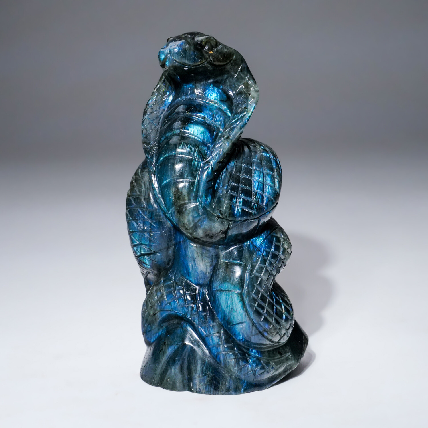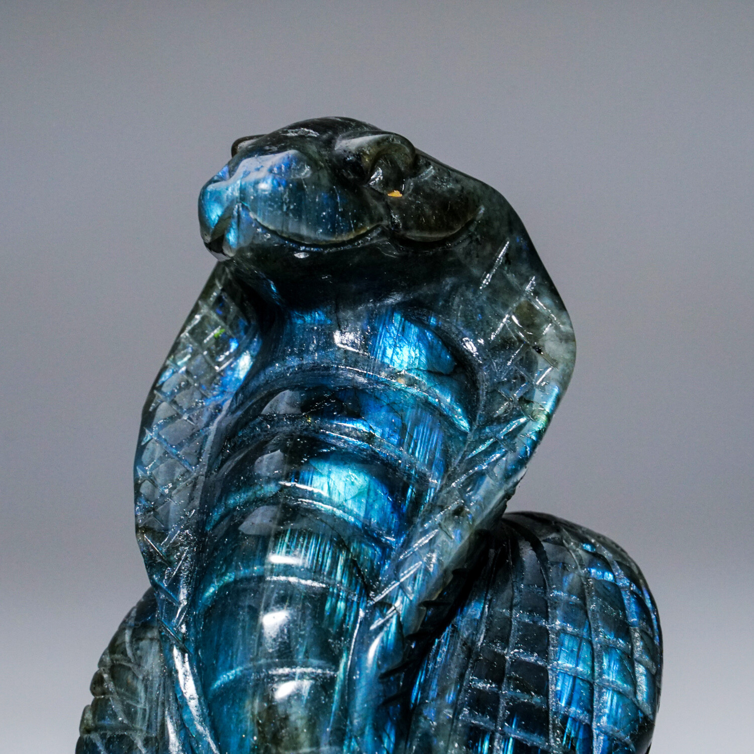 This snake carving is made from a solid, top quality piece of labradorite from India. Along with its intricate detail, this piece has a beautiful, iridescent play of color, which is caused by internal fractures in the mineral that reflect light back and forth, dispersing it into different colors. Labradorite is considered a tremendously spiritual stone, especially helpful for people who tend to overwork. It helps an individual regain energy while aiding the body and spirit in healing itself. In the metaphysical world, labradorite is considered one of the most powerful protectors.