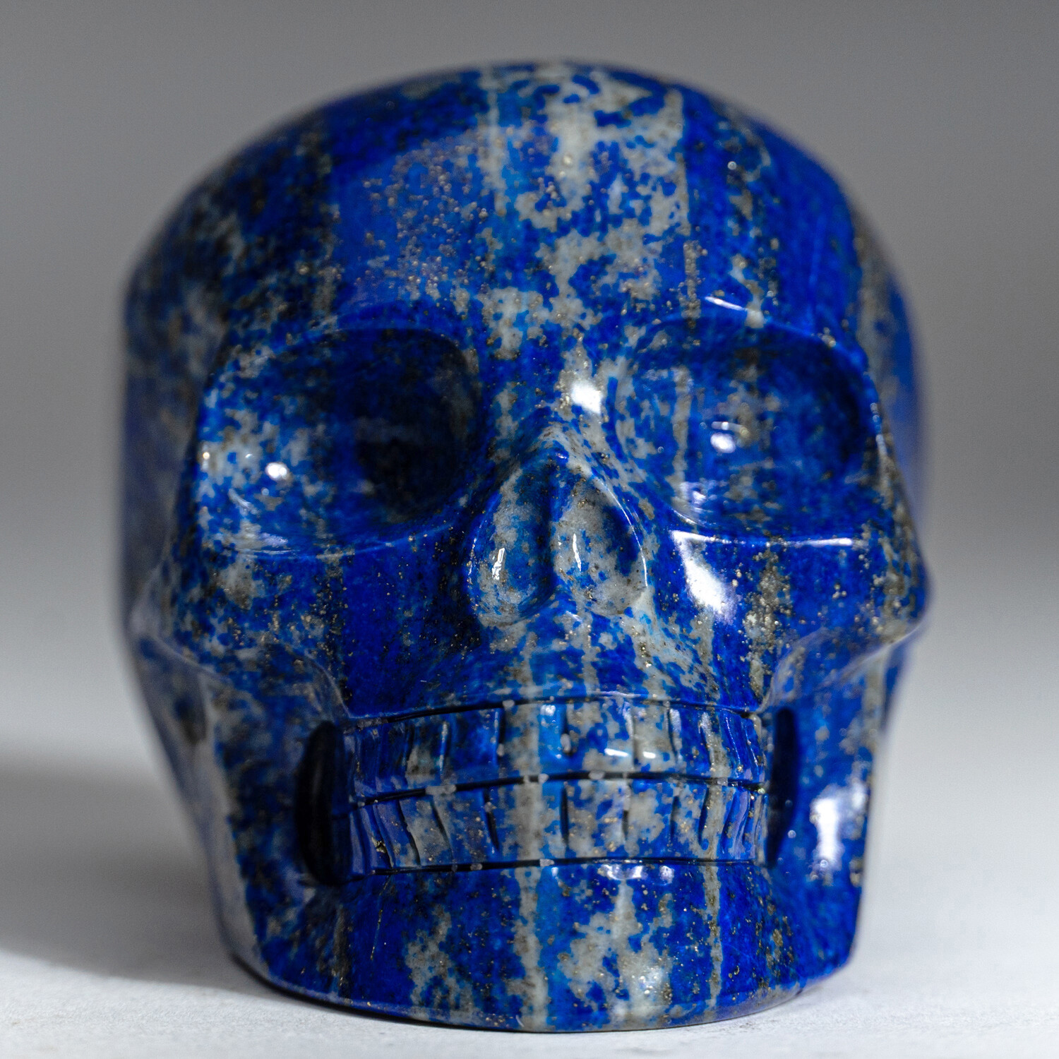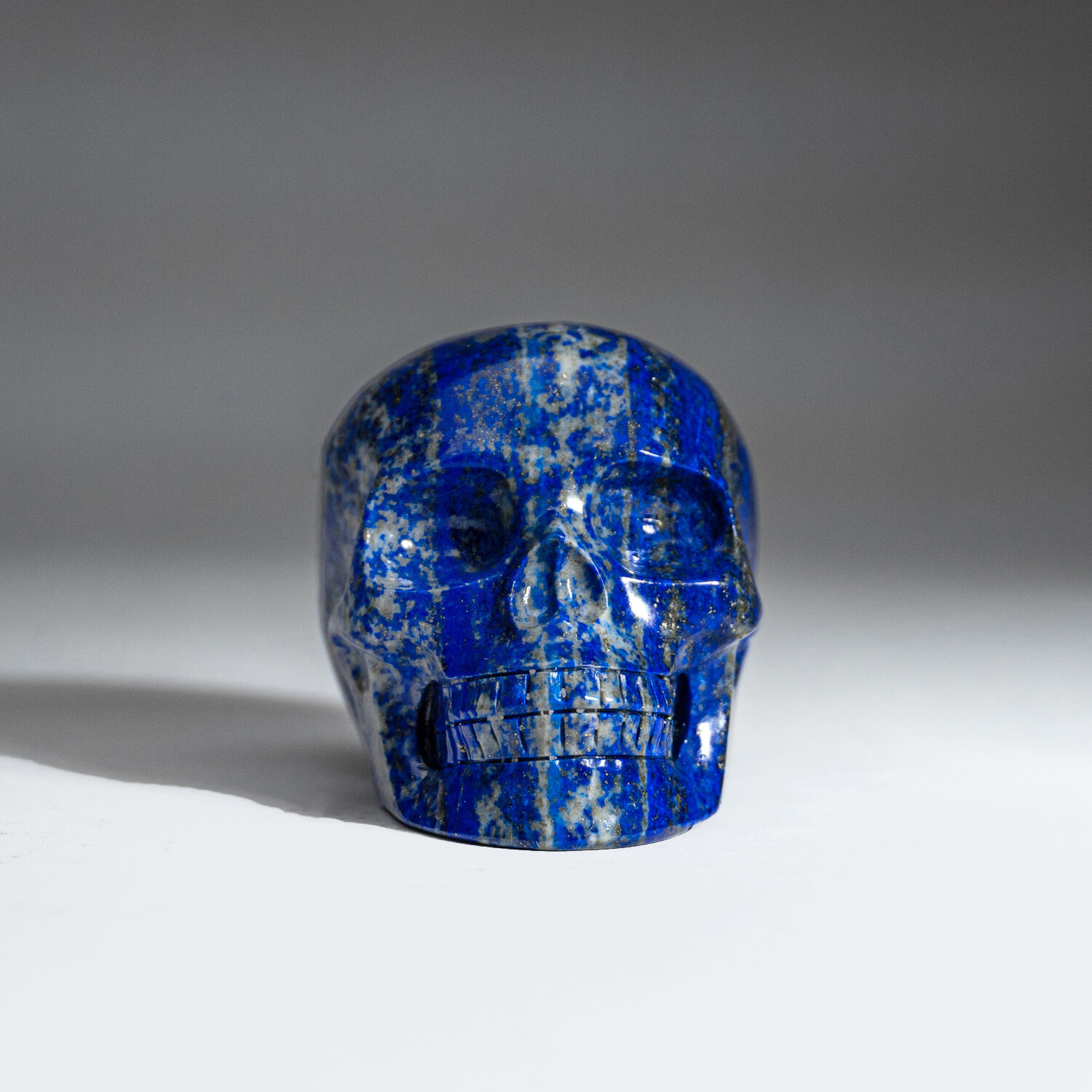 AAA quality, hand-polished lapis lazuli skull carvings. This beautiful piece has rich electric-royal blue color enriched with scintillating pyrite microcrystals. A great specimen for a mineral collection, wonderful as a home decoration, and a peaceful and tranquil stone to bring into your home.