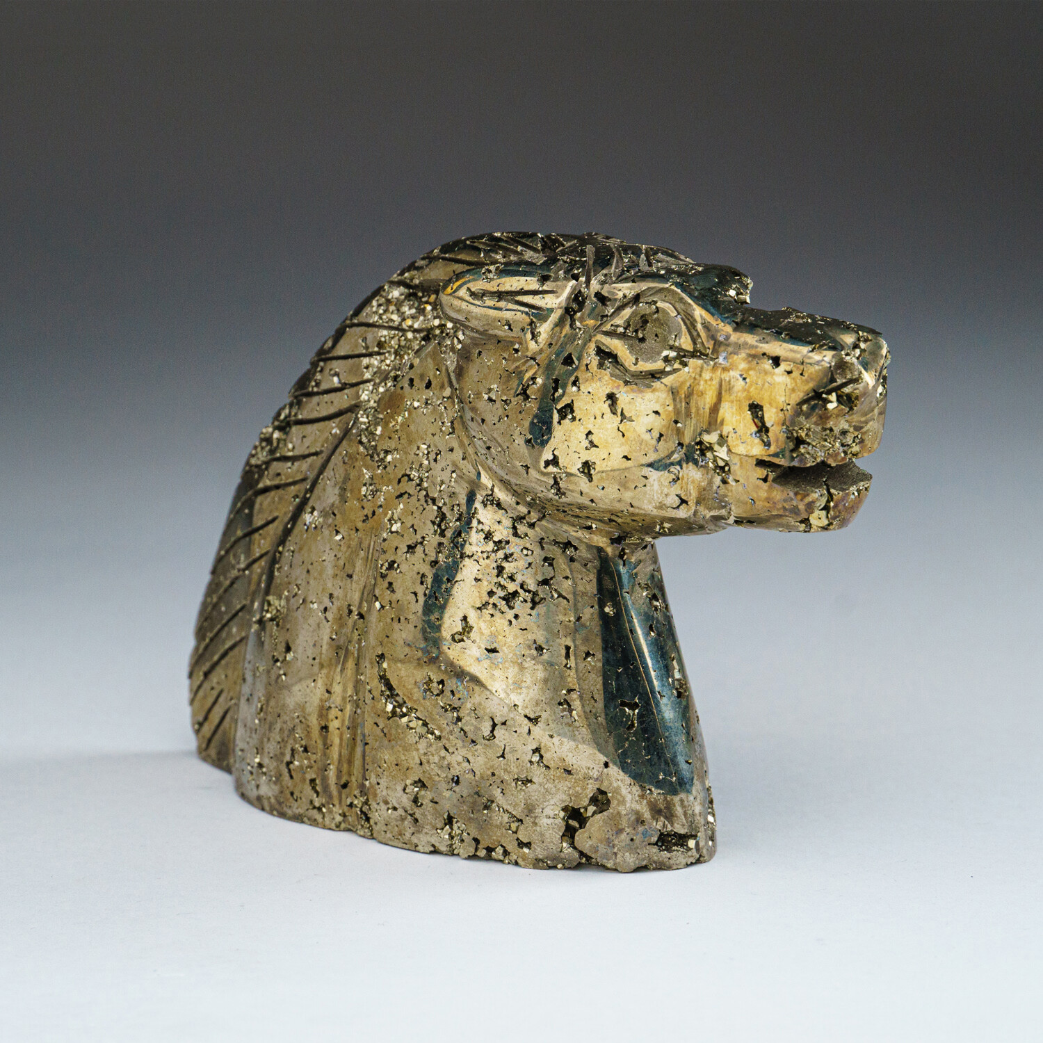 Large, vibrant hand-shaped and hand-polished figure of a Horse, carved from a single piece of solid, AAA-quality Pyrite. This mineral's metallic luster and pale brass-yellow hue gives it a superficial resemblance to gold. This piece is polished to a high mirror finish with mesmerizing crystal pockets revealing its natural crystallized cubic formation.