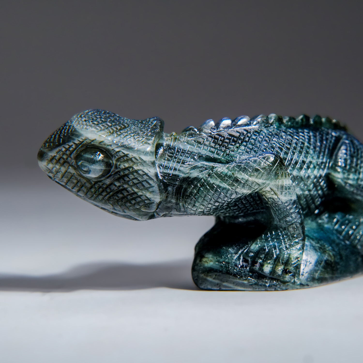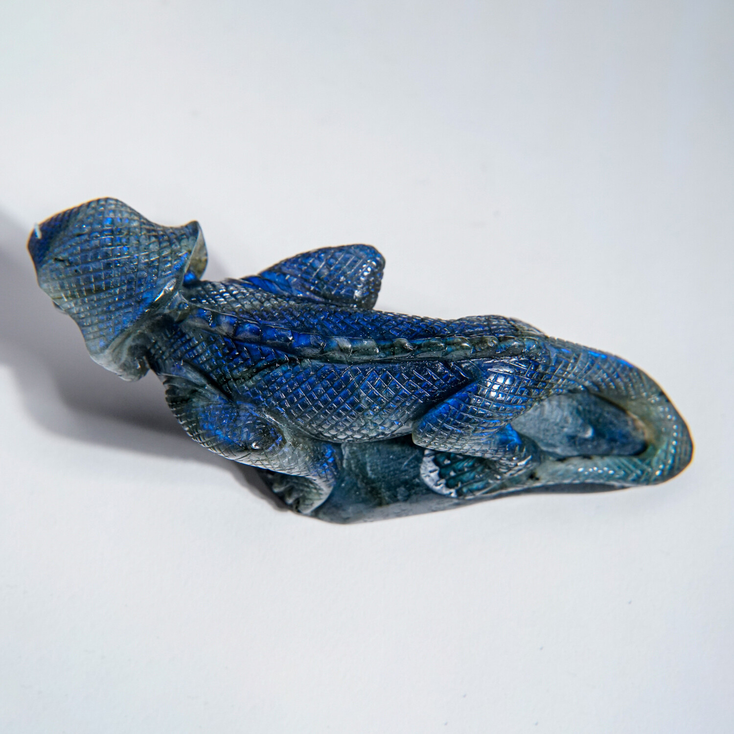 This lizard carving is made from a solid, top quality piece of labradorite from Madagascar. Along with its intricate detail, this piece has a beautiful, iridescent play of color, which is caused by internal fractures in the mineral that reflect light back and forth, dispersing it into different colors. Labradorite is considered a tremendously spiritual stone, especially helpful for people who tend to overwork. It helps an individual regain energy while aiding the body and spirit in healing itself. In the metaphysical world, labradorite is considered one of the most powerful protectors.