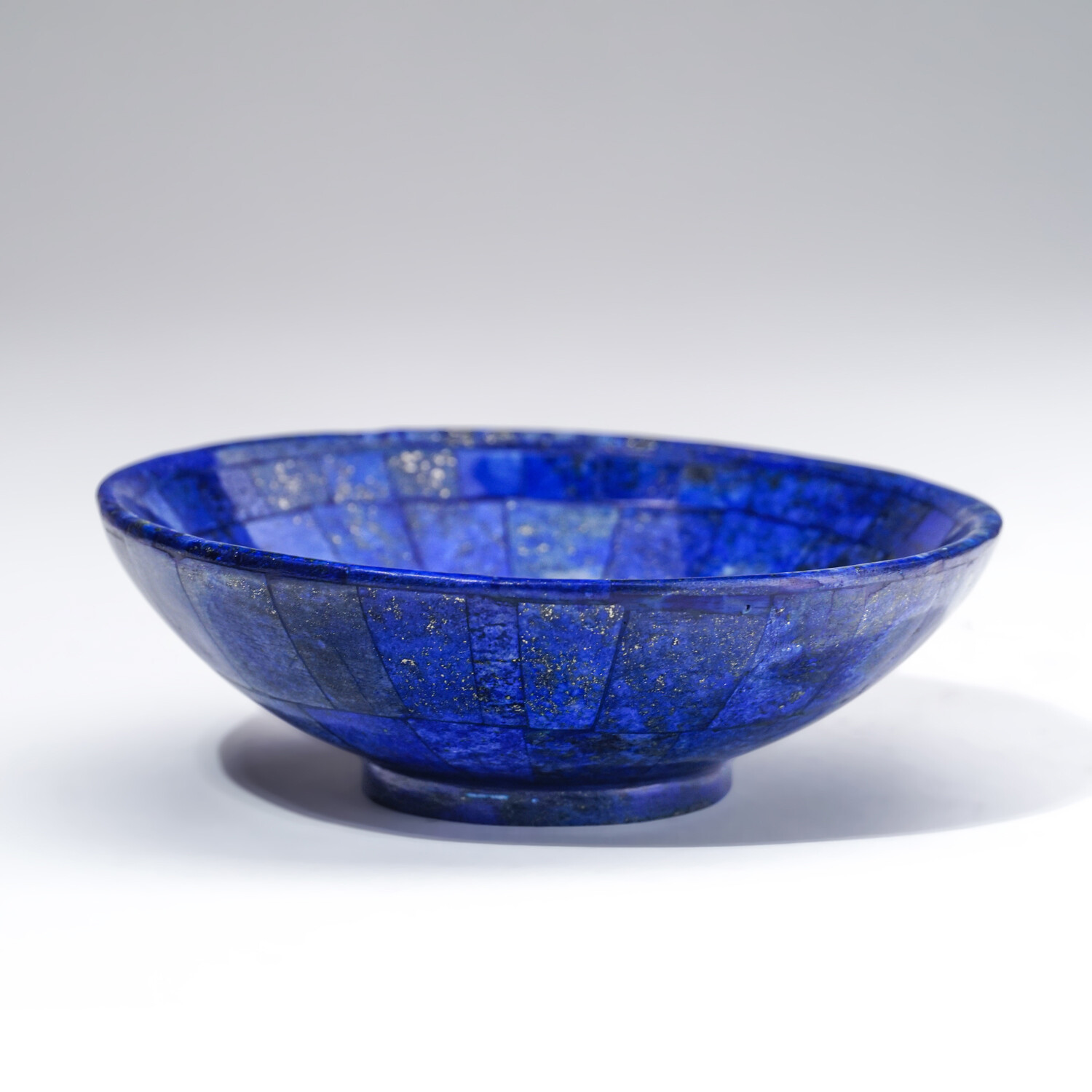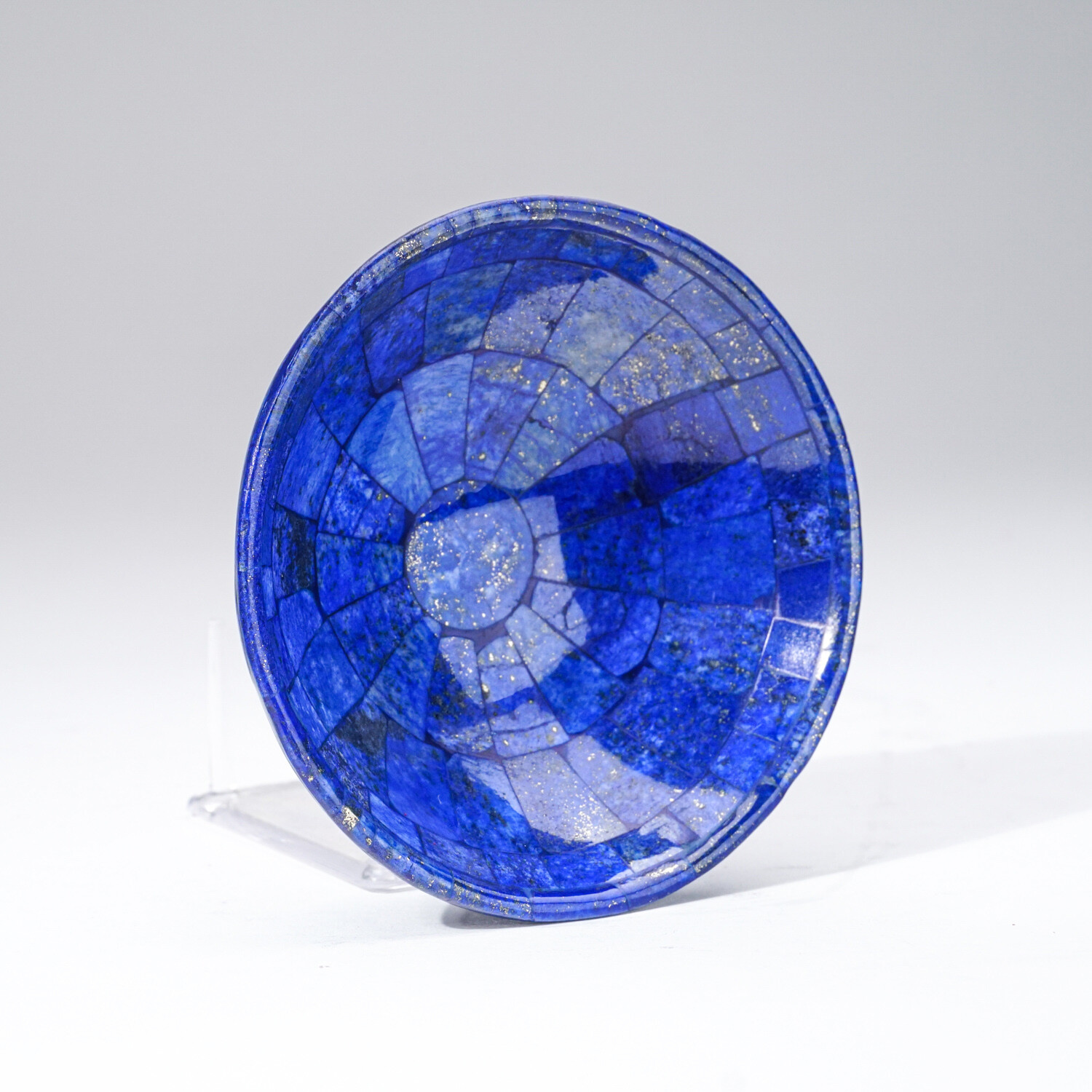 A mosaic style, decorative Lapis Lazuli bowl showing various blue tones and pyrite inclusions. This display piece is a saturated color with clean craftsmanship. This specimen has rich, electric-royal blue color enriched with scintillating pyrite microcrystals and no veins of calcite.