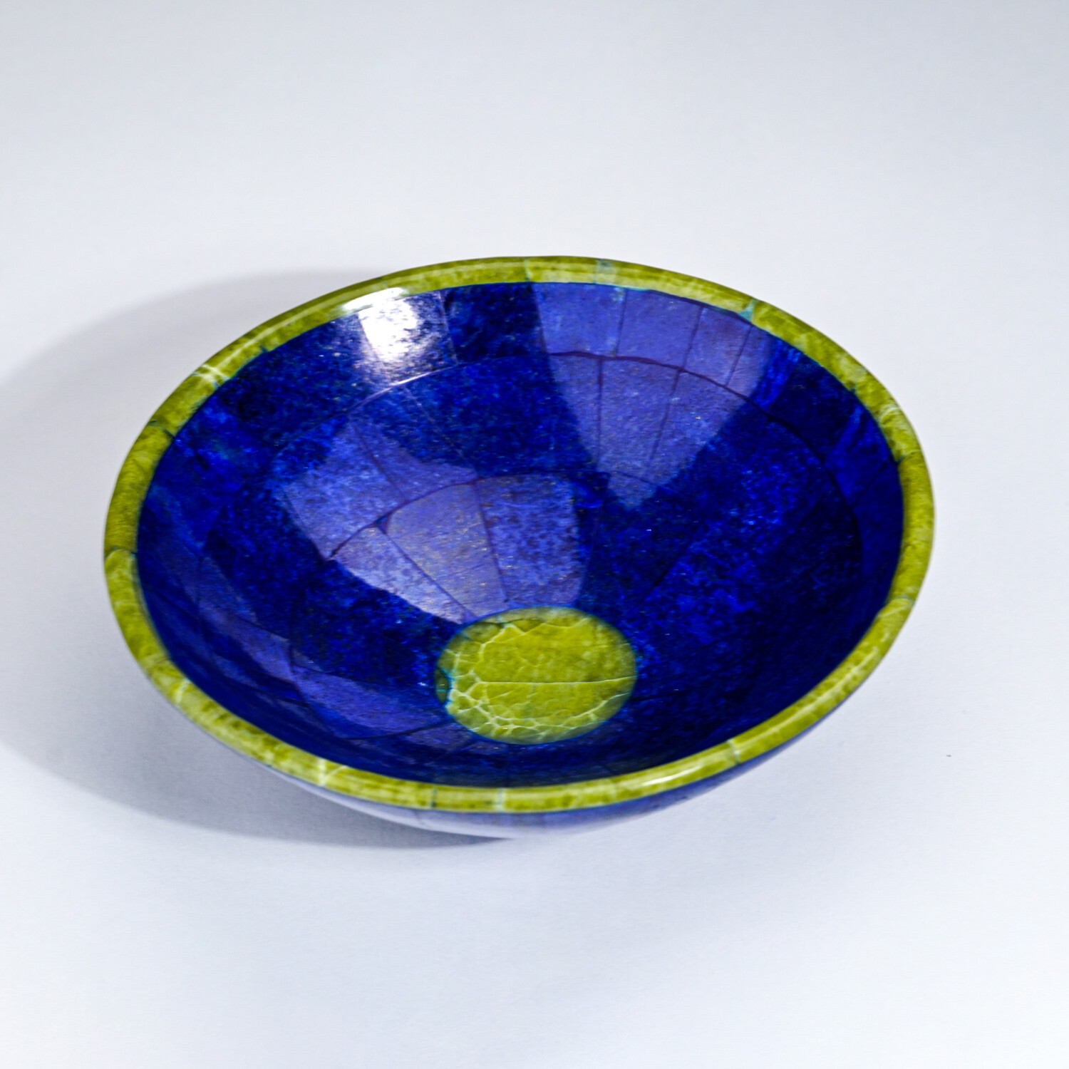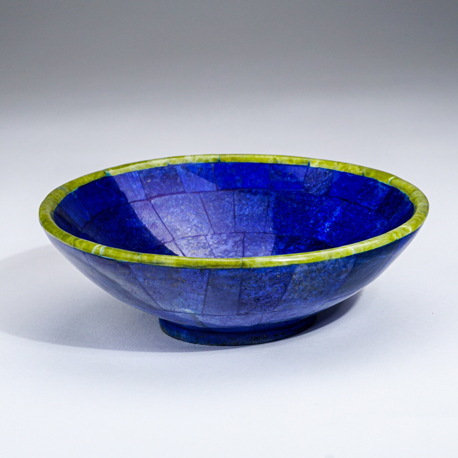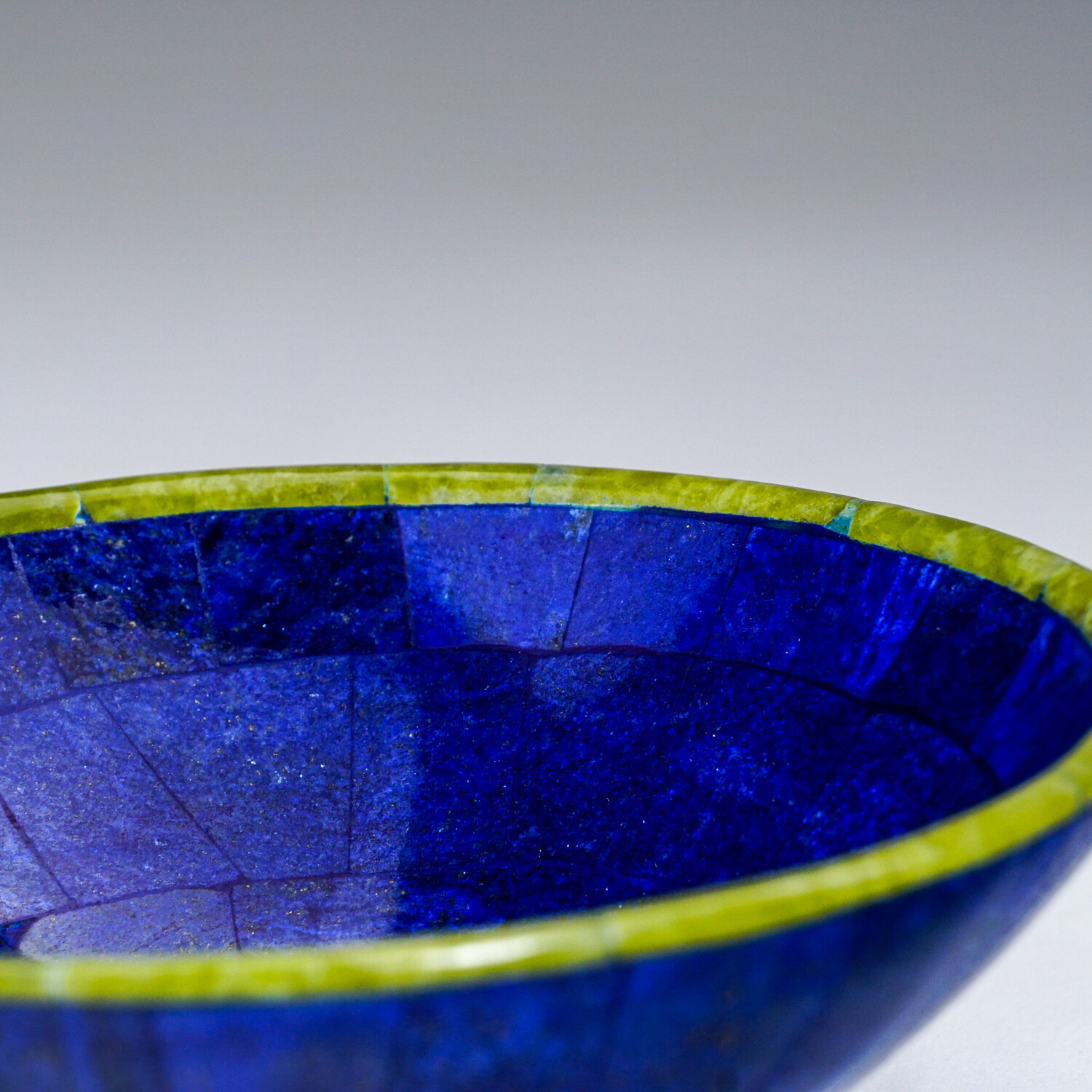 This is a mosaic style, decorative Polished Lapis Lazuli Bowl showing various blue tones and pyrite inclusions along with a green jade trim and base. This display piece is a saturated color with clean craftsmanship. This specimen has rich, electric-royal blue color enriched with scintillating pyrite microcrystals and no veins of calcite. The entire trim, as well as the base, display green jade. Lapis Lazuli is a powerful mineral for activating the higher mind and enhancing intellectual ability. It stimulates the desire for knowledge, truth and understanding, and aids the process of learning. It is excellent for enhancing memory.