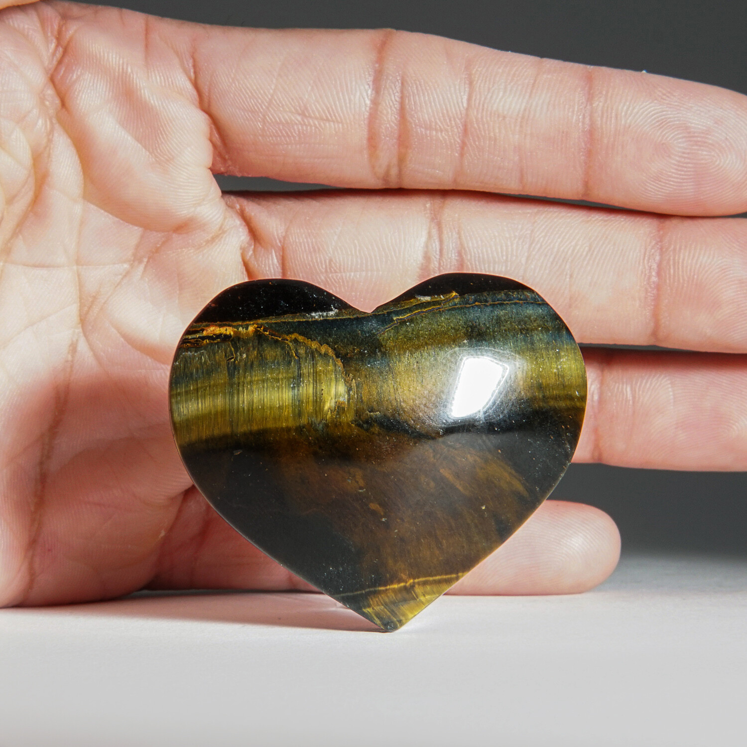 AAA quality, polished Golden Brown Tiger Eye palm stone from India with an attractive mix of yellows, golden browns with variations and shimmer typical to Tiger Eye. This piece is hand carved from solid, all natural Tiger's Eye. Known as a stone of protection, especially for travelers, Tiger Eye brings good luck and prosperity to the user. Ancients used Tiger Eye as a talisman against bad luck and curses.