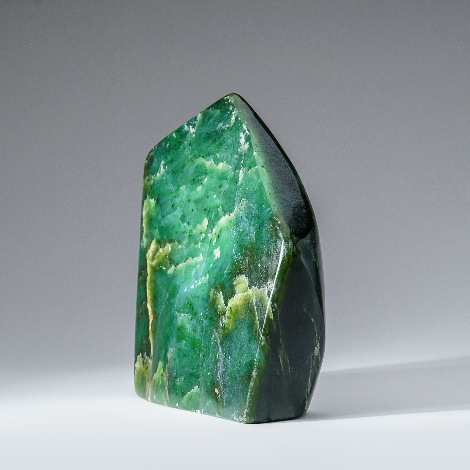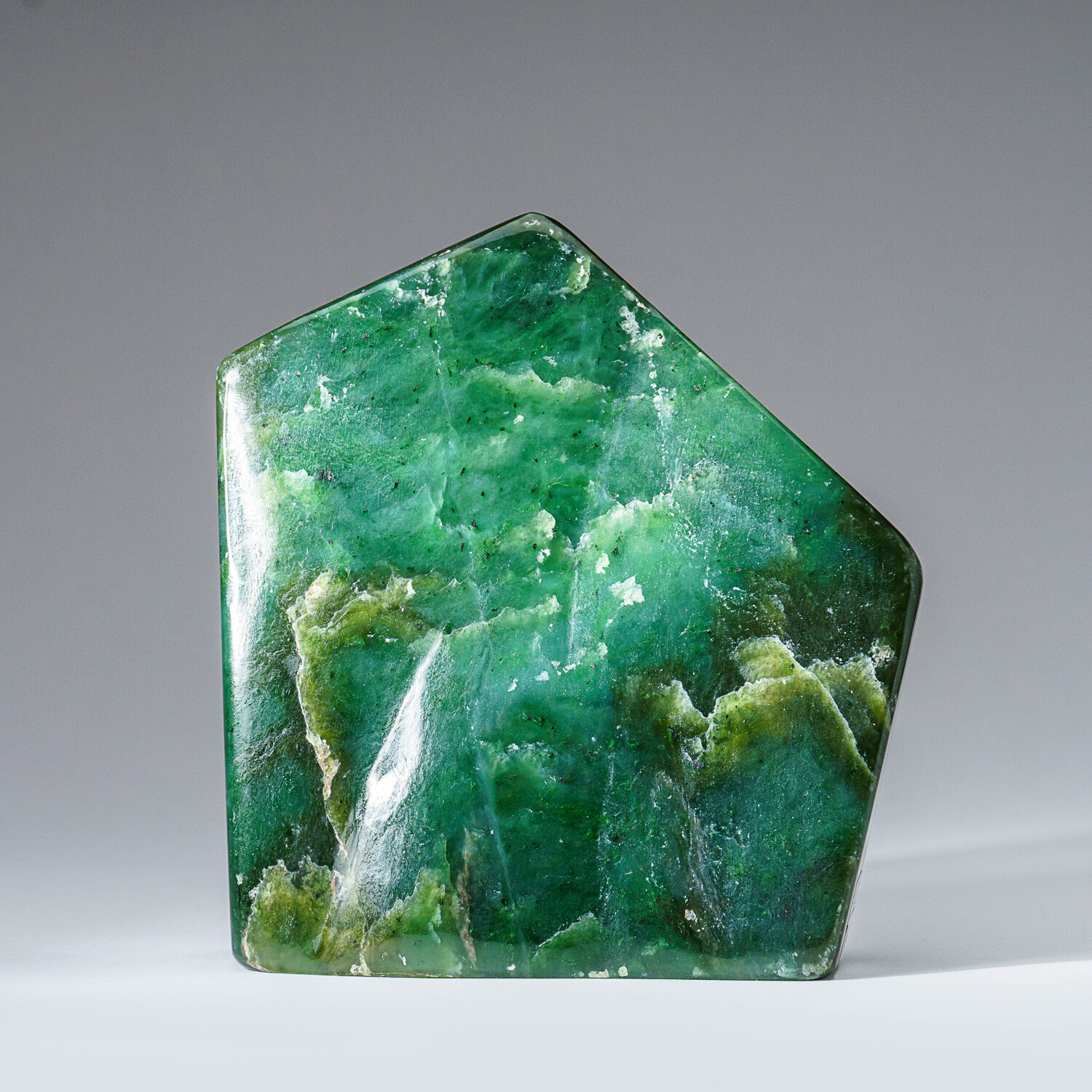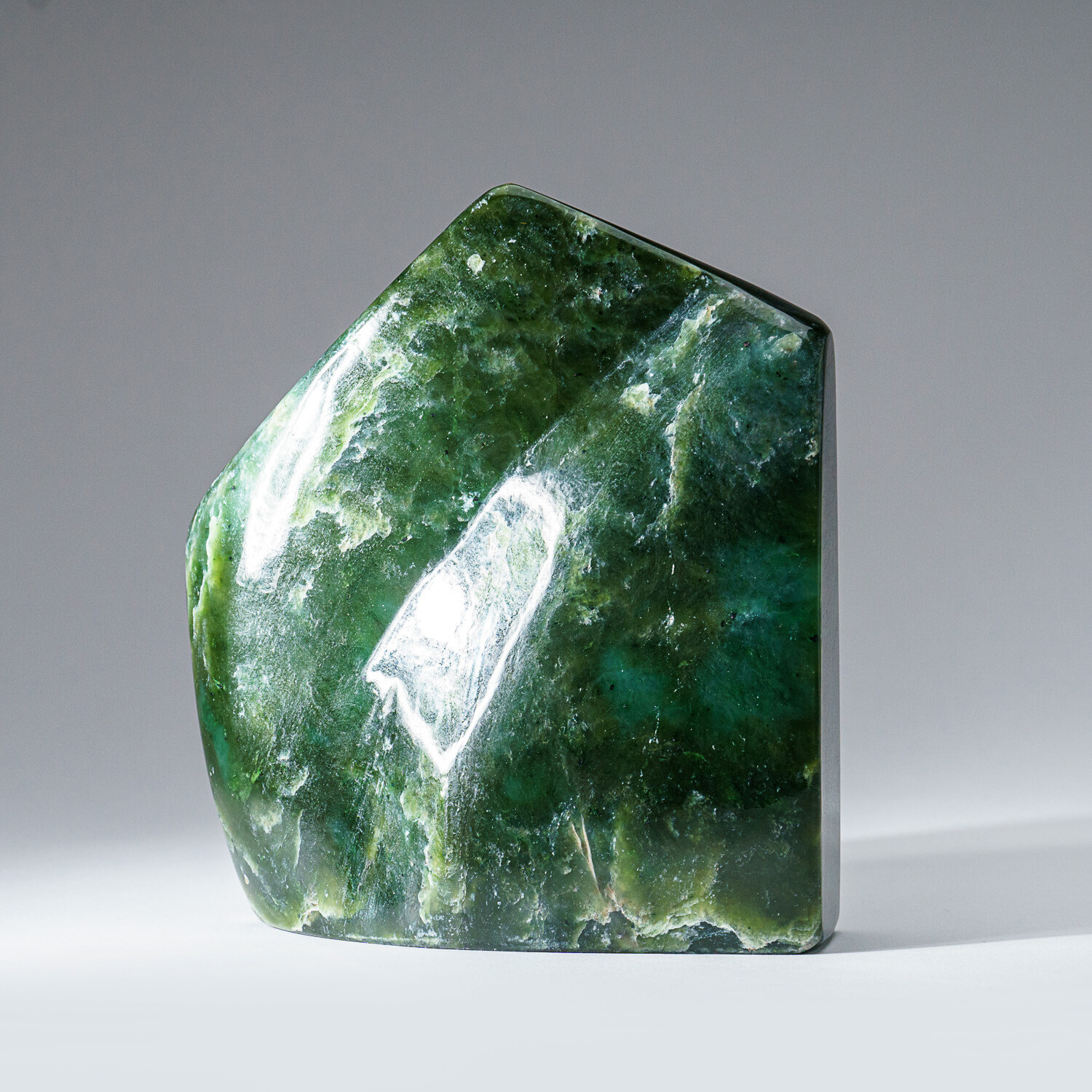 This Polished Nephrite Jade Freeform is carved from a solid piece of gem quality jade. This piece has a captivating color with a gleaming luster and beautiful transparencies. It has been hand polished to a mirrored finish. Known as the "stone of fidelity," Nephrite Jade is wonderful for working with the Heart Chakra balancing male and female energies, and helping with dysfunctional relationships. Jade instills confidence, calms the nervous system and is a good stone for Libra.