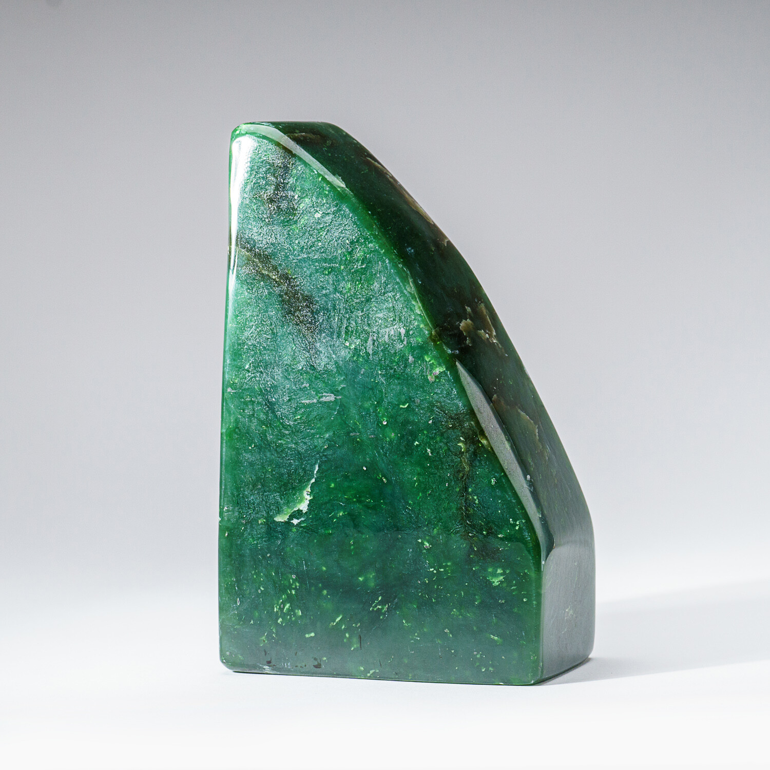 This is a Stunning Polished Nephrite Jade Freeform carved from a solid piece of gem quality jade. This piece has a captivating color with a gleaming luster and beautiful transparencies. It has been hand polished to a mirrored finish. Known as the "stone of fidelity," Nephrite Jade is wonderful for working with the Heart Chakra balancing male and female energies, and helping with dysfunctional relationships. Jade instills confidence, calms the nervous system and is a good stone for Libra.