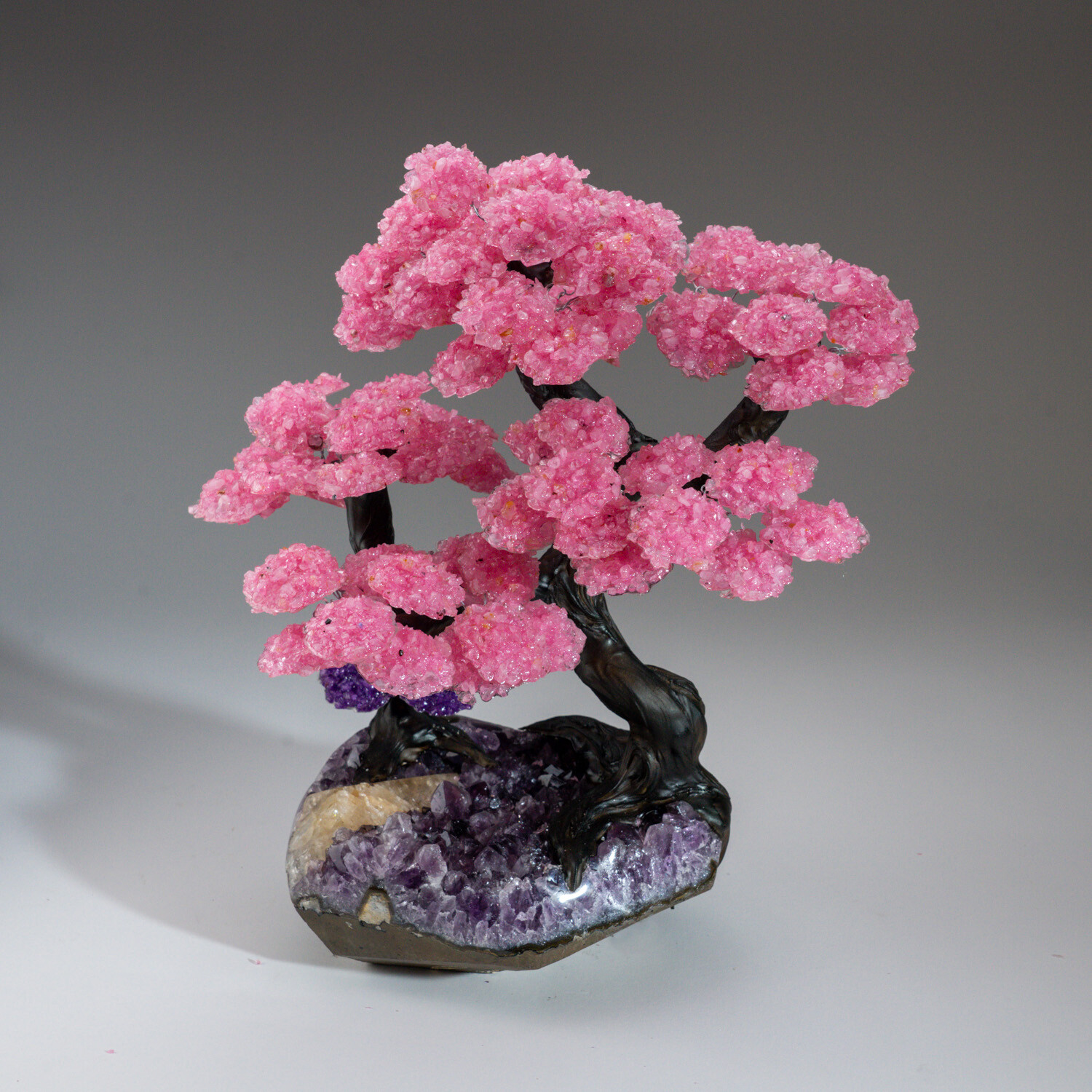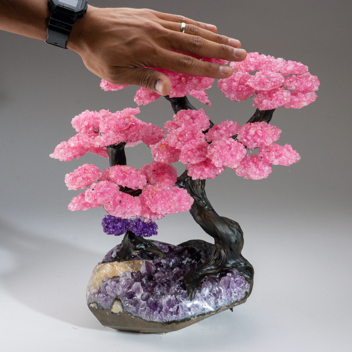Handcrafted by master artisans in Brazil, the Love Tree is an impressive display piece that will inspire you every time you see it. This stunning work of art features a clustered Rose Quartz gemstone tree sprouting from an Amethyst matrix. Each tree is individually shaped and carefully painted by hand for a realistic look that adds natural beauty to any space.