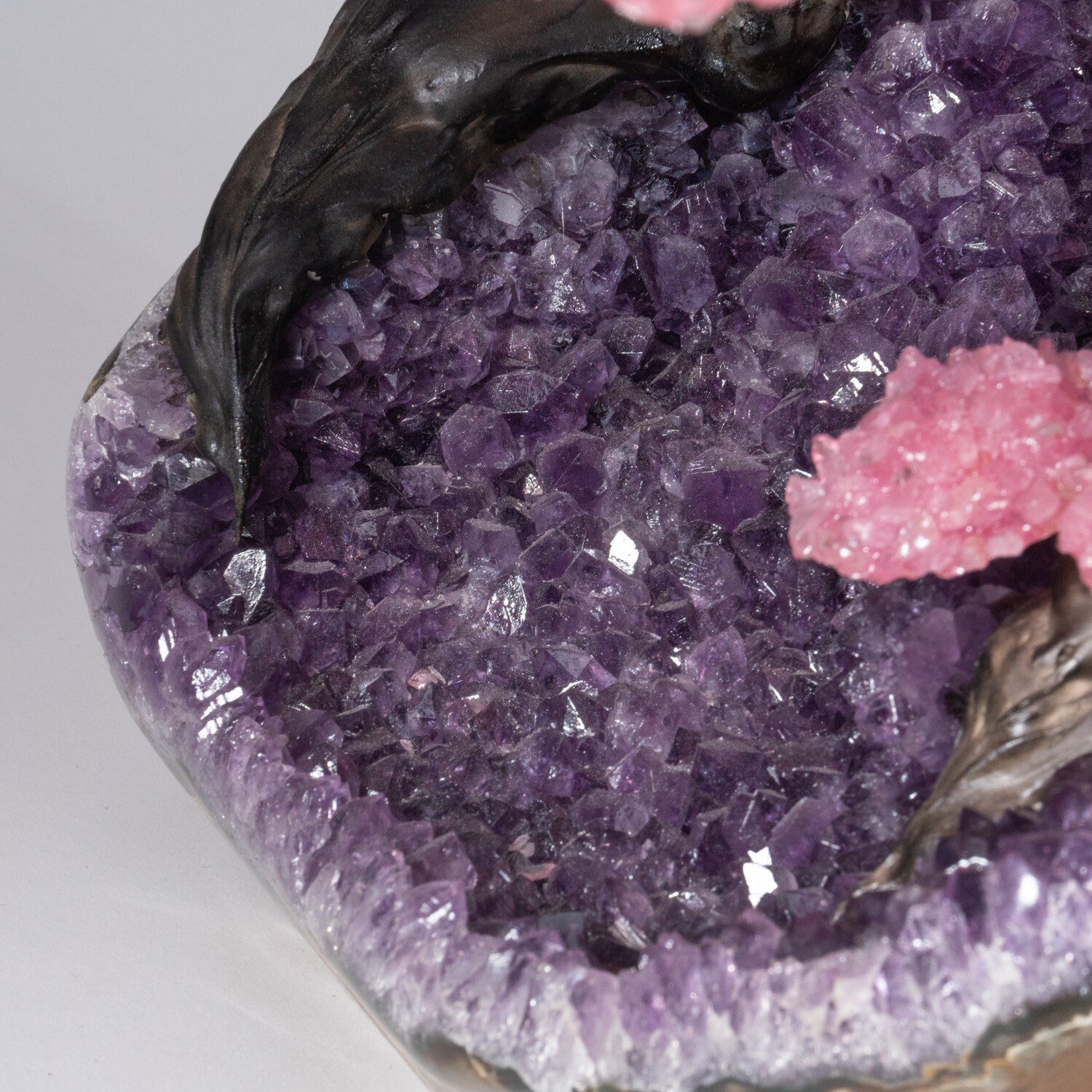 Handcrafted by master artisans in Brazil, the Love Tree is an impressive display piece that will inspire you every time you see it. This stunning work of art features a clustered Rose Quartz gemstone tree sprouting from an Amethyst matrix. Each tree is individually shaped and carefully painted by hand for a realistic look that adds natural beauty to any space.