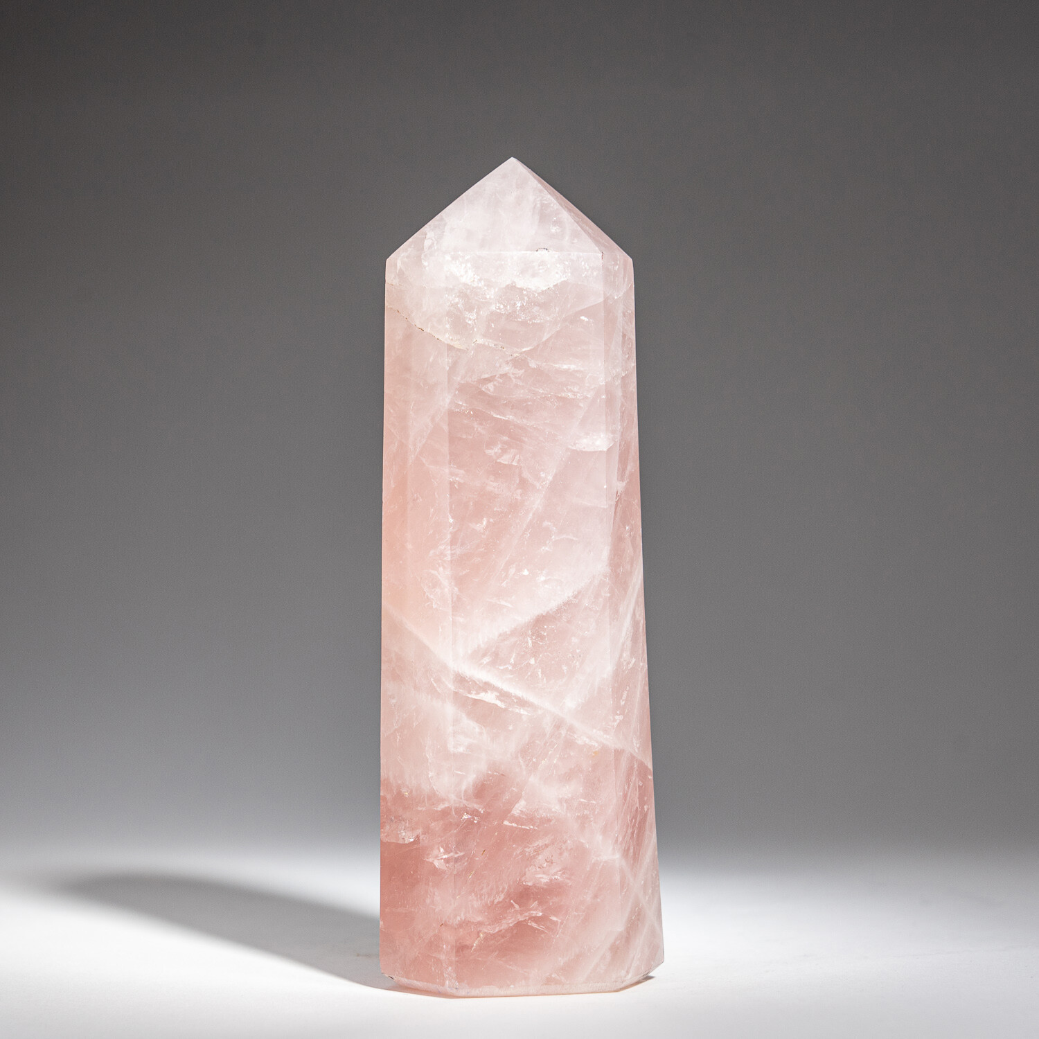 AAA-quality gem transparent polished Brazilian Rose Quartz point. This natural specimen has a super-pink color and a highly-polished mirror face.