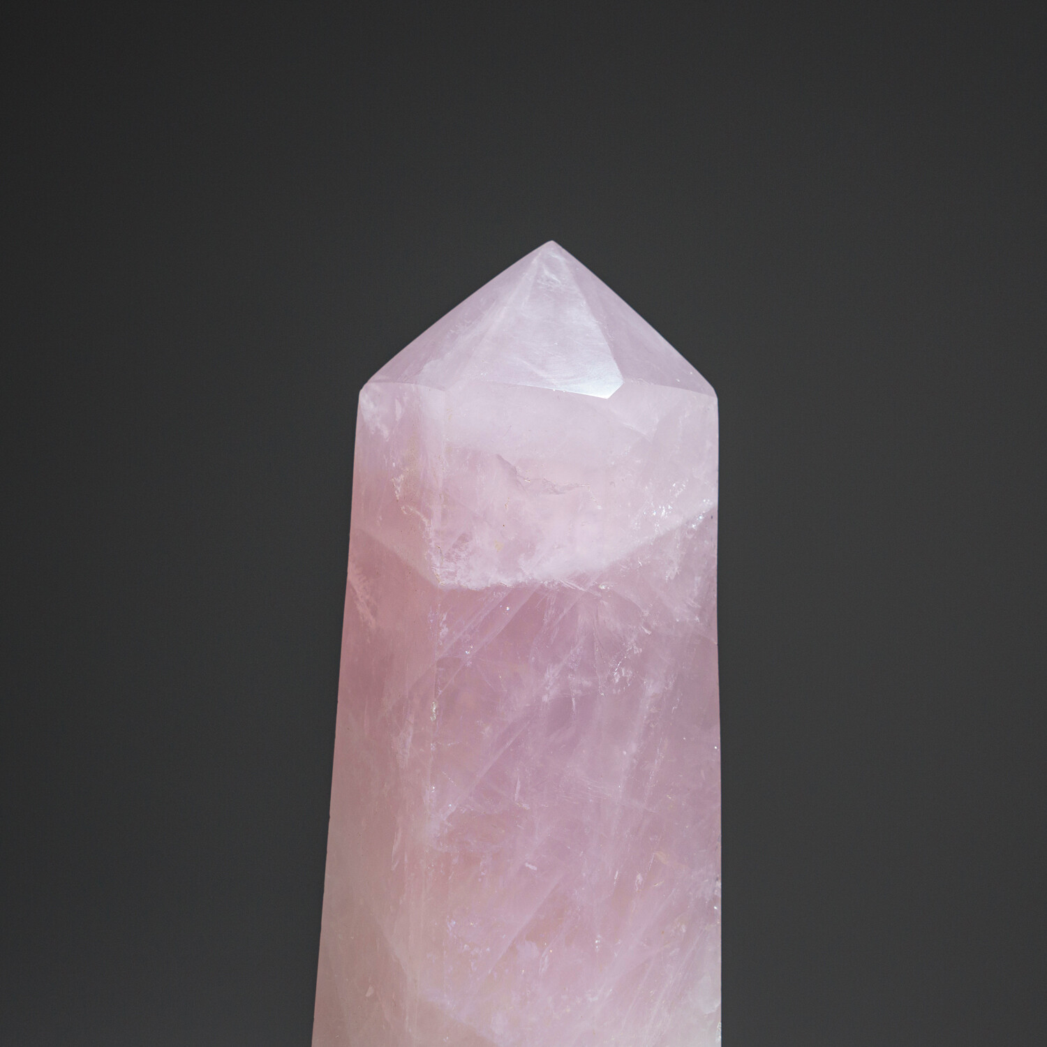 AAA-quality gem transparent polished Brazilian Rose Quartz point. This natural specimen has a super-pink color and a highly-polished mirror face.