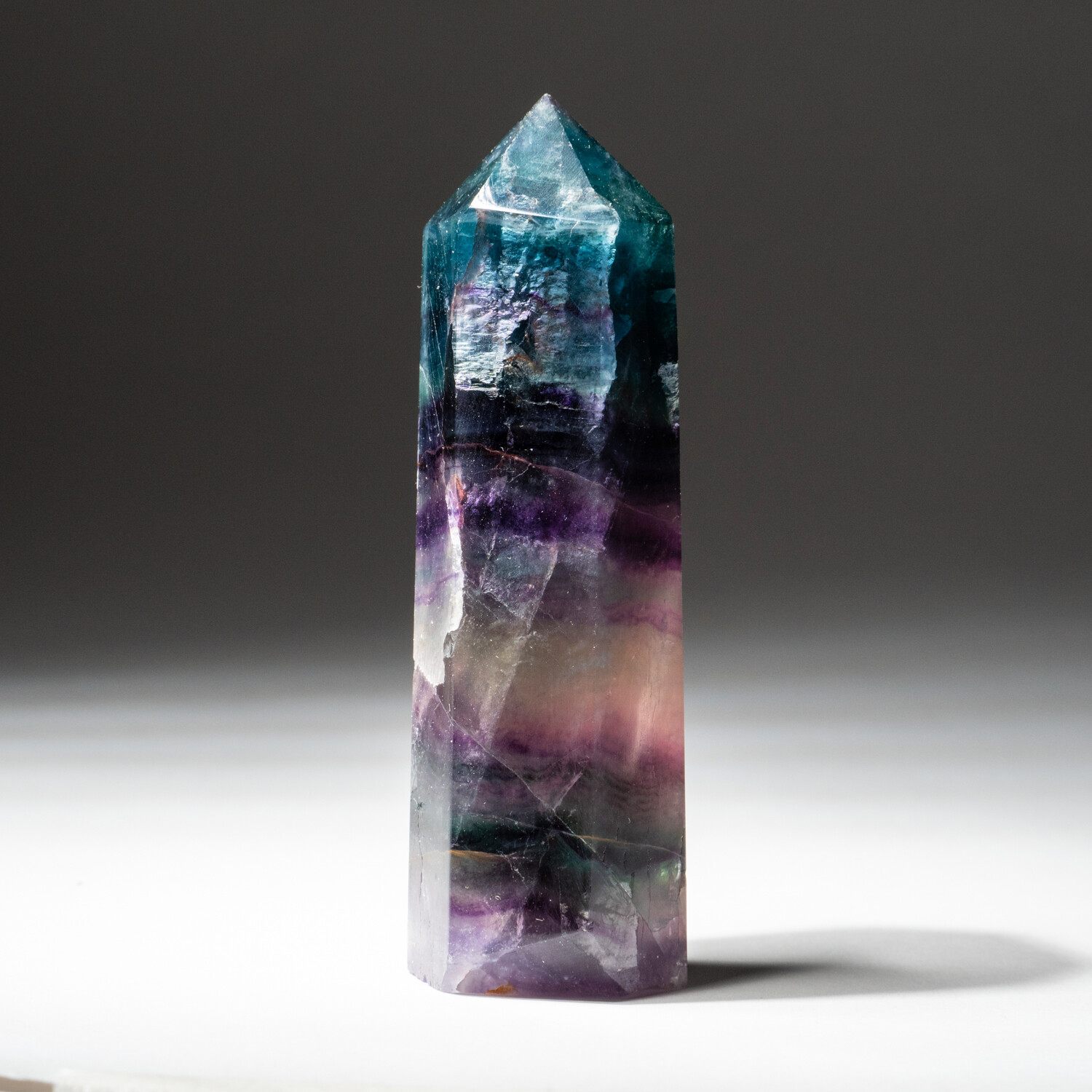 AAA quality, gem translucent purple green fluorite polished into a beautiful point. This specimen has bright rich rainbow color.
