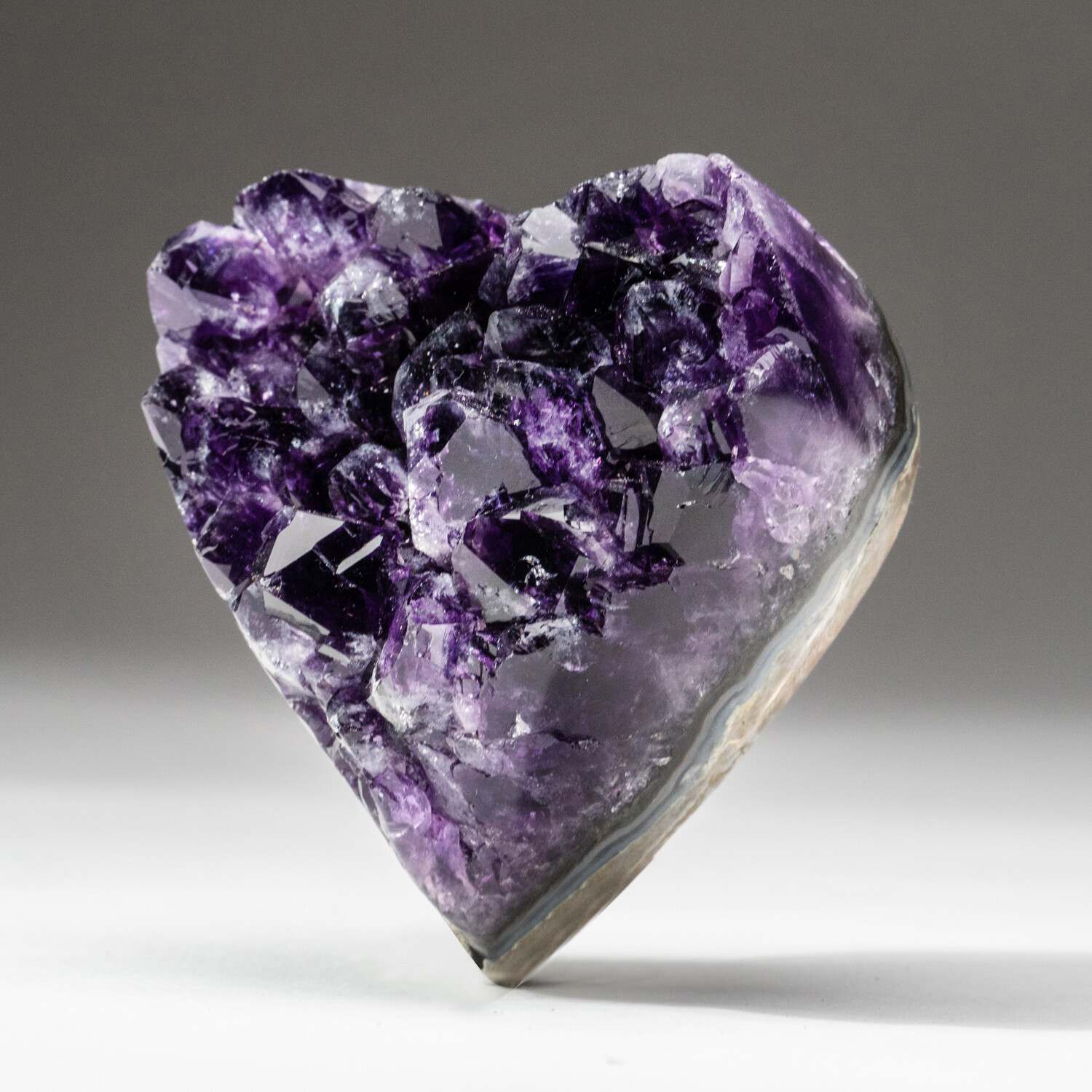 This lustrous cluster of deep-grape Brazilian Amethyst, handmade and formed into a heart shape with a beautiful polished agate rim. The exposed crystals on this heart are very unique, so no two hearts are the same.