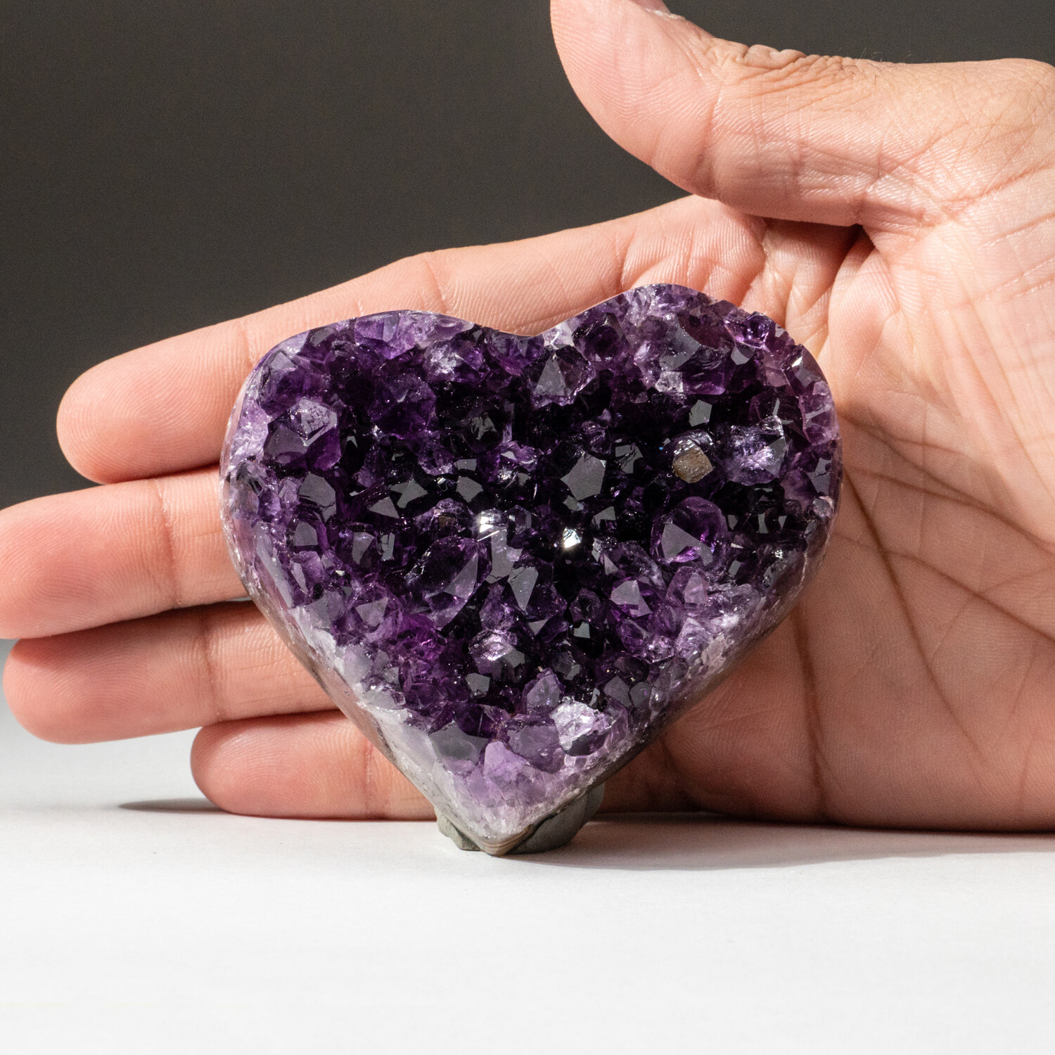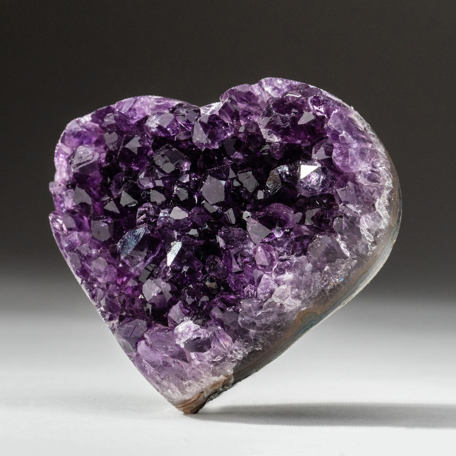 This lustrous cluster of deep-grape Brazilian Amethyst, handmade and formed into a heart shape with a beautiful polished agate rim. The exposed crystals on this heart are very unique, so no two hearts are the same.