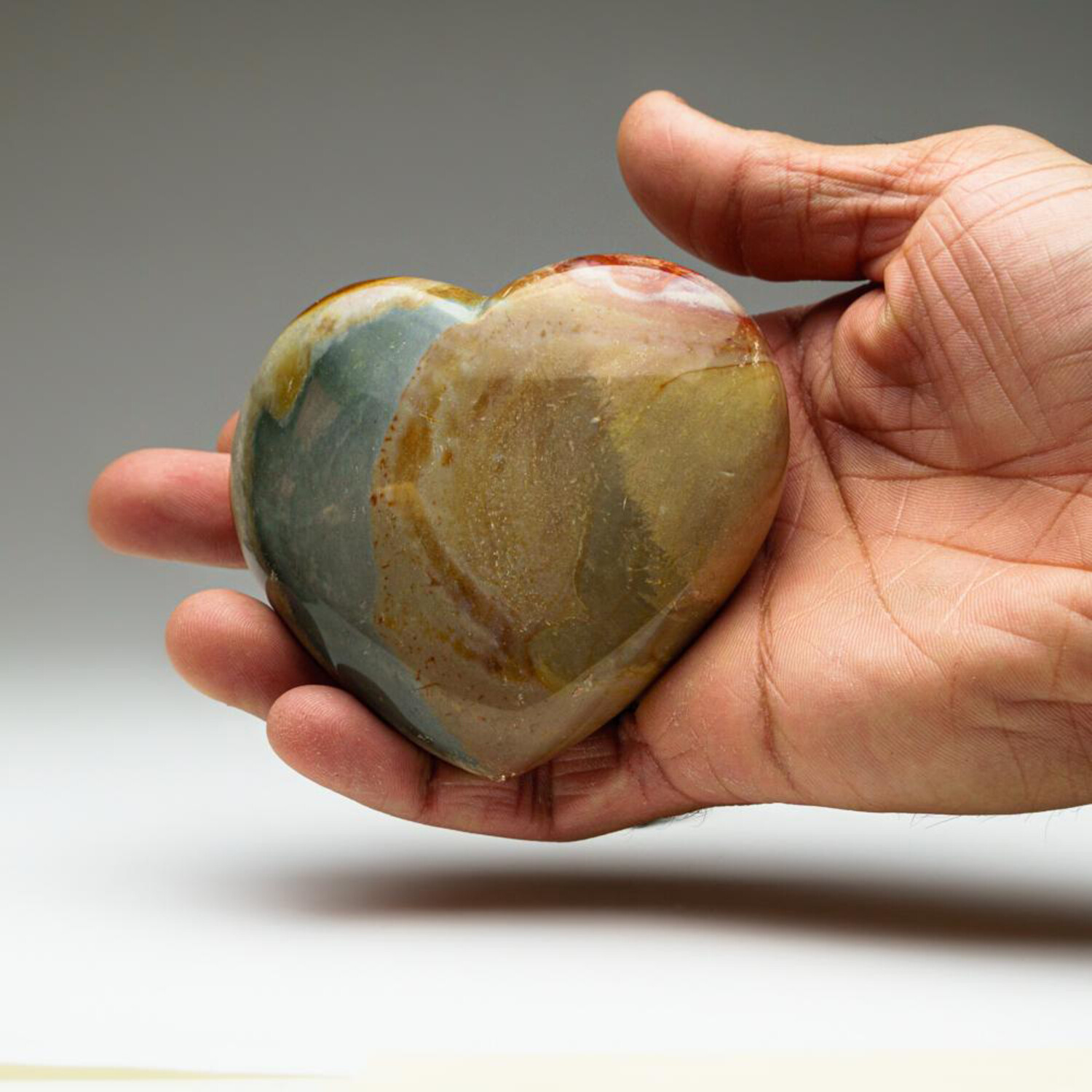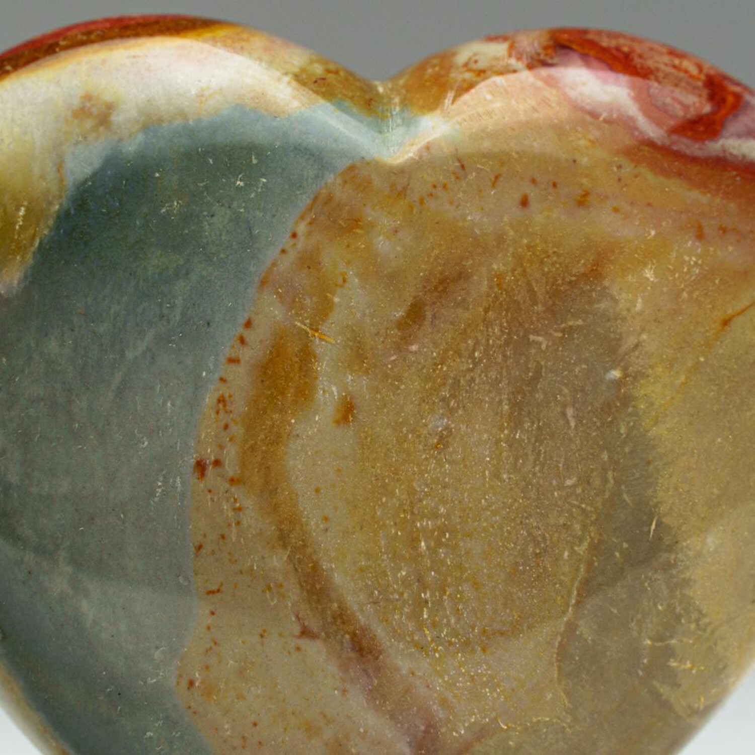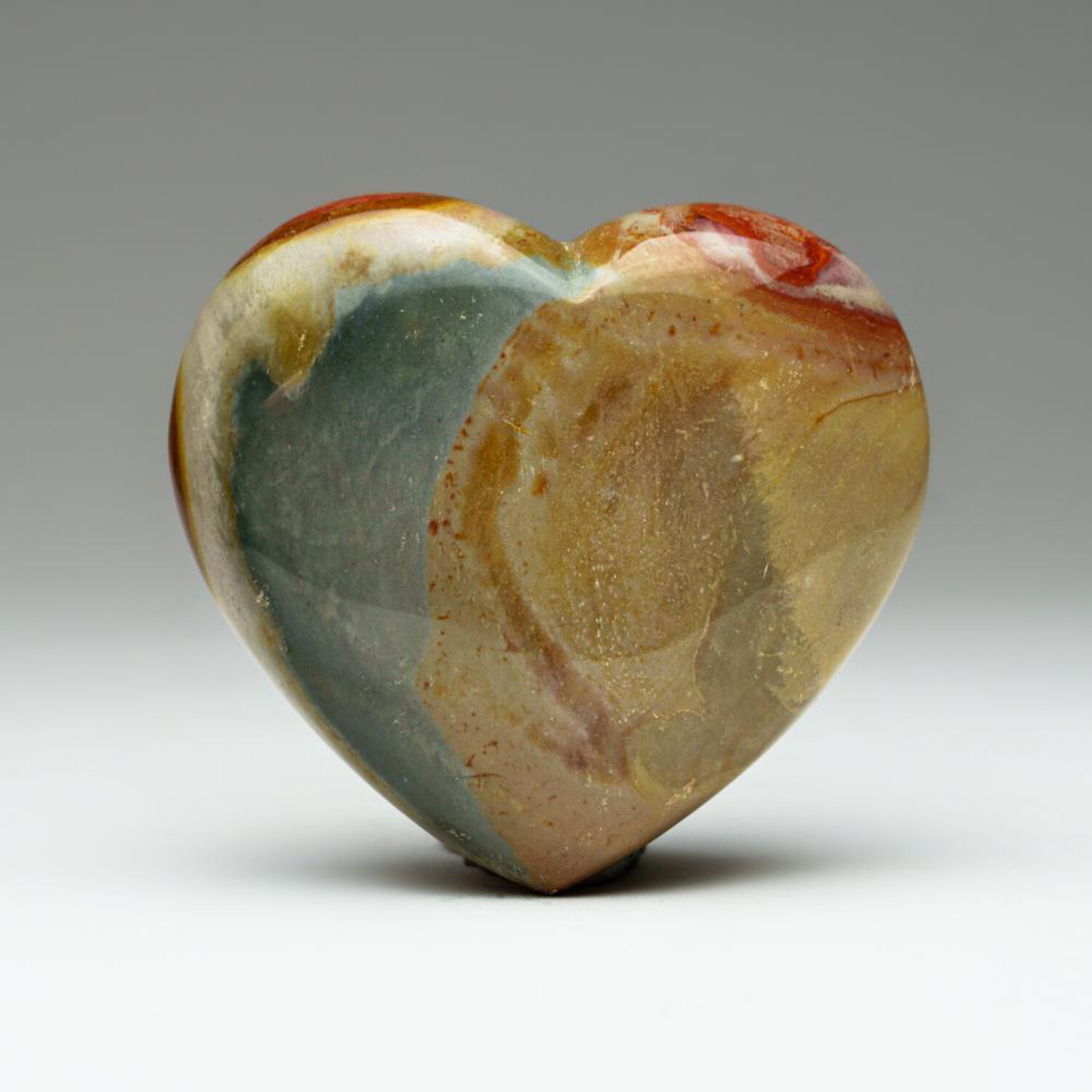 This top AAA quality, hand polished polychrome Jasper heart comes from Madagascar. It's a beautiful multi-colored rock that usually exhibits a circular, eye-shaped, or figurative pattern.