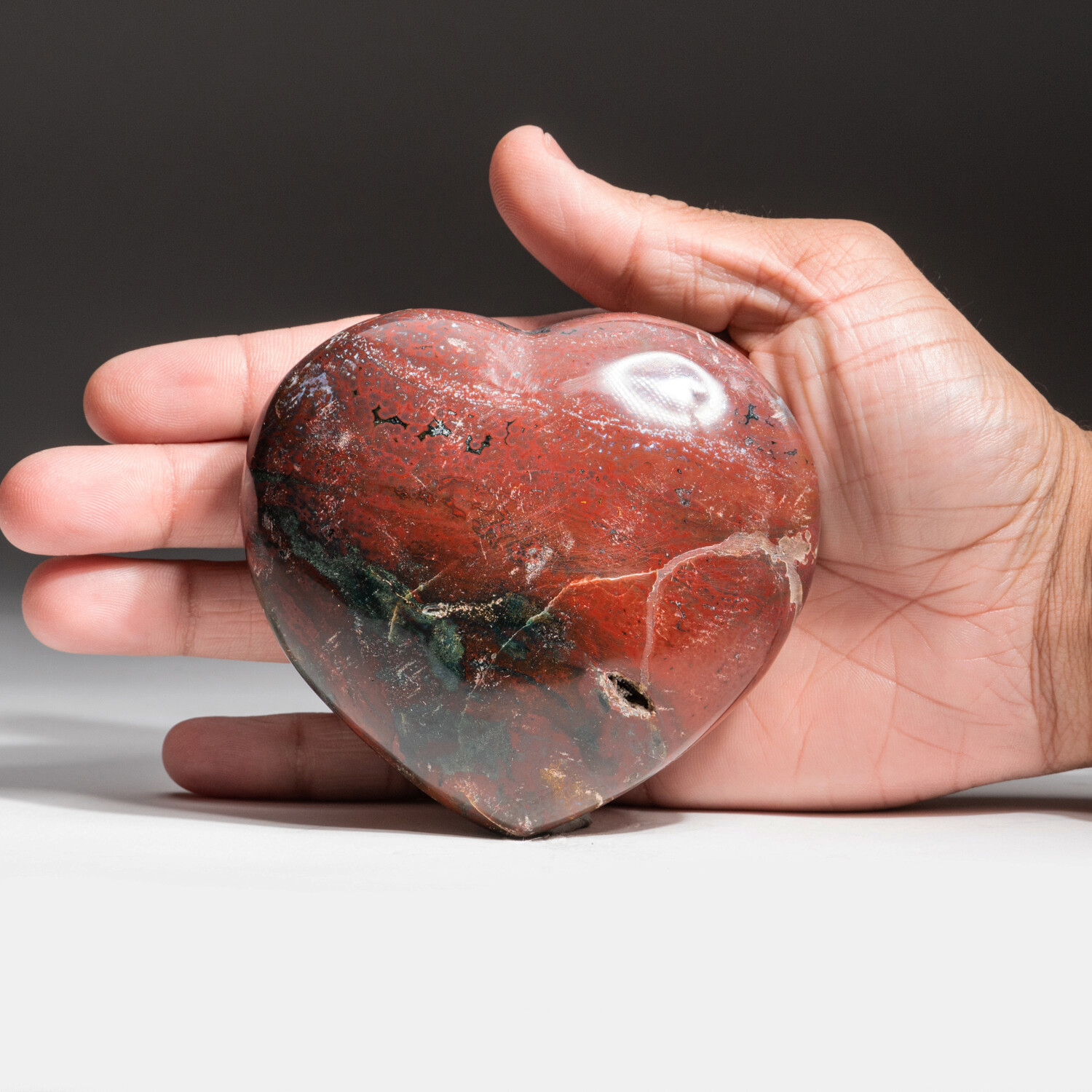 This is a top AAA quality hand polished Red Ocean Jasper heart. It's found in only one place in the world— along the rugged northeast coast of Madagascar. Ocean Jasper is a beautiful gem identified by a unique pattern of eyes, or "orbs" on a swirling, striped background of vibrant color.