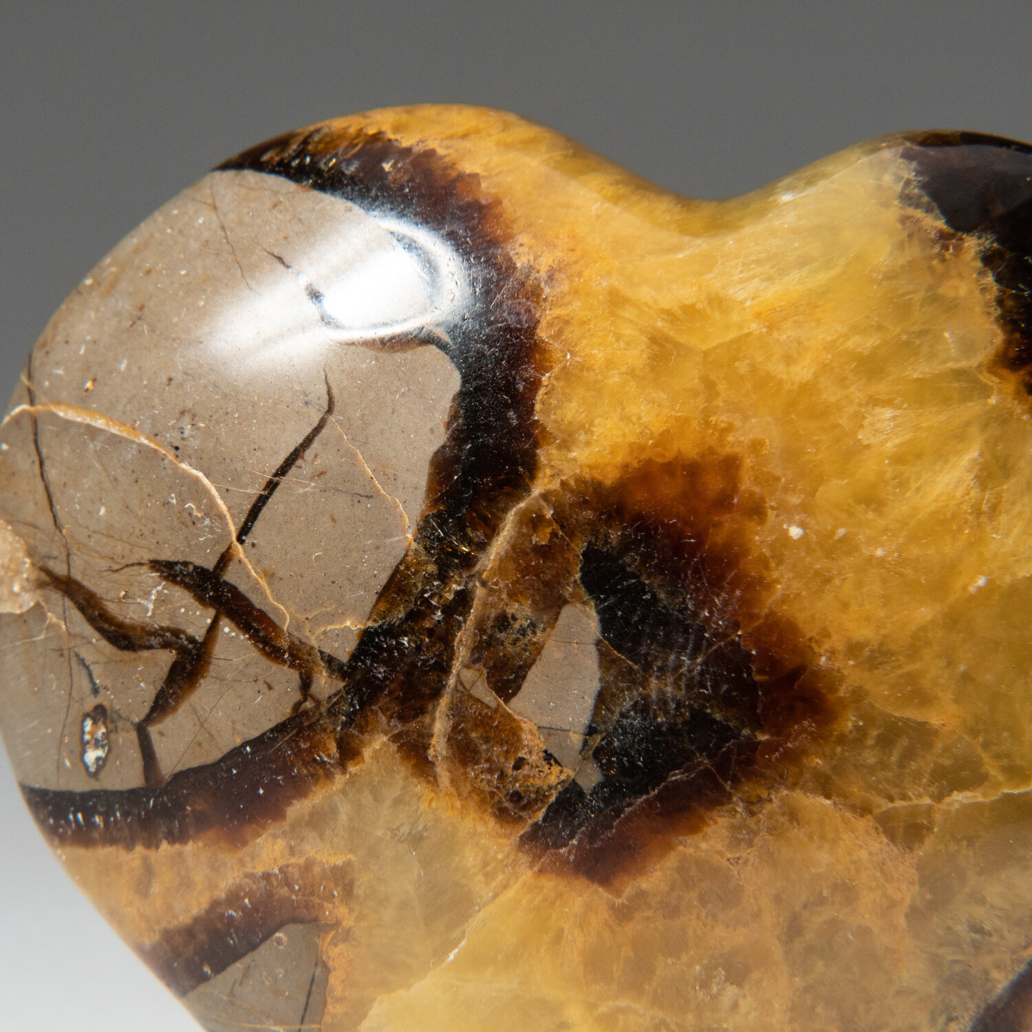 This AAA-quality, hand polished heart-shaped Septarian has very nice yellow calcite with brown aragonite accents. Equipped with an acrylic display stand, it's the perfect gift for any occasion.