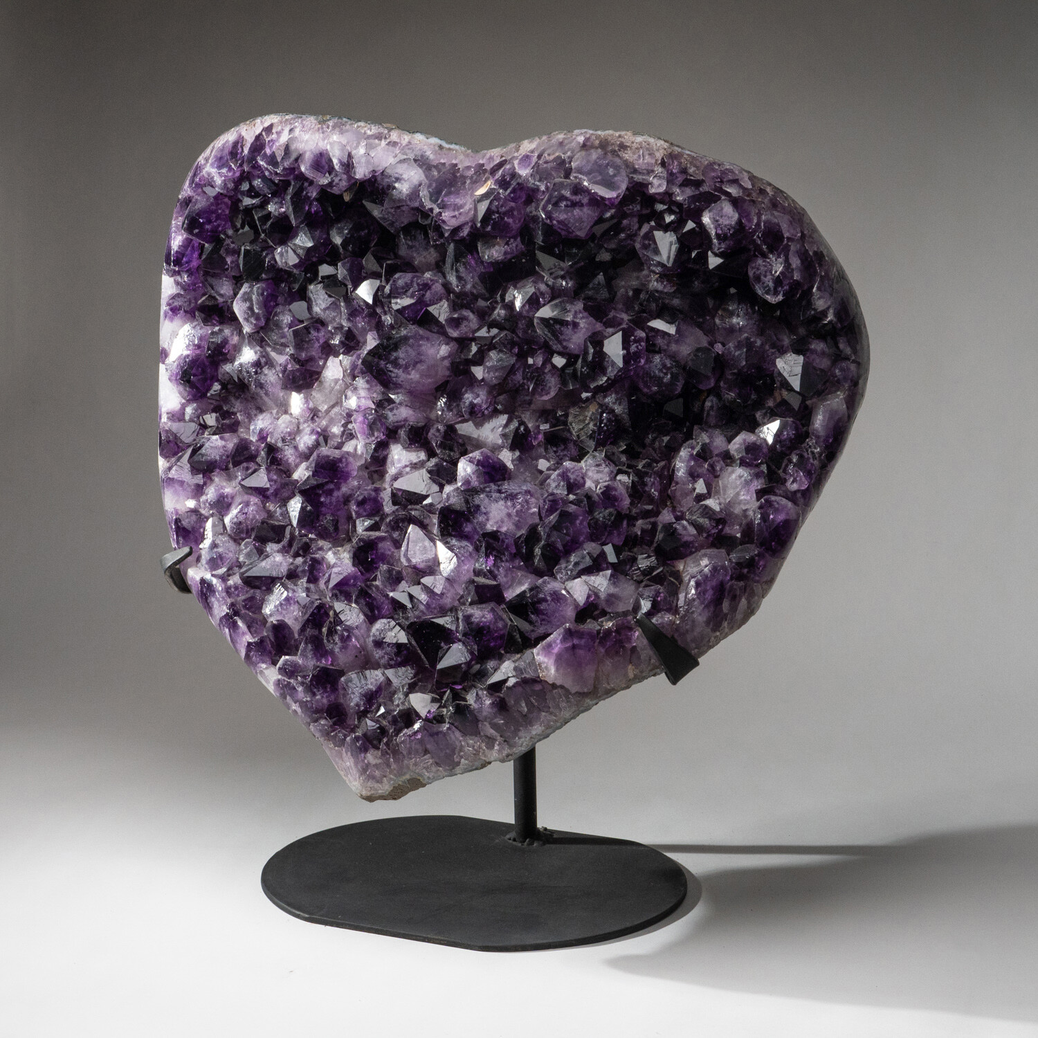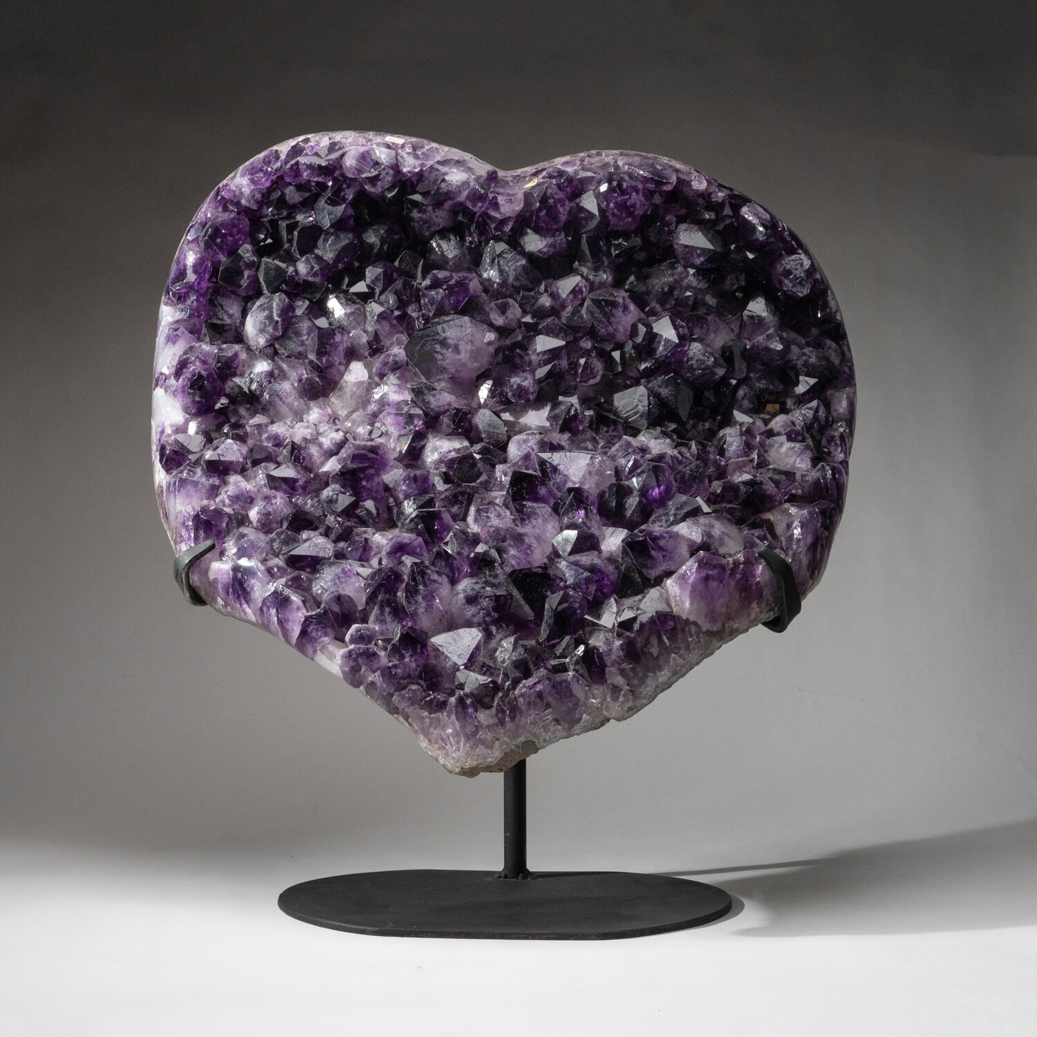 This museum-quality cluster of lustrous, deep-grape Brazilian Amethyst has been shaped into a heart with a beautiful polished rim. The exposed Crystals on this heart are extremely large and unique, so new two hearts are the same. Equipped with a custom metal stand, this would be a focal point when displayed in any interior.