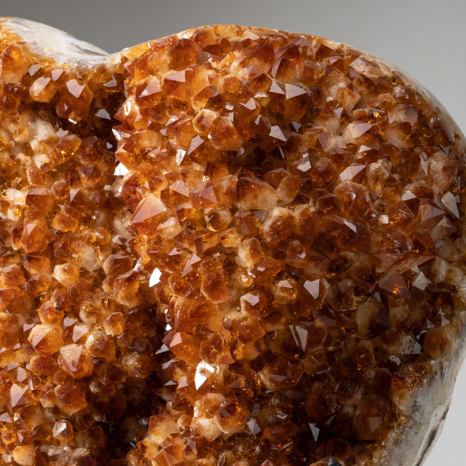 Handmade and formed into a heart shape, this museum-quality lustrous cluster of Uruguayan Citrine crystals features a polished agate rim. Equipped with a custom metal stand, this would be a focal point when displayed in any interior.