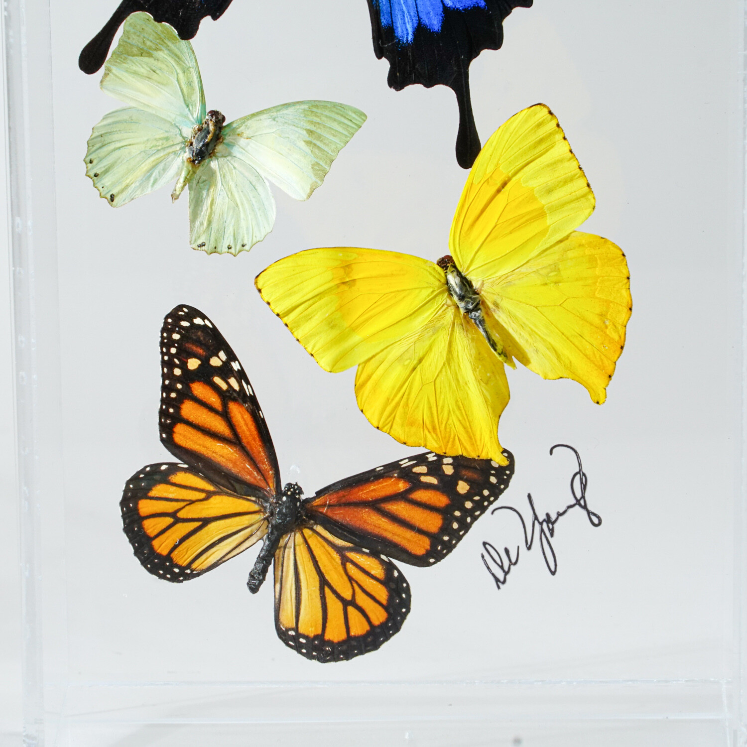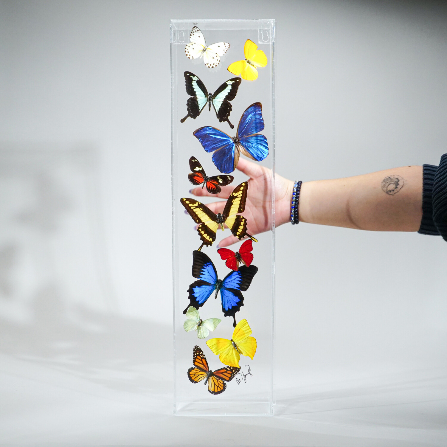 This impressive display features 11 beautifully preserved butterflies in a hermetically sealed acrylic shadow box with a keyhole hook at the top for mounting on a wall. Each stunning display includes real exotic butterflies raised on butterfly farms in Peru and collected only after they have lived out their natural lifespan. In doing this, the butterflies can fully mature and reproduce free of natural predators. No endangered species are used in these designs.