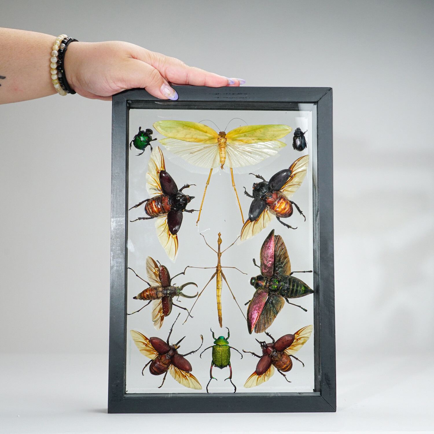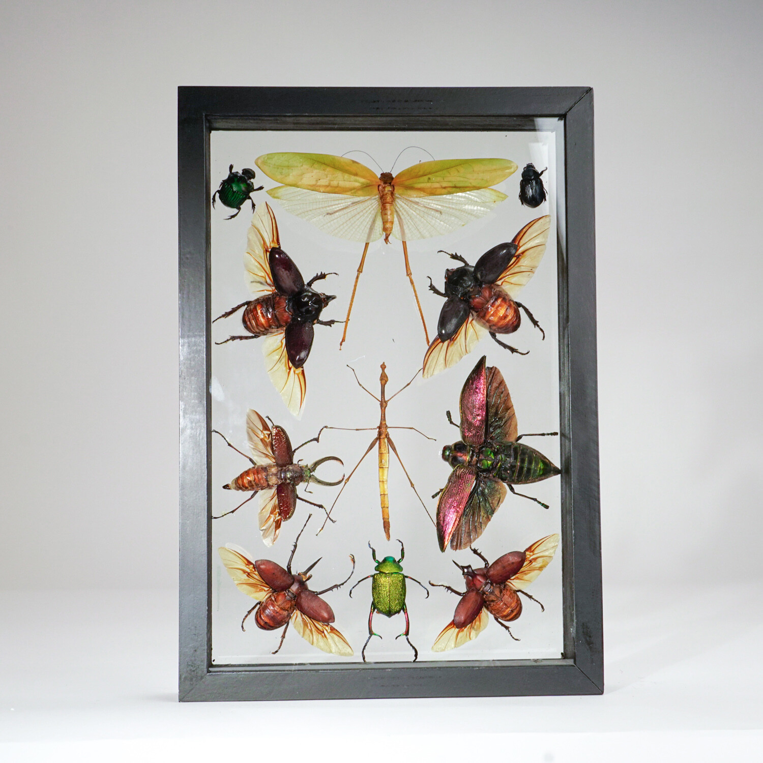 Get a closer look at the intricate details and colors of natural specimens with a display piece unlike any other. This one-of-a-kind piece features a variety of 11 perfectly preserved insects in a display frame that can be observed from both sides. The frame also has a keyhole hook for convenient display.