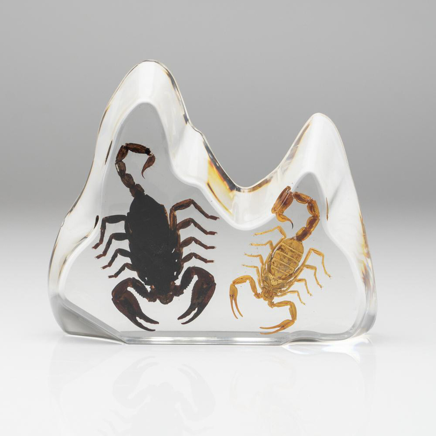 Get a closer look at the intricate details and colors of natural specimens with a display piece unlike any other. This freeform features a real Asian Forest Scorpion and Golden Scorpion permanently encased in crystal clear lucite. The freestyle design gives this item a unique look that stands out wherever it is displayed.