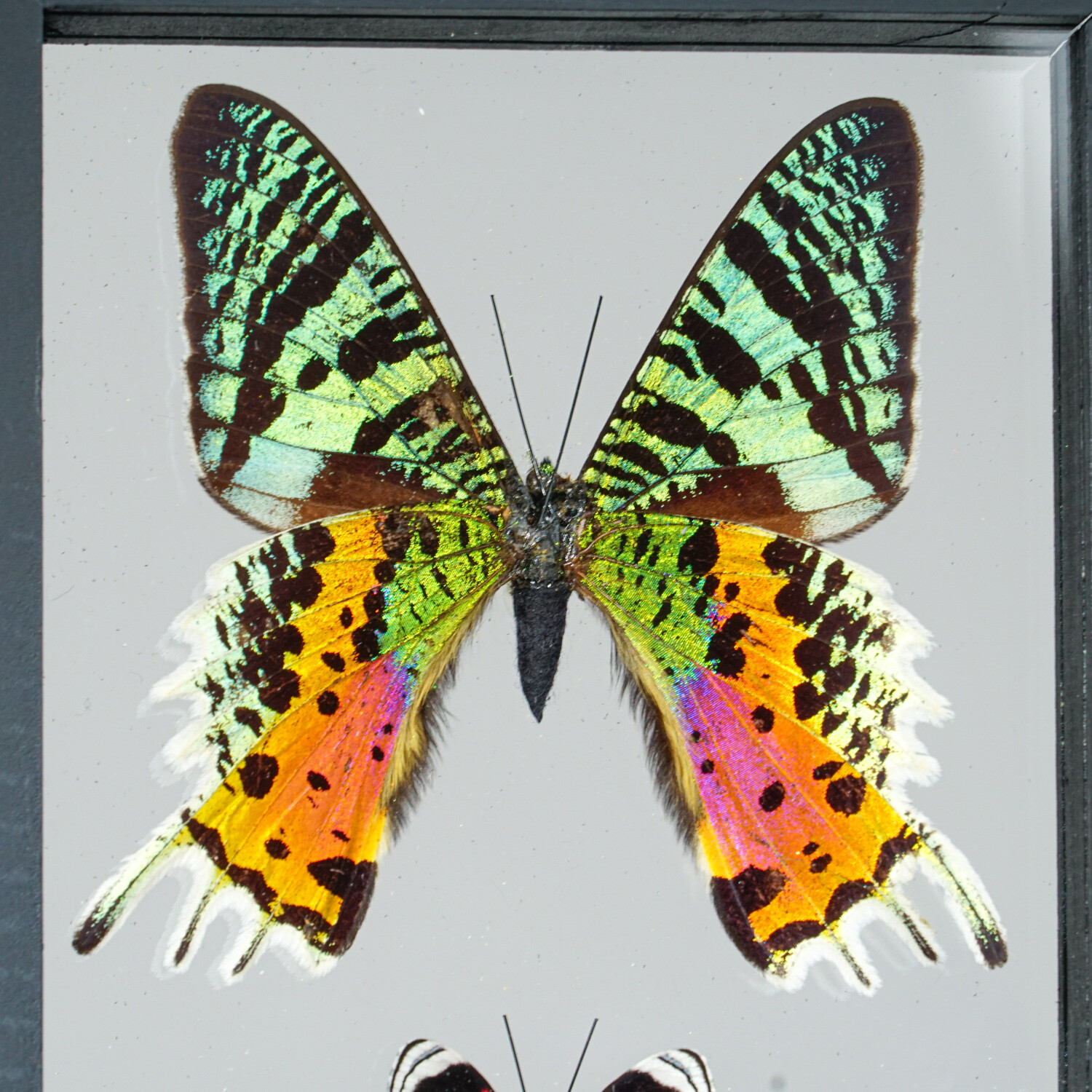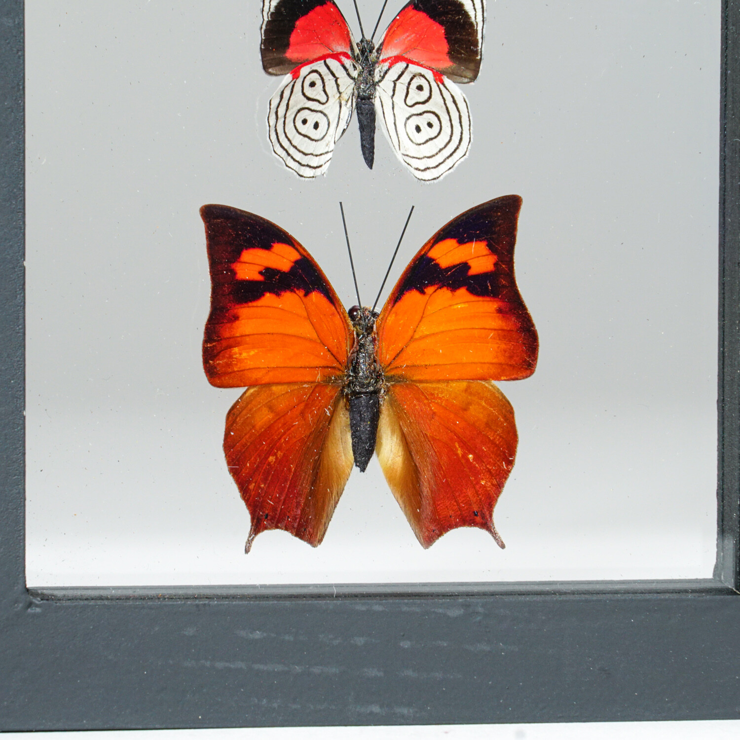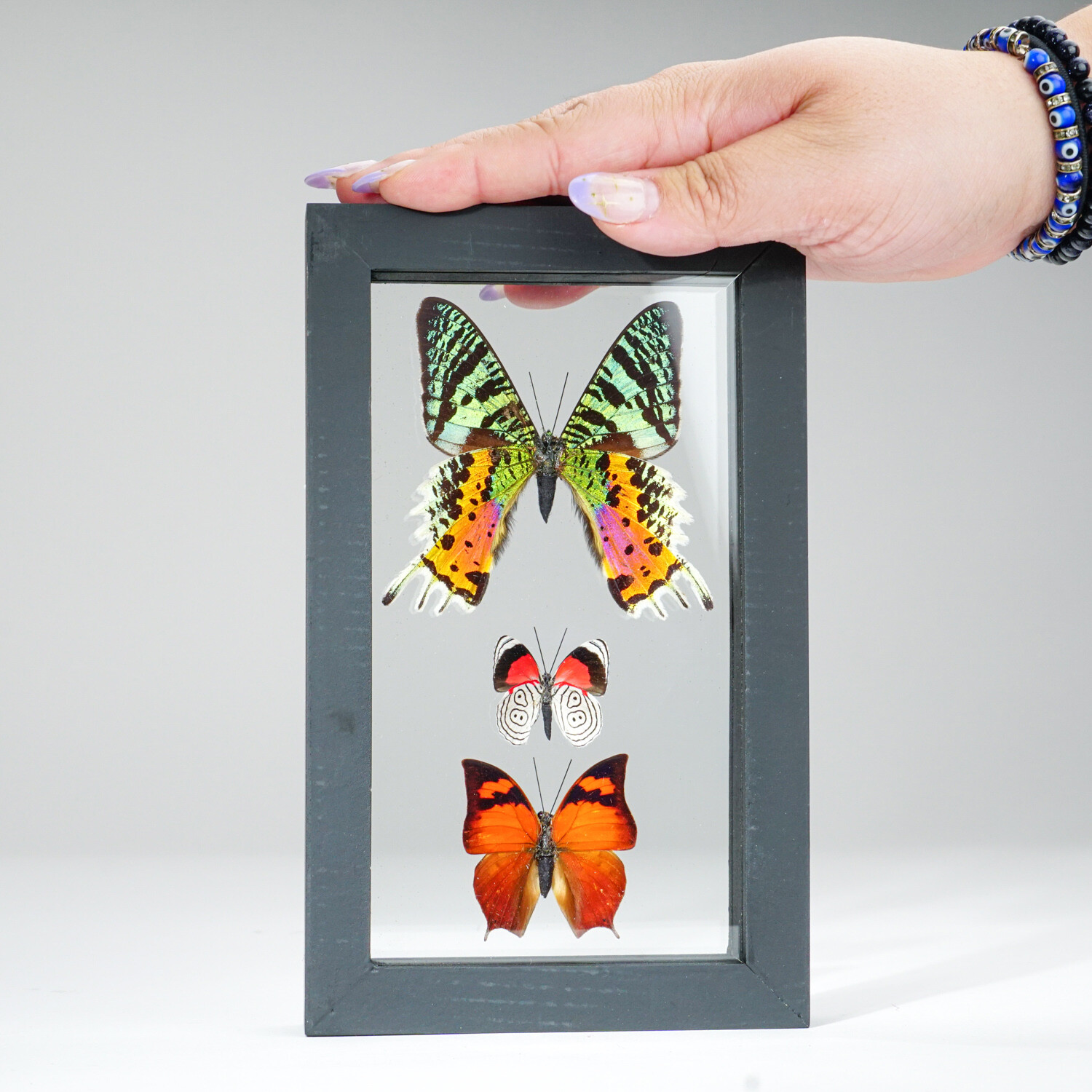 Get a closer look at the intricate details and colors of natural specimens with a display piece unlike any other. This one-of-a-kind piece includes 3 beautifully preserved butterflies in a hermetically sealed acrylic shadow box with a keyhole hook at the top for mounting on a wall. Each stunning display includes real exotic butterflies raised on butterfly farms in Peru and collected only after they have lived out their natural lifespan. In doing this, the butterflies can fully mature and reproduce free of natural predators. No endangered species are used in these designs.