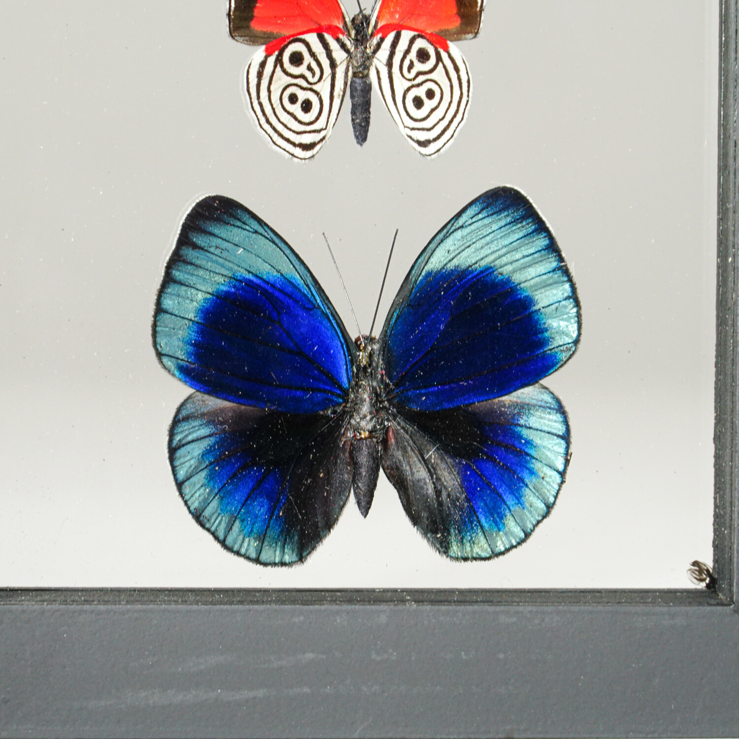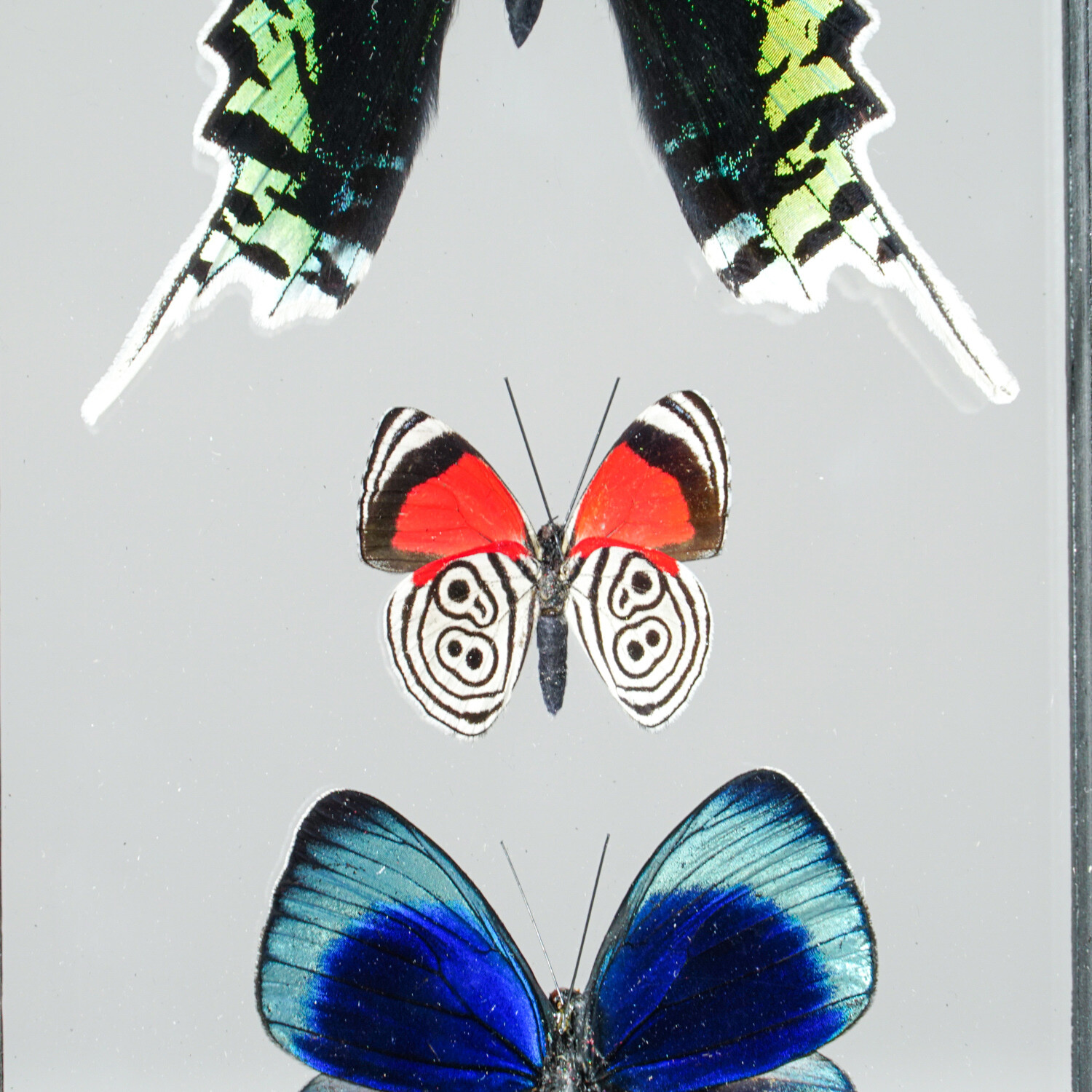Get a closer look at the intricate details and colors of natural specimens with a display piece unlike any other. This one-of-a-kind piece includes 3 beautifully preserved butterflies in a hermetically sealed acrylic shadow box with a keyhole hook at the top for mounting on a wall. Each stunning display includes real exotic butterflies raised on butterfly farms in Peru and collected only after they have lived out their natural lifespan. In doing this, the butterflies can fully mature and reproduce free of natural predators. No endangered species are used in these designs.