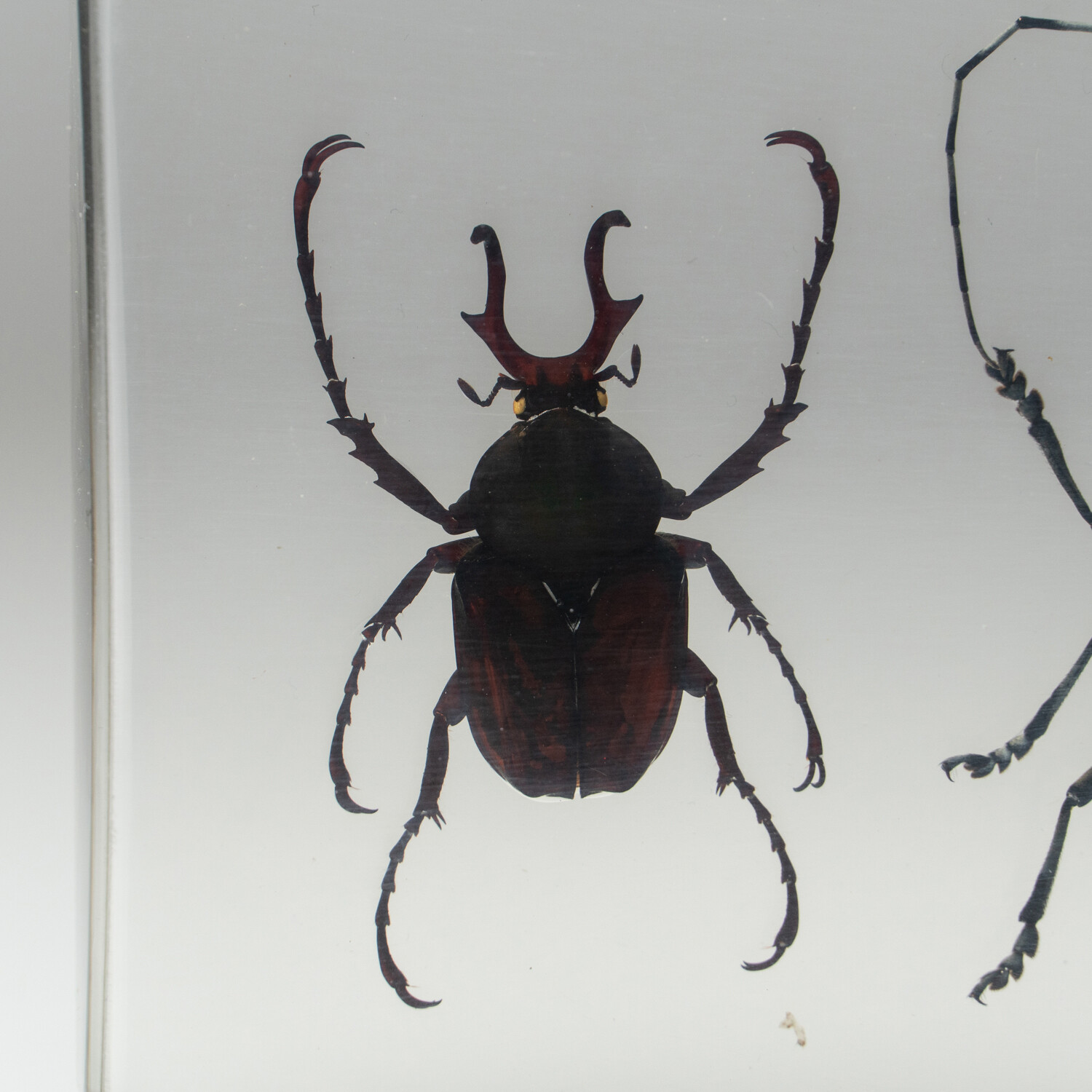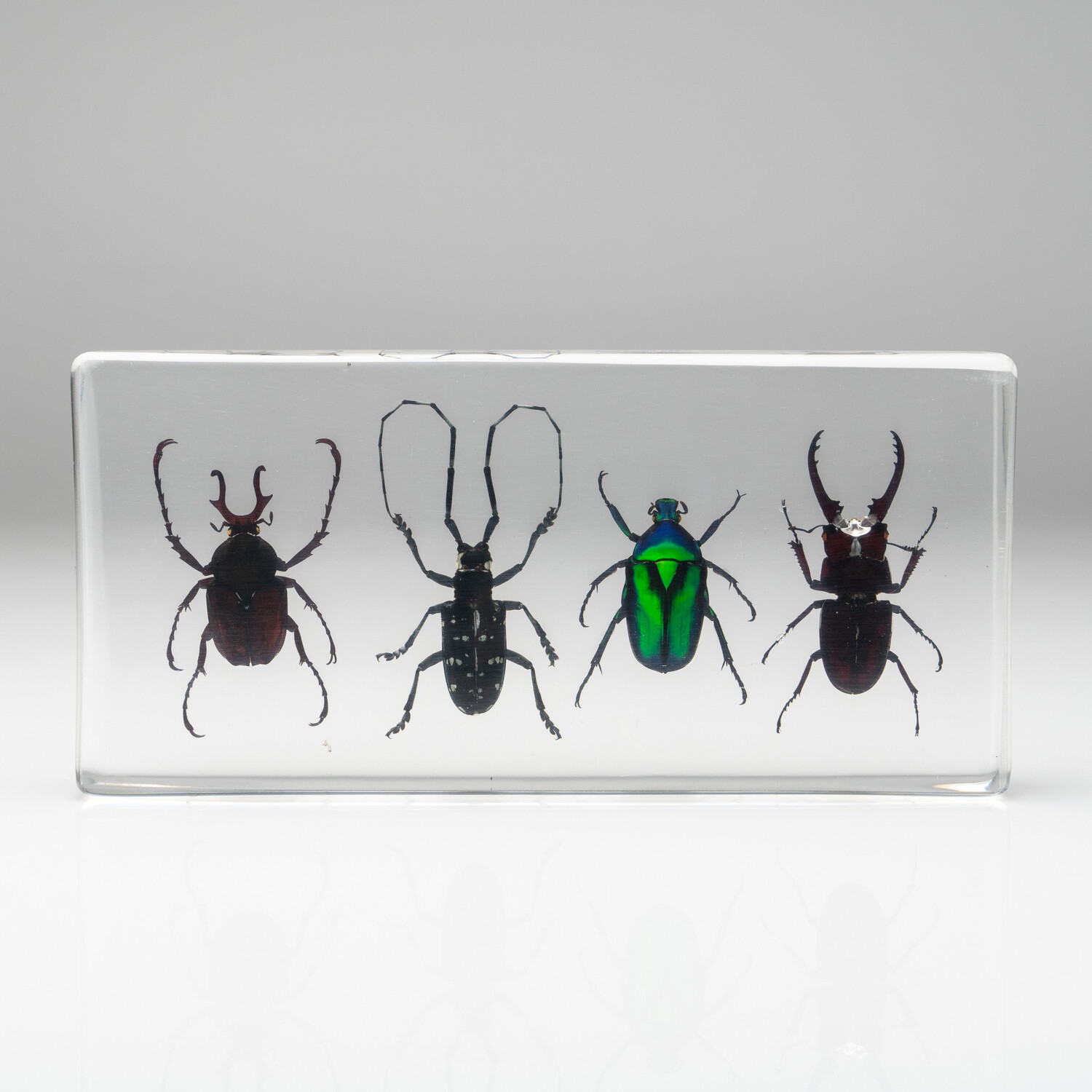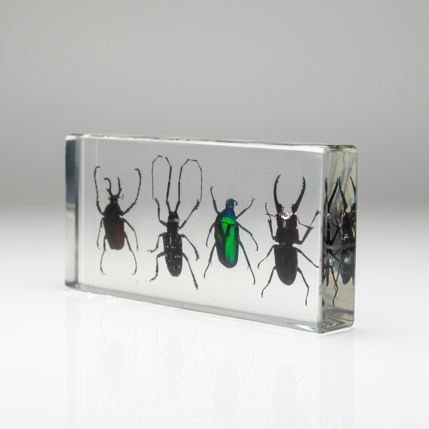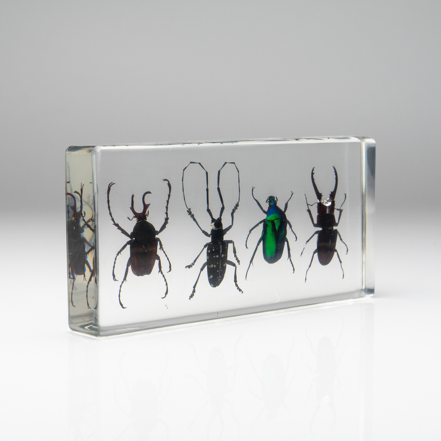 Get a closer look at the intricate details and colors of natural specimens with a display piece unlike any other. This large desk decoration features 4 beetles—Antler, Long-Horned, Green Chafer, Stag—perfectly preserved in clear acrylic so they can be viewed from all sides.