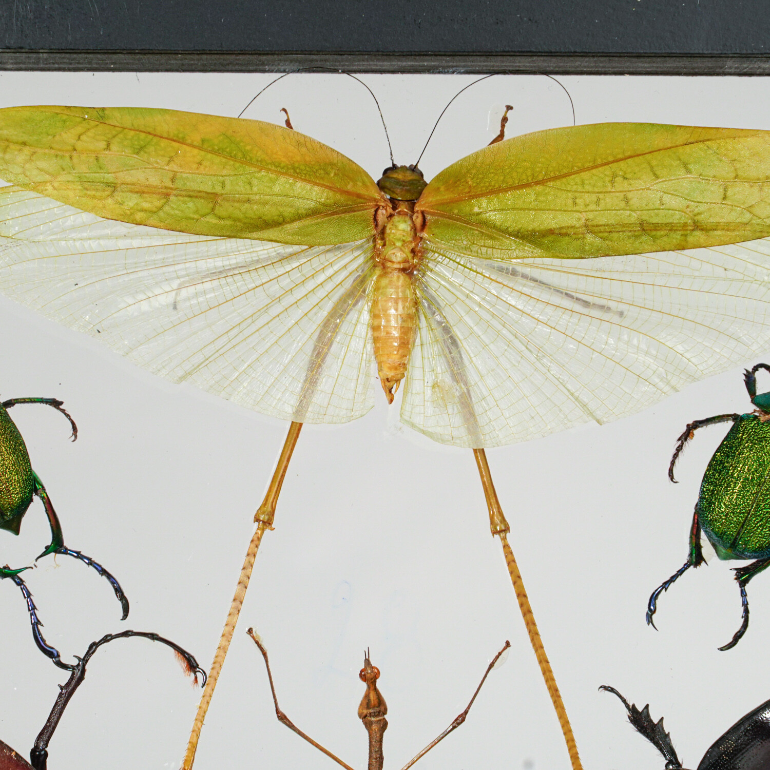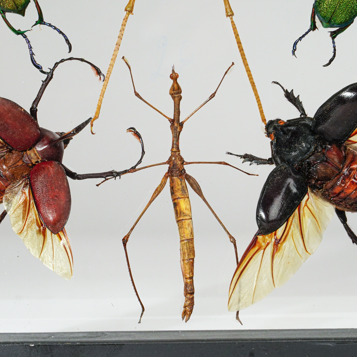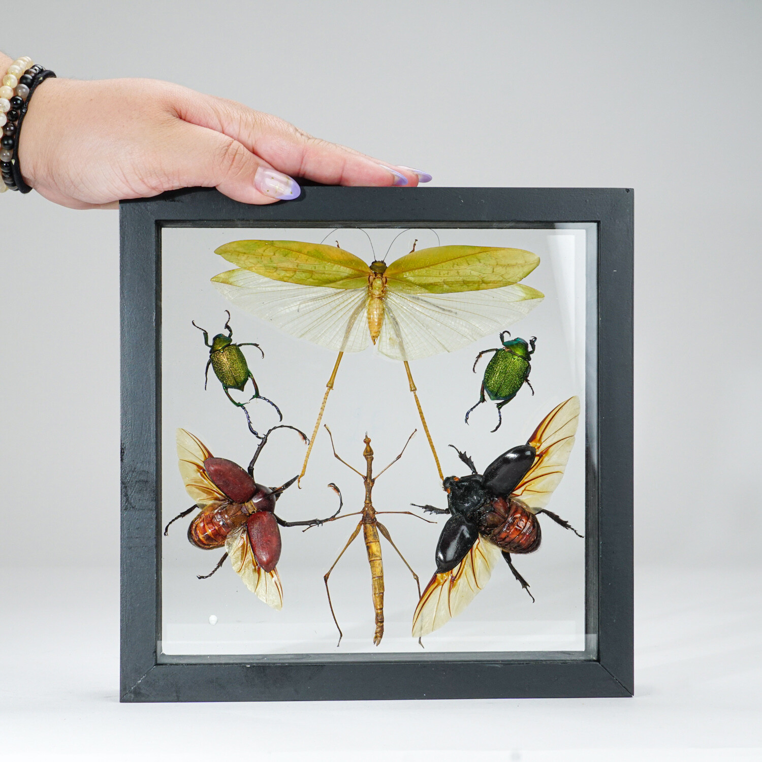 Get a closer look at the intricate details and colors of natural specimens with a display piece unlike any other. This one-of-a-kind piece features 6 perfectly preserved insects— 2 Chrysophlora, Steirodon. Golofa Eacus, Apioscelis Bulbosa, and Enema Pan. The frame also includes a keyhole hook at the top for mounting the display on a wall.