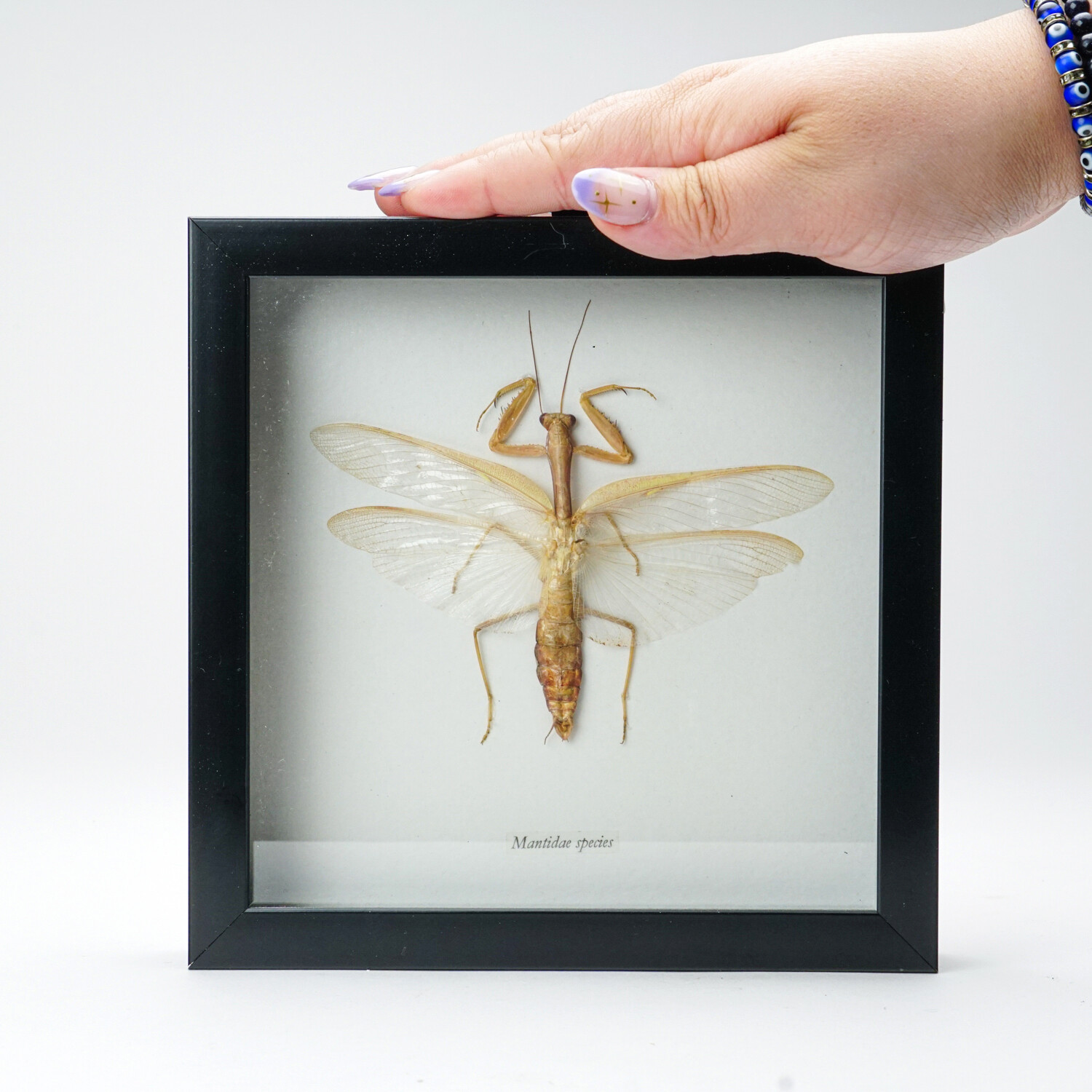 Get a closer look at the intricate details and colors of natural specimens with a display piece unlike any other. This one-of-a-kind piece features a perfectly preserved Mantis presented in a frame with keyhole hook for convenient wall-mounting.
