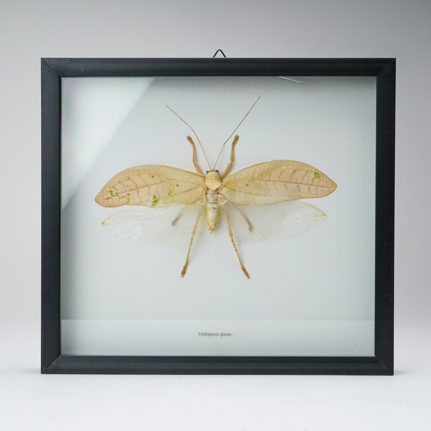 Get a closer look at the intricate details and colors of natural specimens with a display piece unlike any other. This one-of-a-kind piece features a perfectly preserved Orthoptera presented in a frame with keyhole hook for convenient wall-mounting.