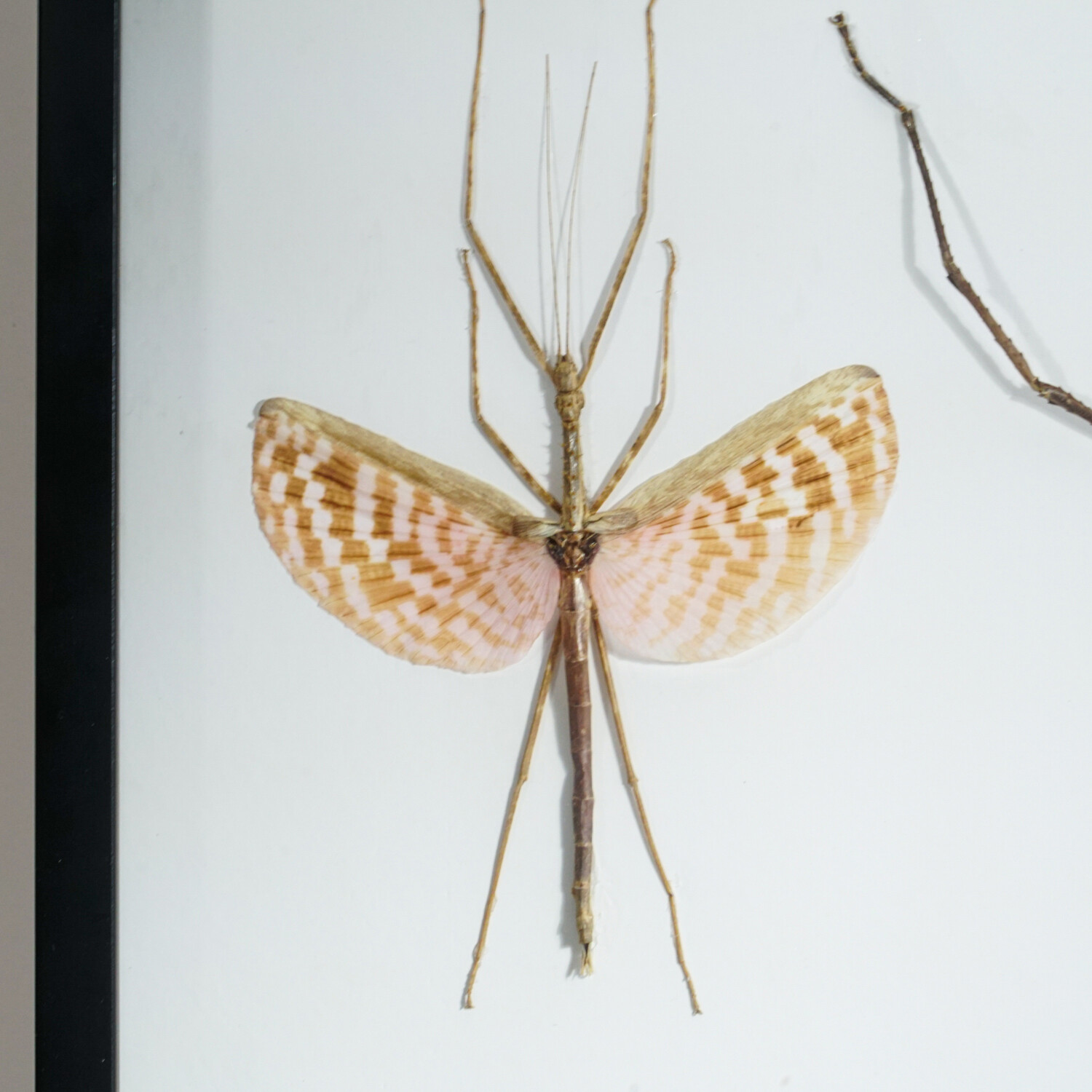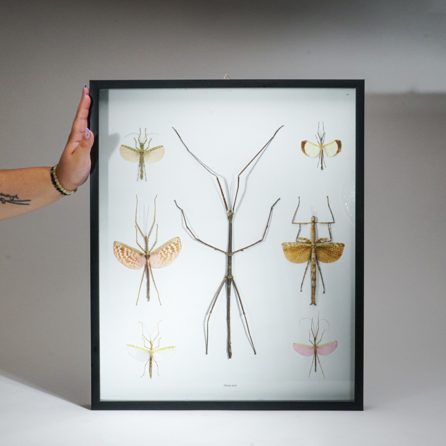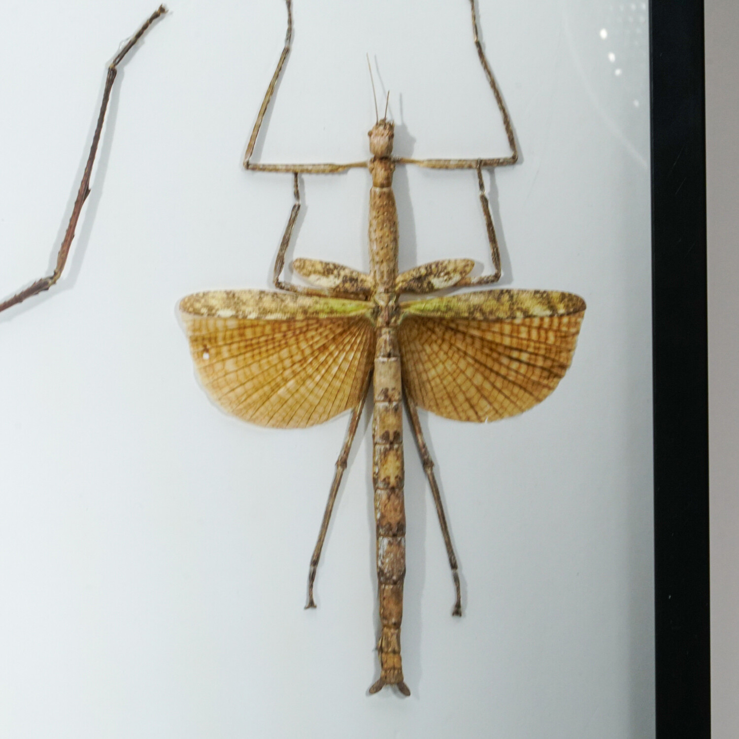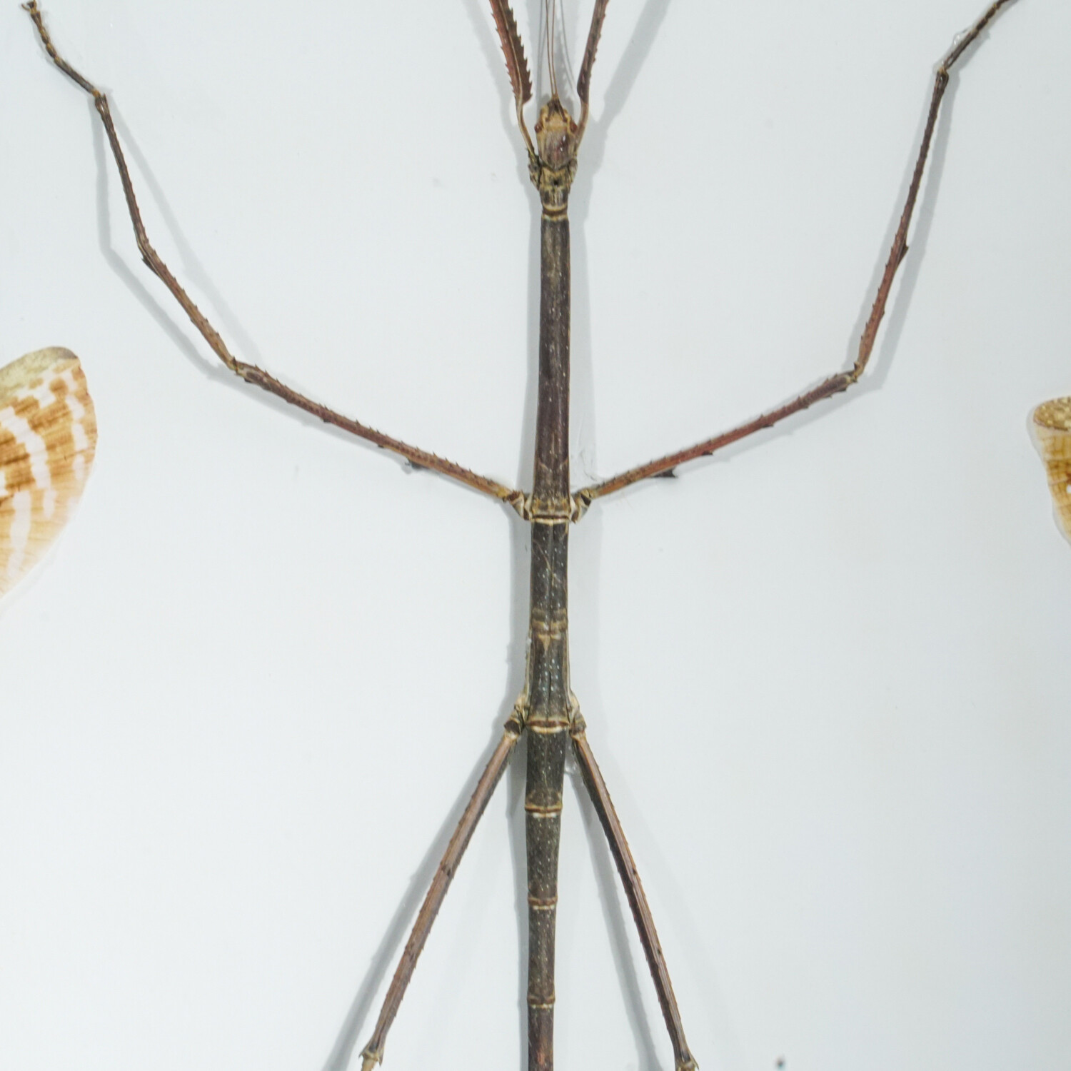 Get a closer look at the intricate details and colors of natural specimens with a display piece unlike any other. This one-of-a-kind piece features genuine Giant Stick Bugs in a display with a keyhole hook at the top for mounting on a wall.