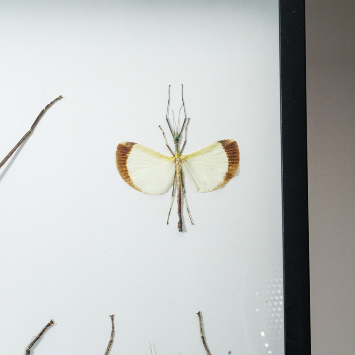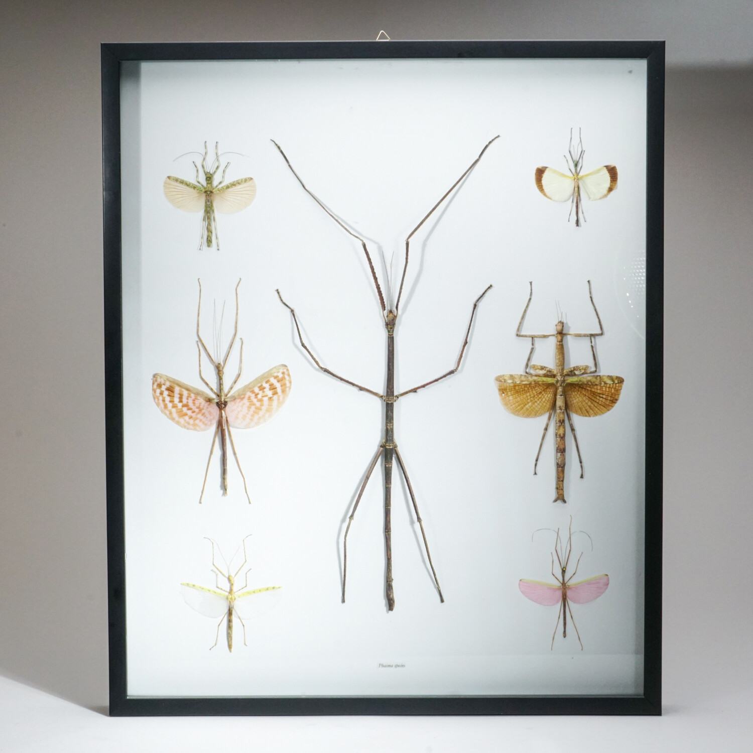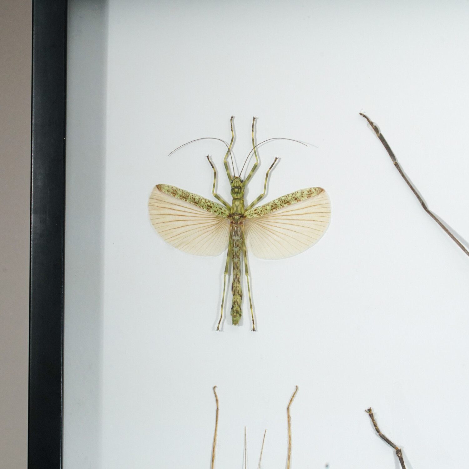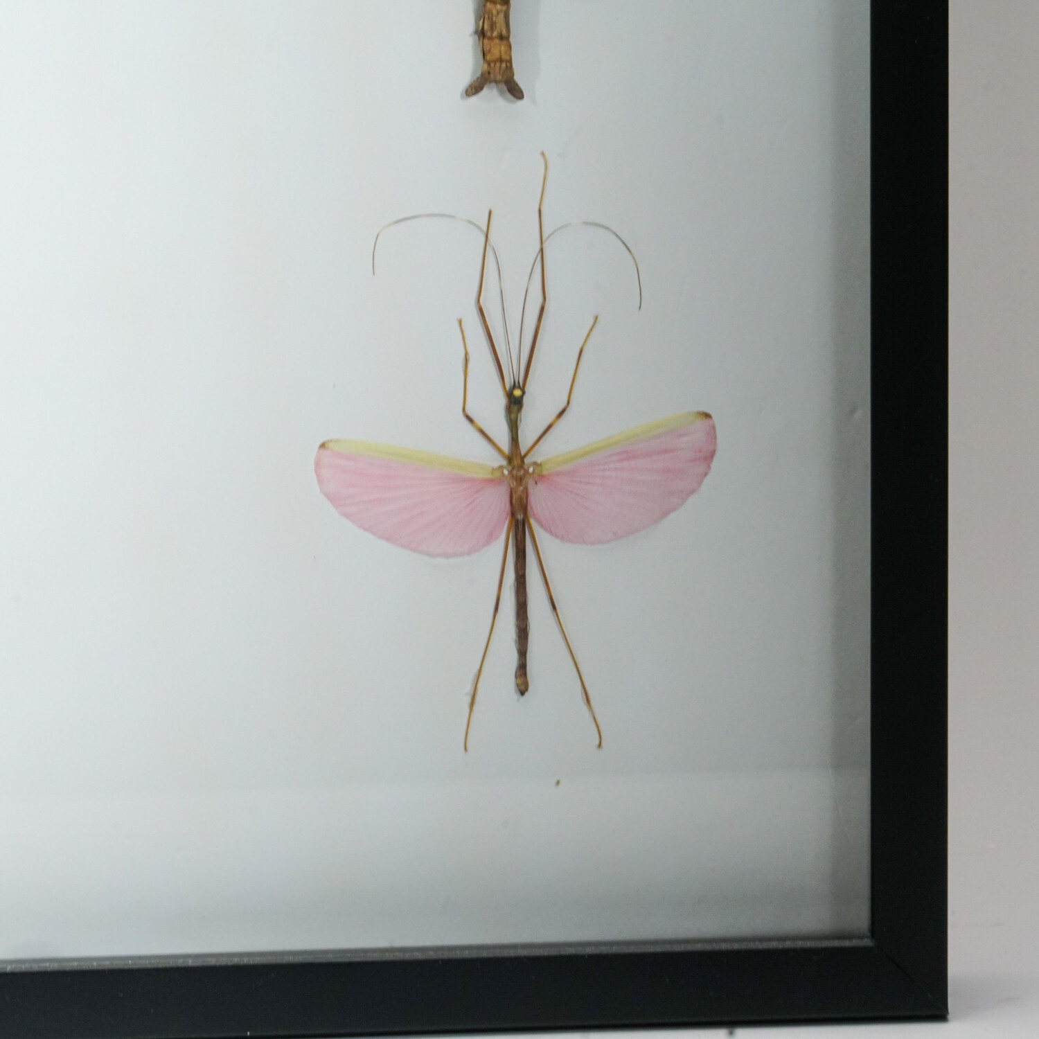Get a closer look at the intricate details and colors of natural specimens with a display piece unlike any other. This one-of-a-kind piece features genuine Giant Stick Bugs in a display with a keyhole hook at the top for mounting on a wall.