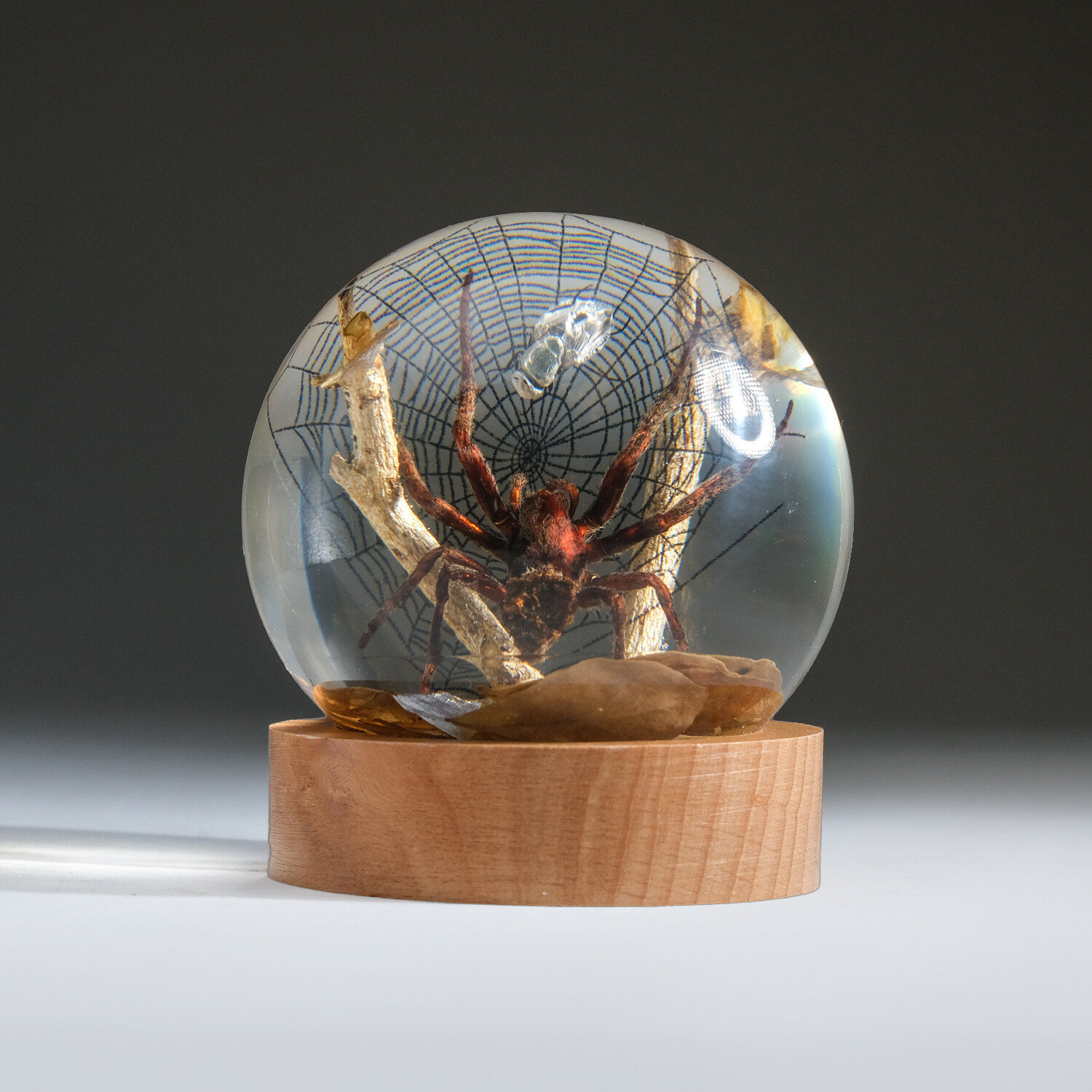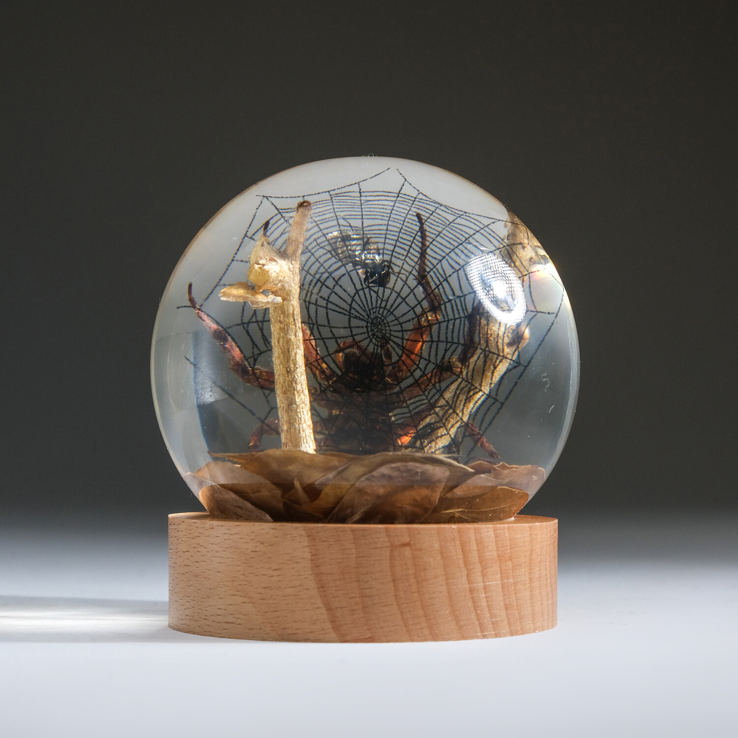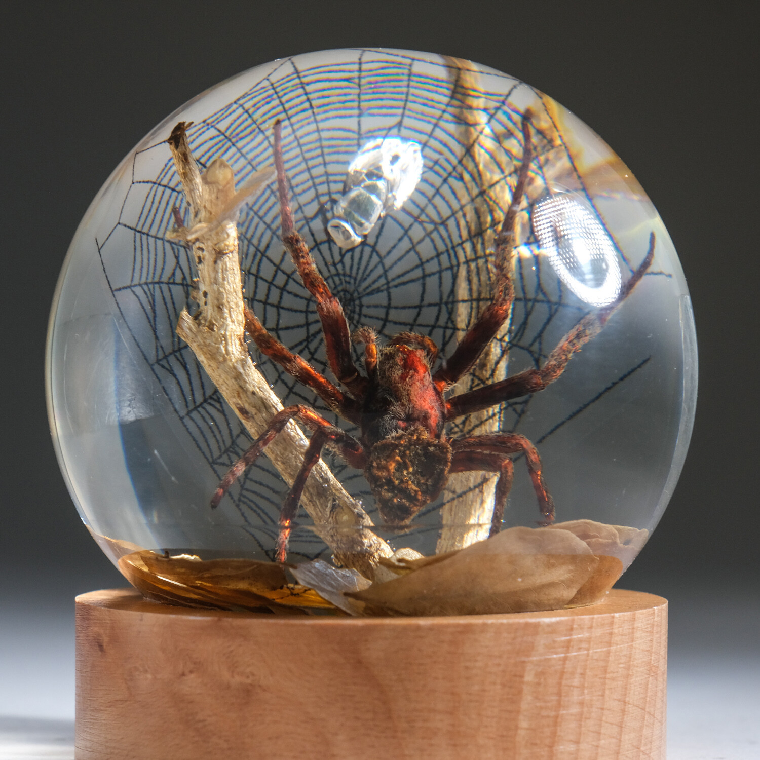 Genuine Spider w/ Web and Fly in Globe with Stand