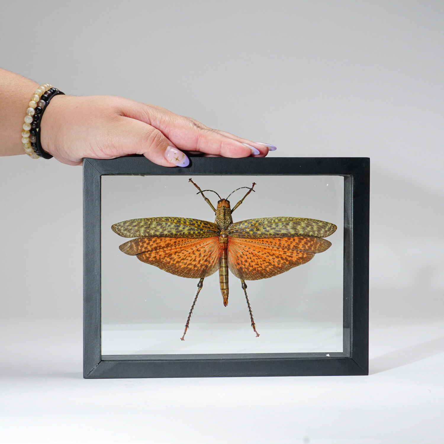 Get a closer look at the intricate details and colors of natural specimens with a display piece unlike any other. This one-of-a-kind piece features a genuine Giant Grasshopper perfectly preserved in a display frame where it can be observed from both sides. The frame also has a keyhole hook for convenient display.