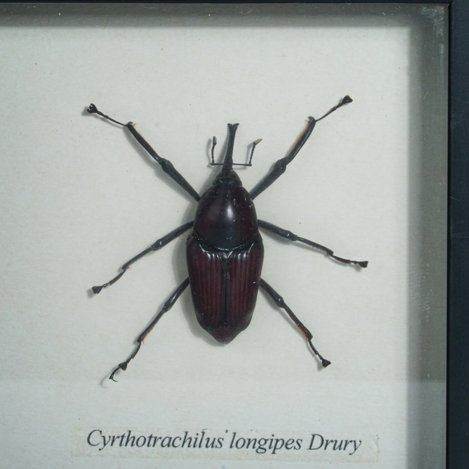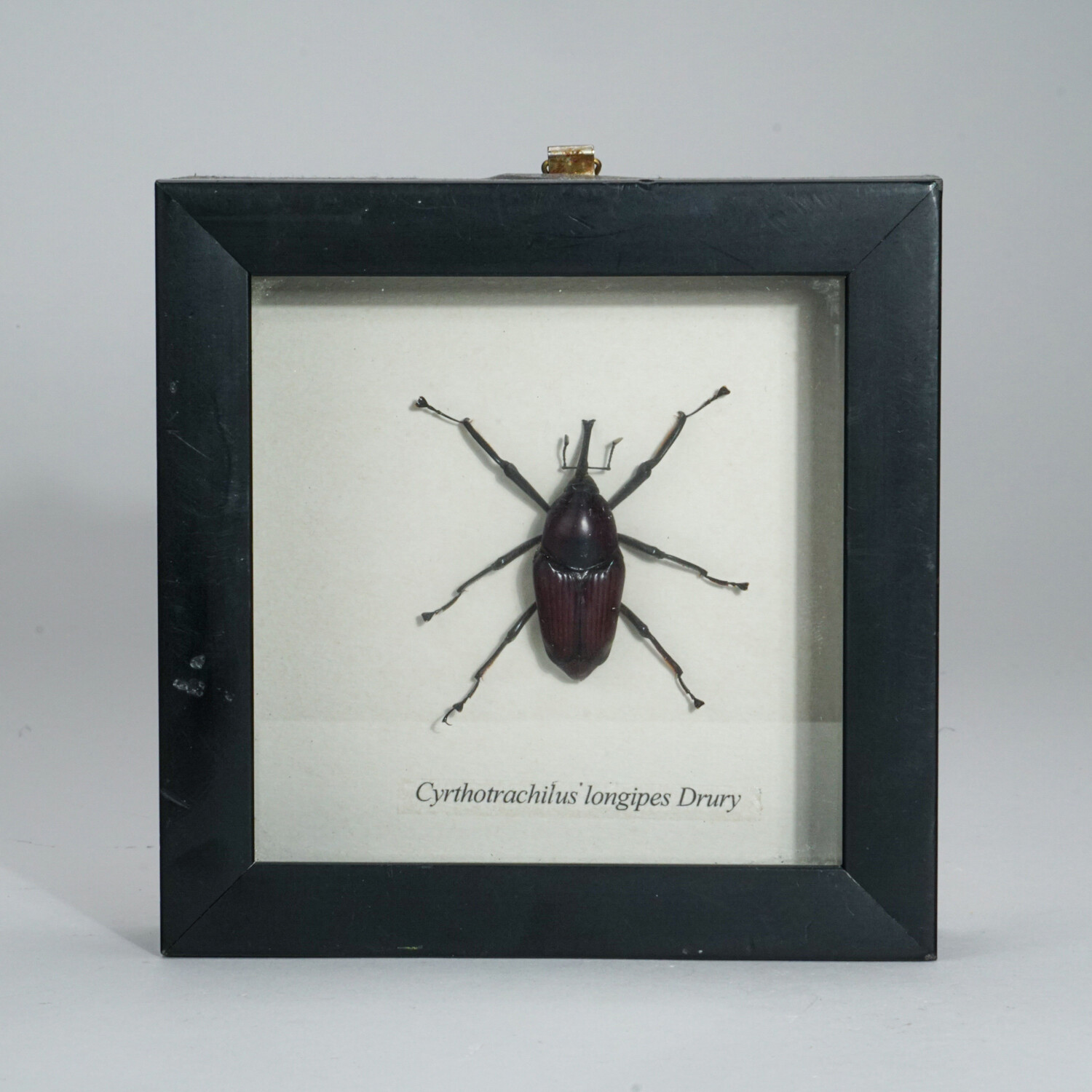 Get a closer look at the intricate details and colors of natural specimens with a display piece unlike any other. This one-of-a-kind piece features a perfectly preserved Weevil presented in a frame with keyhole hook for convenient wall-mounting.