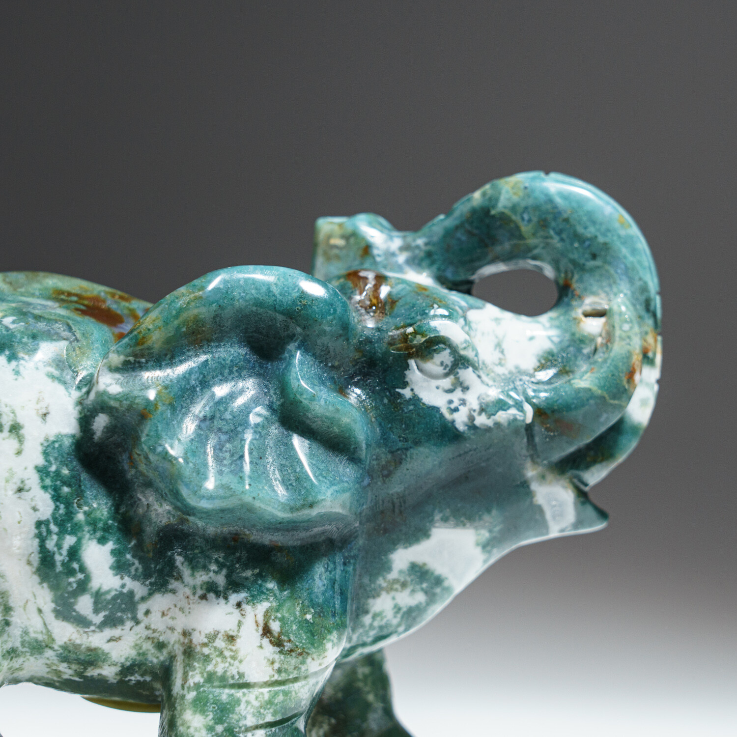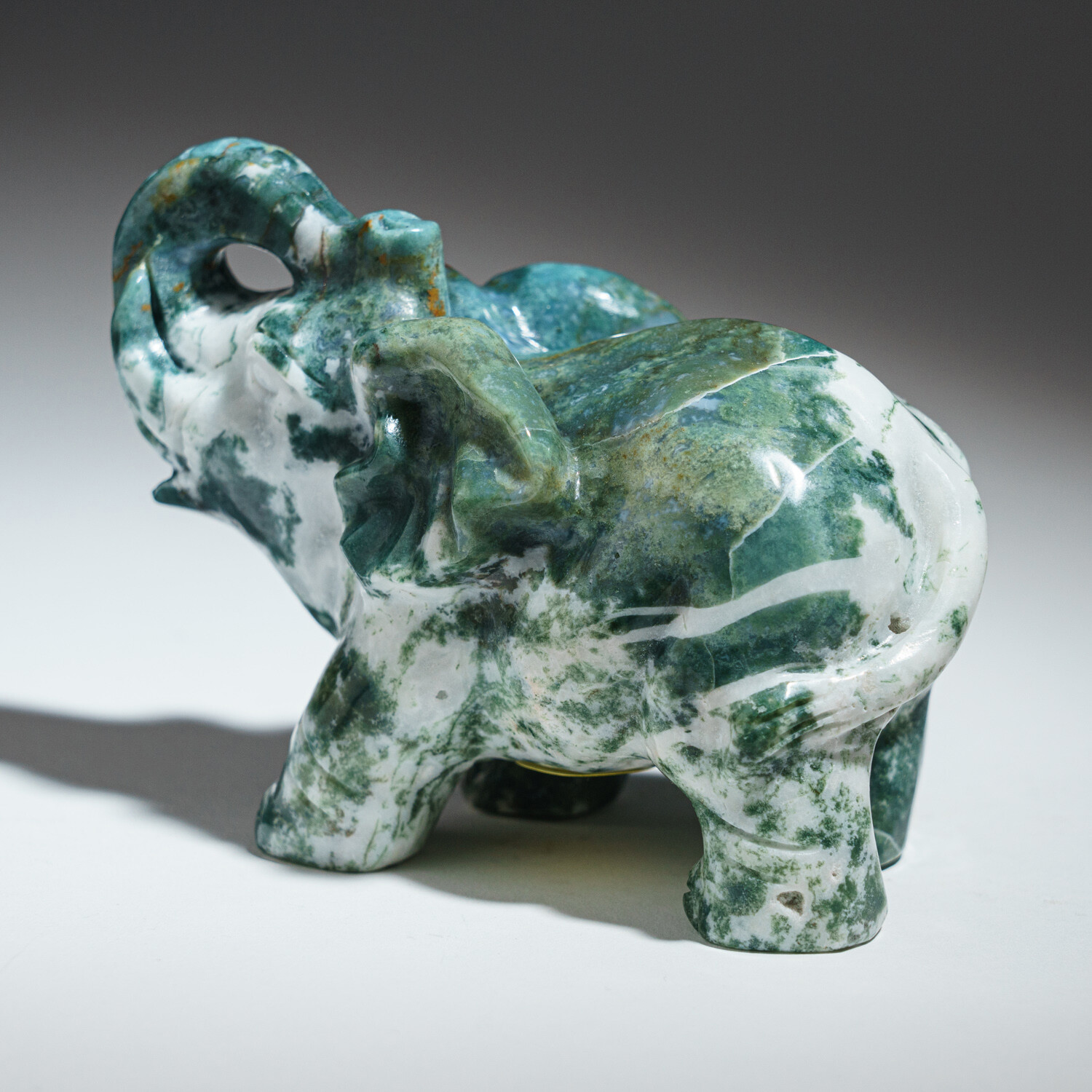 Beautiful elephant statue that is hand carved from a solid piece of white tree moss agate. Elephants are revered symbols in many cultures, as they are the largest living land mammals. In feng shui they represent strength, protection, wisdom, and good luck. A perfect addition to any interior!