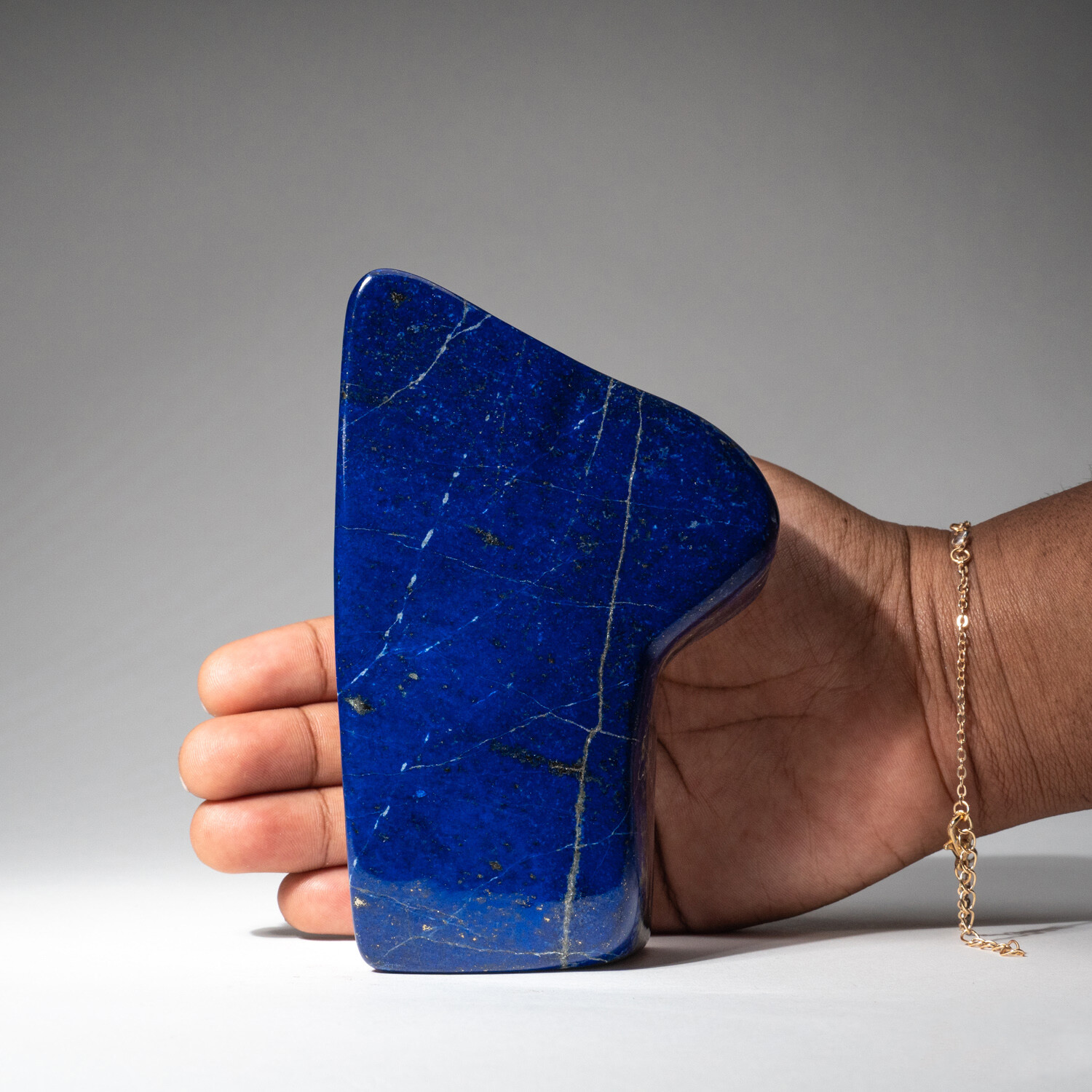 Beautiful hand-polished free form of AAA quality natural Afghani lapis lazuli. This specimen has rich, electric-royal blue color enriched with scintillating pyrite microcrystals.
