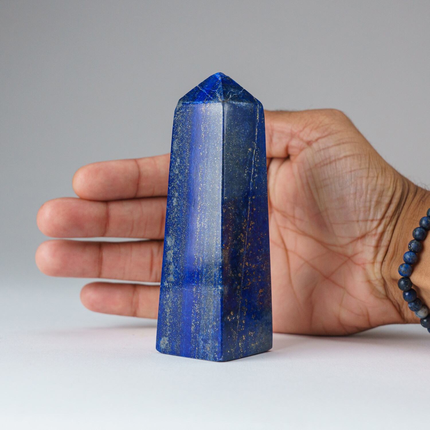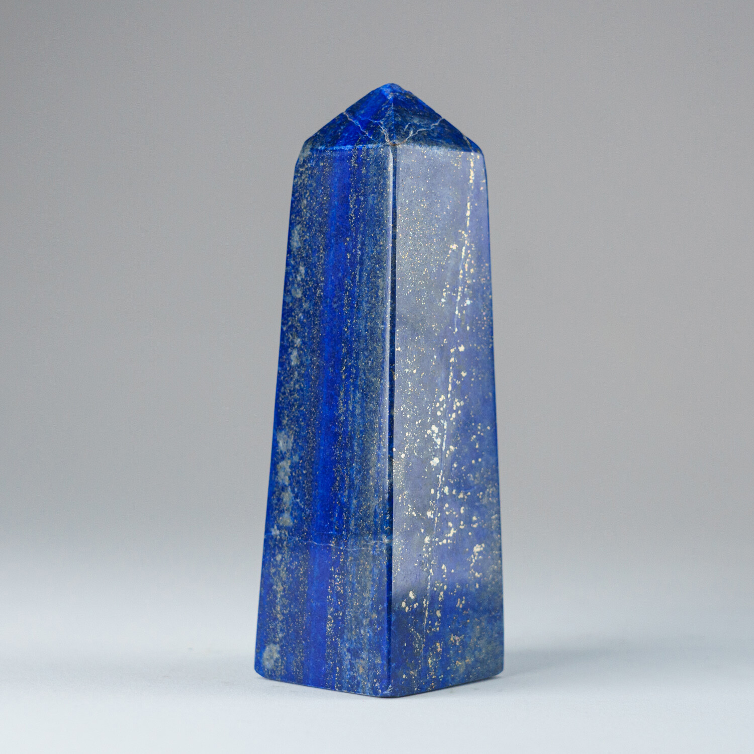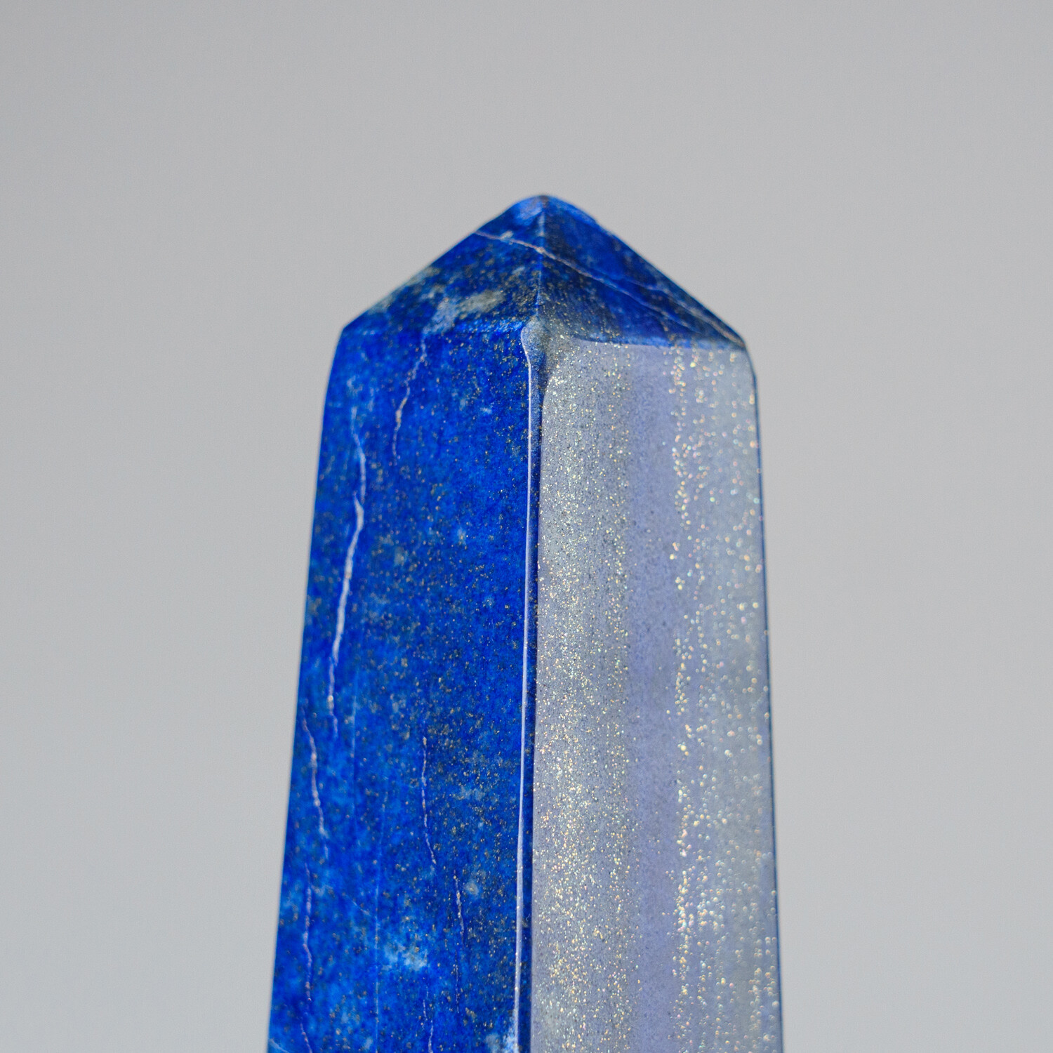 Beautiful hand-polished obelisk of AAA quality natural Afghani lapis lazuli. This specimen has rich, electric-royal blue color enriched with scintillating pyrite microcrystals.