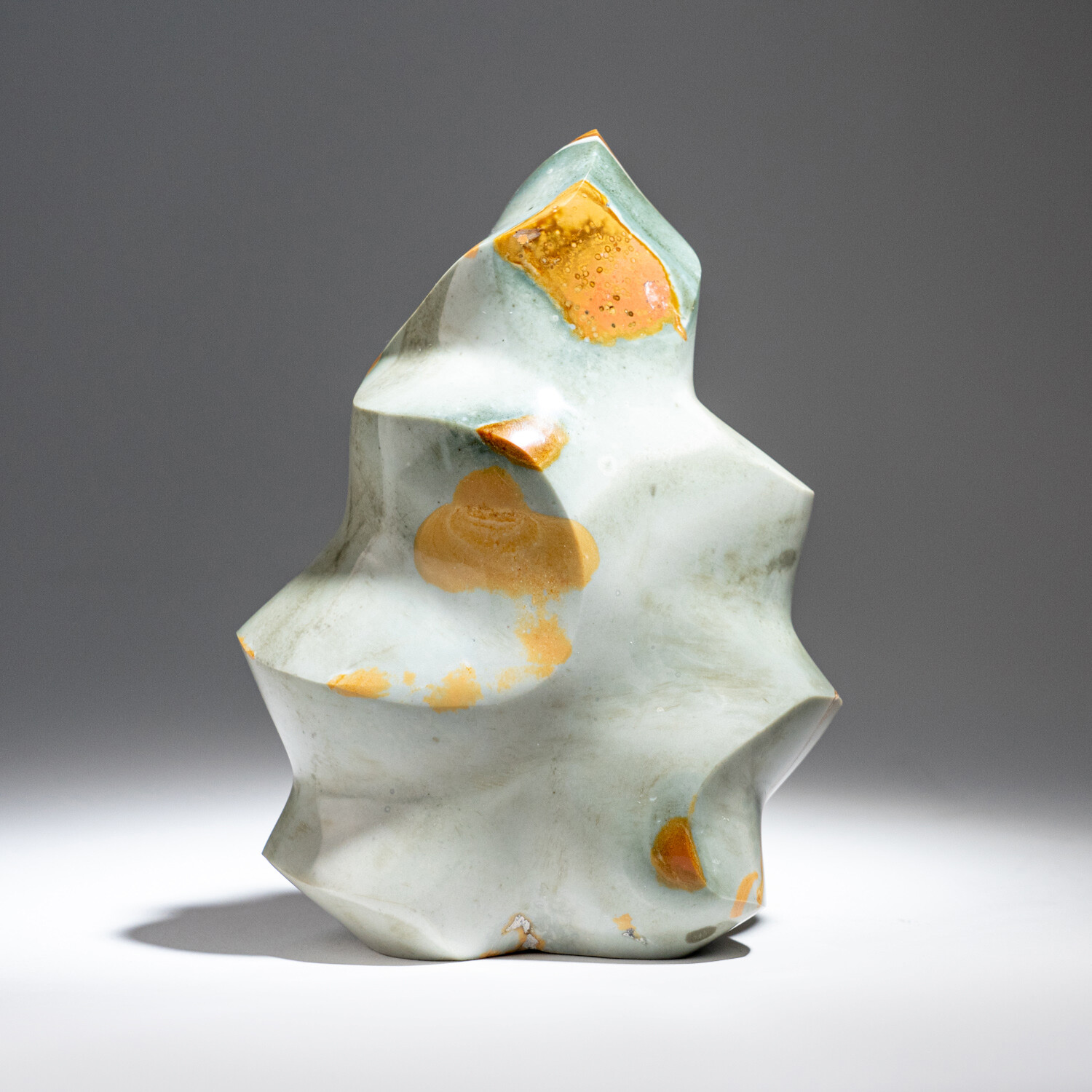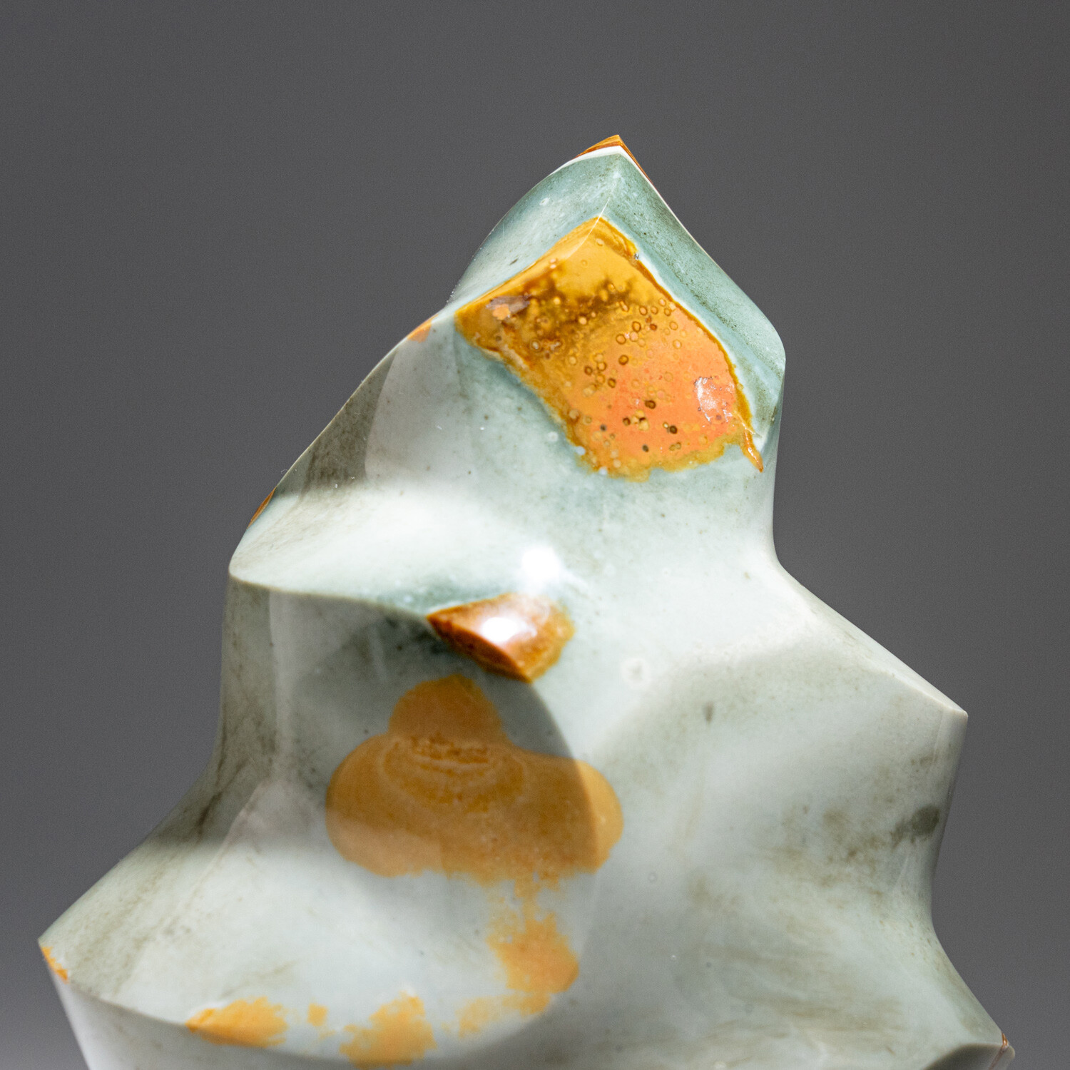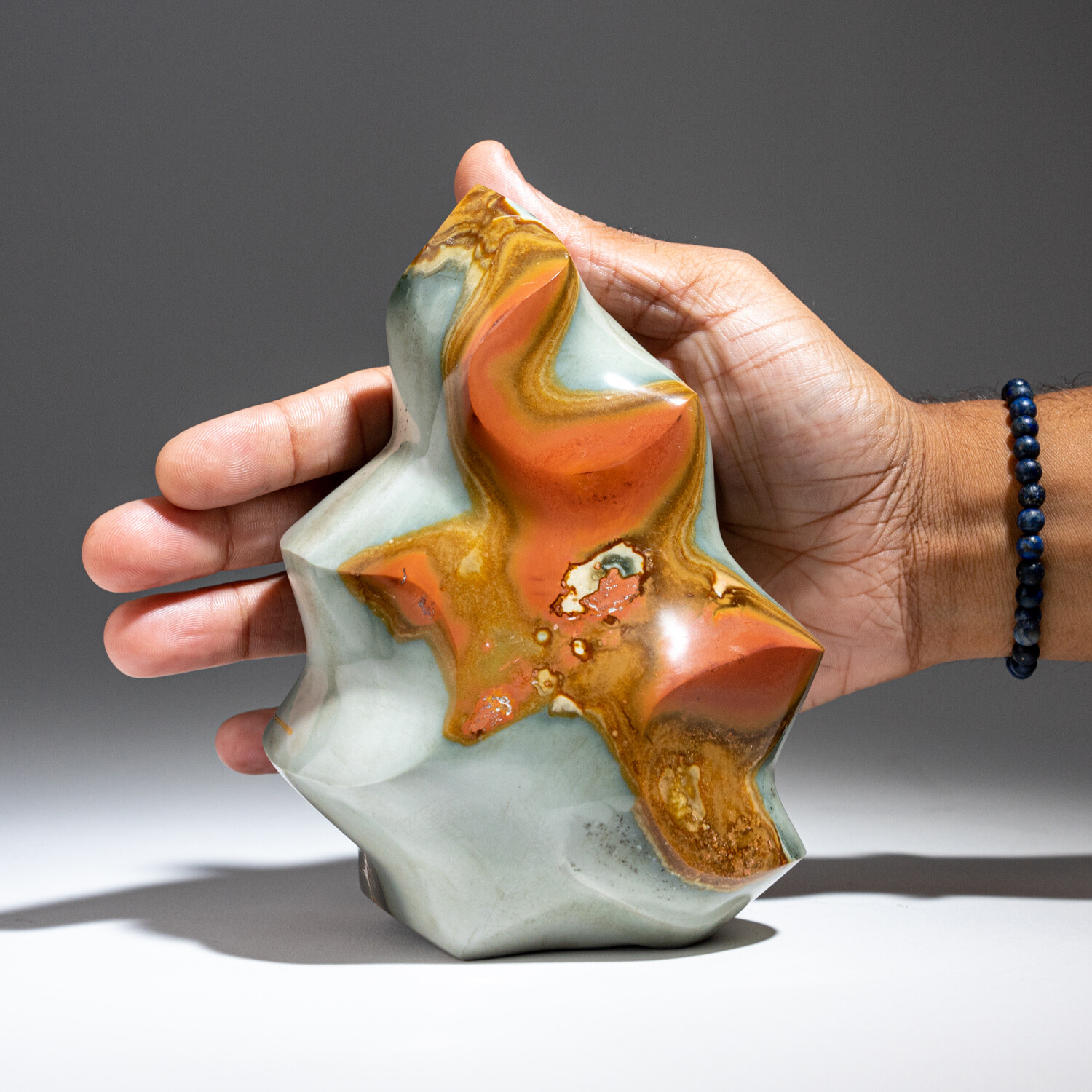 AAA-quality, solid Polychrome Jasper that is hand polished in a flame shape. This beautiful specimen has multi-colored veins of Chalcedony from Madagascar. Beautiful multi-colored rock that usually exhibits a circular, eye-shaped, or figurative pattern. The bright color and size makes this piece perfect as home decor.