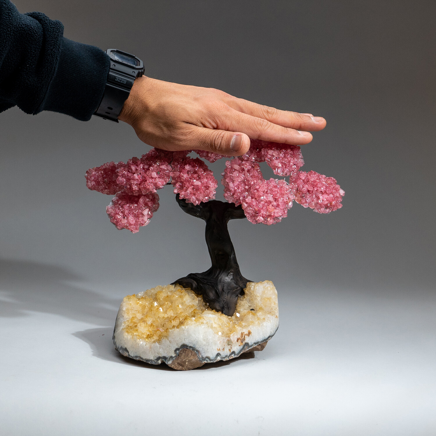 The Comfort Tree is a custom Genuine Rose Quartz clustered gemstone tree with faux tree trunk set on a large Citrine crystal clustered matrix - handmade in Brazil. “The Comfort Tree” makes for a great gift and a beautiful display item in any room.