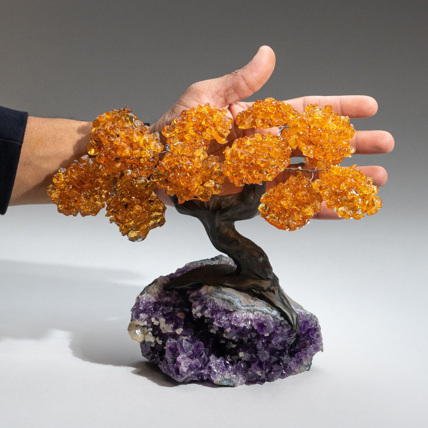 The Money Tree is a genuine Citrine clustered gemstone tree set on an Amethyst crystal cluster-lined matrix. Each tree is individually handcrafted by Brazilian artisans with a faux tree trunk that has been individually designed and hand painted. This stunning, natural accent makes for a great gift and serves as a beautiful display piece in any room.