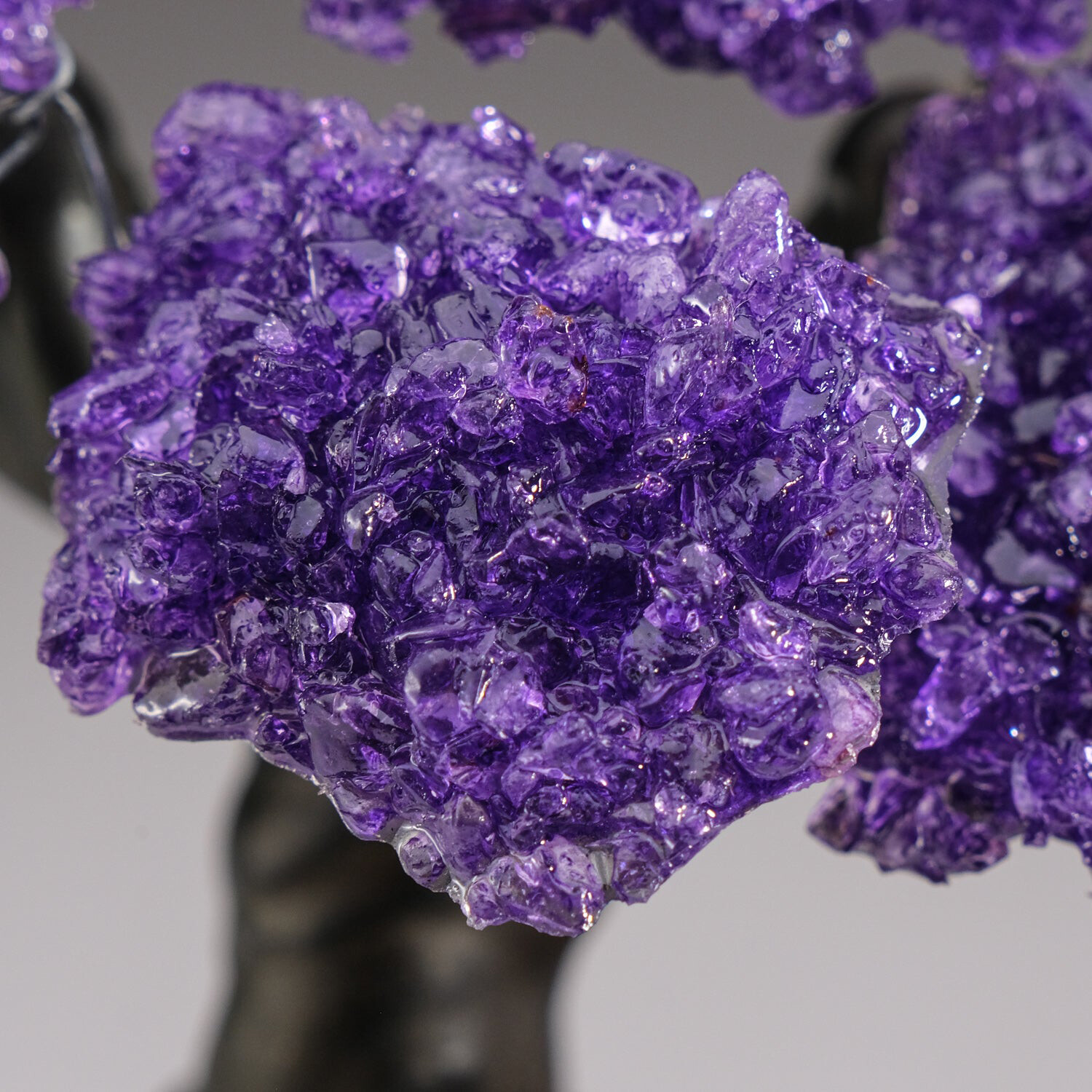 The Protection Tree is a genuine Amethyst clustered gemstone tree set on a large grape purple Amethyst crystal cluster on matrix. Each tree is individually handcrafted by Brazilian artisans with a faux tree trunk that has been individually designed and hand painted. This stunning, natural accent makes for a great gift and serves as a beautiful display piece in any room.