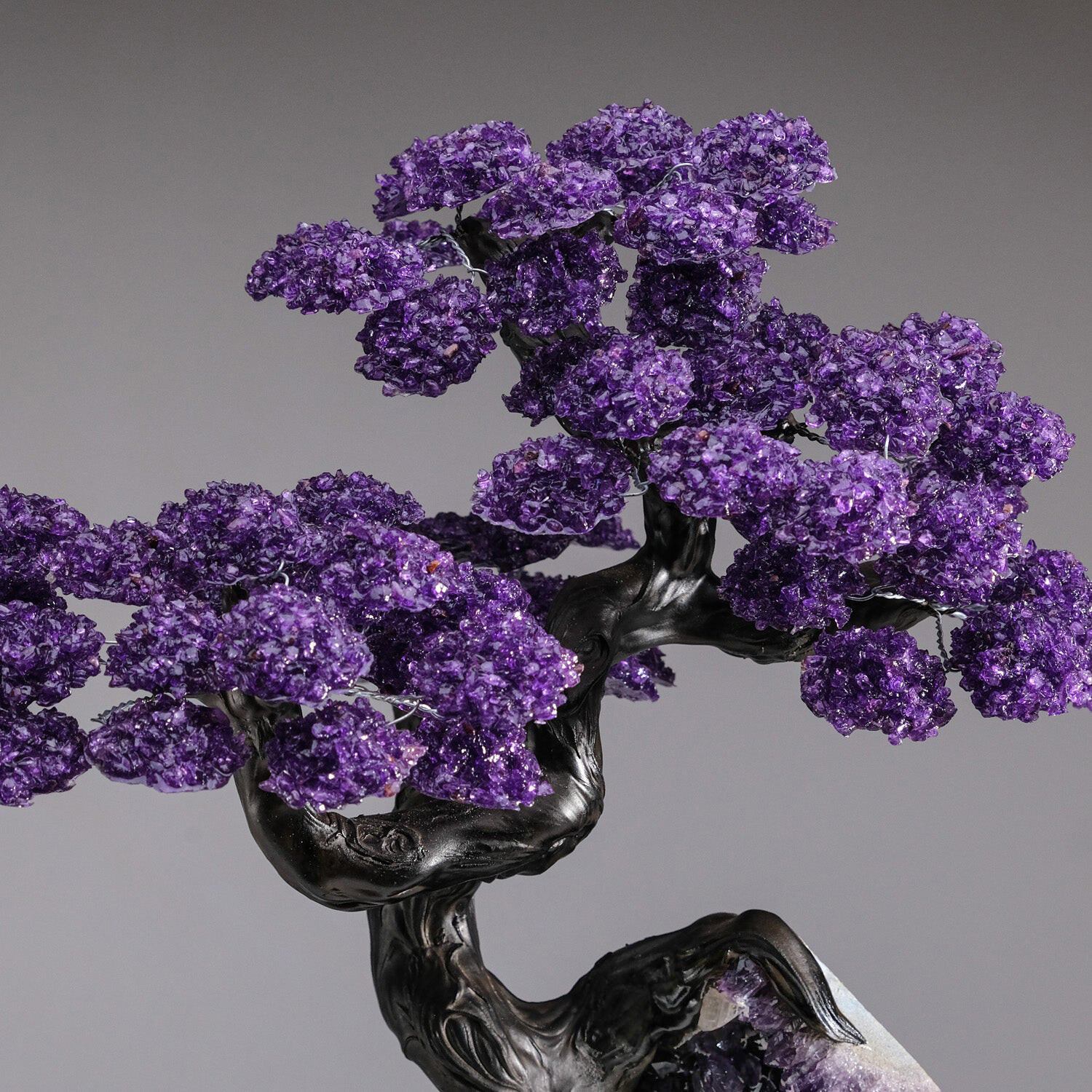 The Protection Tree is a genuine Amethyst clustered gemstone tree set on a large grape purple Amethyst crystal cluster on matrix. Each tree is individually handcrafted by Brazilian artisans with a faux tree trunk that has been individually designed and hand painted. This stunning, natural accent makes for a great gift and serves as a beautiful display piece in any room.