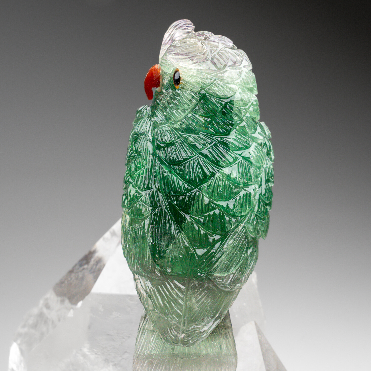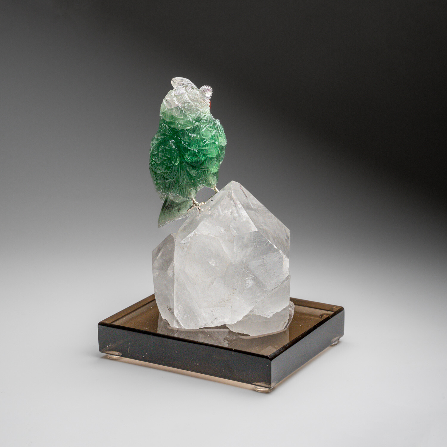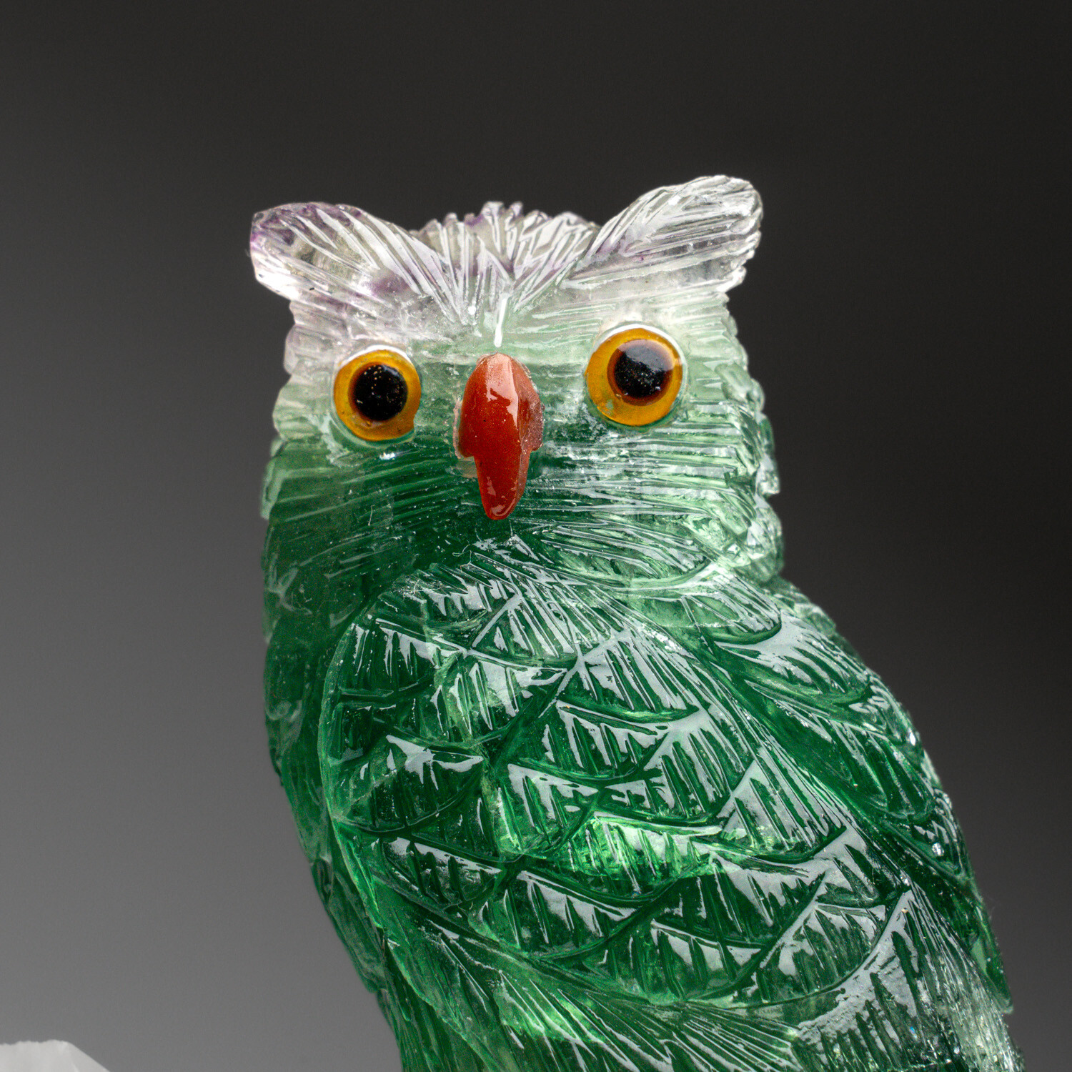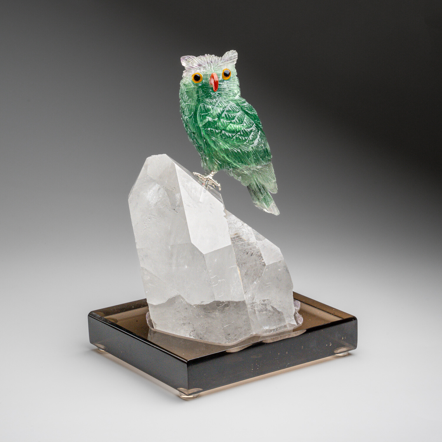 This Owl carving is a unique piece of art, carved from museum-quality fluorite, with onyx eyes and a carnelian beak. The owl is perched atop a clear quartz point and mounted on a custom stand for convenient display. This sculpture is hand-carved and crafted by master artisans.